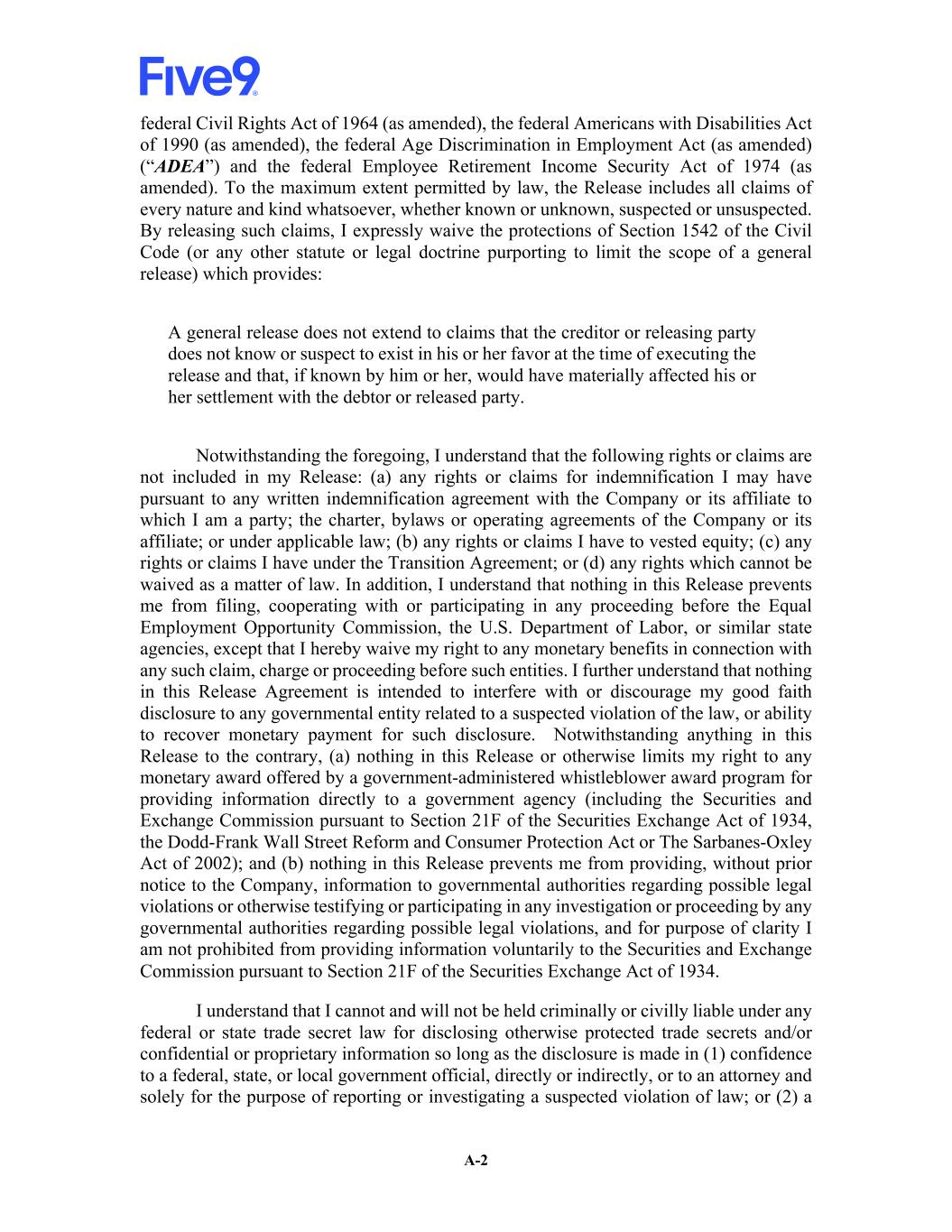 A-2 federal Civil Rights Act of 1964 (as amended), the federal Americans with Disabilities Act of 1990 (as amended), the federal Age Discrimination in Employment Act (as amended) (“ADEA”) and the federal Employee Retirement Income Security Act of 1974 (as amended). To the maximum extent permitted by law, the Release includes all claims of every nature and kind whatsoever, whether known or unknown, suspected or unsuspected. By releasing such claims, I expressly waive the protections of Section 1542 of the Civil Code (or any other statute or legal doctrine purporting to limit the scope of a general release) which provides: A general release does not extend to claims that the creditor or releasing party does not know or suspect to exist in his or her favor at the time of executing the release and that, if known by him or her, would have materially affected his or her settlement with the debtor or released party. Notwithstanding the foregoing, I understand that the following rights or claims are not included in my Release: (a) any rights or claims for indemnification I may have pursuant to any written indemnification agreement with the Company or its affiliate to which I am a party; the charter, bylaws or operating agreements of the Company or its affiliate; or under applicable law; (b) any rights or claims I have to vested equity; (c) any rights or claims I have under the Transition Agreement; or (d) any rights which cannot be waived as a matter of law. In addition, I understand that nothing in this Release prevents me from filing, cooperating with or participating in any proceeding before the Equal Employment Opportunity Commission, the U.S. Department of Labor, or similar state agencies, except that I hereby waive my right to any monetary benefits in connection with any such claim, charge or proceeding before such entities. I further understand that nothing in this Release Agreement is intended to interfere with or discourage my good faith disclosure to any governmental entity related to a suspected violation of the law, or ability to recover monetary payment for such disclosure. Notwithstanding anything in this Release to the contrary, (a) nothing in this Release or otherwise limits my right to any monetary award offered by a government-administered whistleblower award program for providing information directly to a government agency (including the Securities and Exchange Commission pursuant to Section 21F of the Securities Exchange Act of 1934, the Dodd-Frank Wall Street Reform and Consumer Protection Act or The Sarbanes-Oxley Act of 2002); and (b) nothing in this Release prevents me from providing, without prior notice to the Company, information to governmental authorities regarding possible legal violations or otherwise testifying or participating in any investigation or proceeding by any governmental authorities regarding possible legal violations, and for purpose of clarity I am not prohibited from providing information voluntarily to the Securities and Exchange Commission pursuant to Section 21F of the Securities Exchange Act of 1934. I understand that I cannot and will not be held criminally or civilly liable under any federal or state trade secret law for disclosing otherwise protected trade secrets and/or confidential or proprietary information so long as the disclosure is made in (1) confidence to a federal, state, or local government official, directly or indirectly, or to an attorney and solely for the purpose of reporting or investigating a suspected violation of law; or (2) a