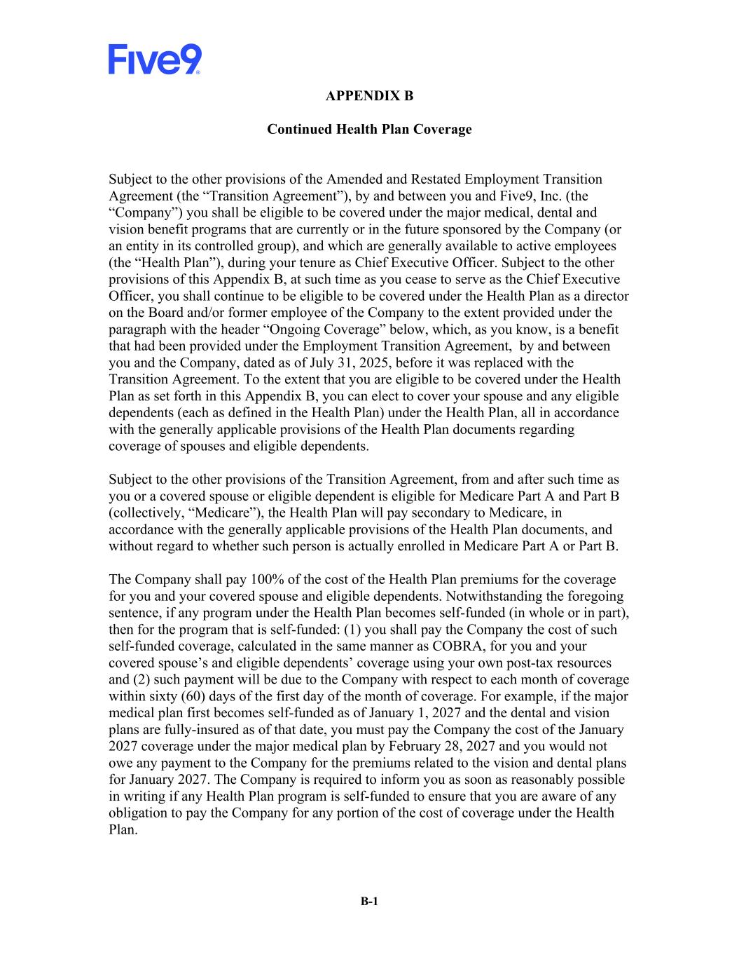 B-1 APPENDIX B Continued Health Plan Coverage Subject to the other provisions of the Amended and Restated Employment Transition Agreement (the “Transition Agreement”), by and between you and Five9, Inc. (the “Company”) you shall be eligible to be covered under the major medical, dental and vision benefit programs that are currently or in the future sponsored by the Company (or an entity in its controlled group), and which are generally available to active employees (the “Health Plan”), during your tenure as Chief Executive Officer. Subject to the other provisions of this Appendix B, at such time as you cease to serve as the Chief Executive Officer, you shall continue to be eligible to be covered under the Health Plan as a director on the Board and/or former employee of the Company to the extent provided under the paragraph with the header “Ongoing Coverage” below, which, as you know, is a benefit that had been provided under the Employment Transition Agreement, by and between you and the Company, dated as of July 31, 2025, before it was replaced with the Transition Agreement. To the extent that you are eligible to be covered under the Health Plan as set forth in this Appendix B, you can elect to cover your spouse and any eligible dependents (each as defined in the Health Plan) under the Health Plan, all in accordance with the generally applicable provisions of the Health Plan documents regarding coverage of spouses and eligible dependents. Subject to the other provisions of the Transition Agreement, from and after such time as you or a covered spouse or eligible dependent is eligible for Medicare Part A and Part B (collectively, “Medicare”), the Health Plan will pay secondary to Medicare, in accordance with the generally applicable provisions of the Health Plan documents, and without regard to whether such person is actually enrolled in Medicare Part A or Part B. The Company shall pay 100% of the cost of the Health Plan premiums for the coverage for you and your covered spouse and eligible dependents. Notwithstanding the foregoing sentence, if any program under the Health Plan becomes self-funded (in whole or in part), then for the program that is self-funded: (1) you shall pay the Company the cost of such self-funded coverage, calculated in the same manner as COBRA, for you and your covered spouse’s and eligible dependents’ coverage using your own post-tax resources and (2) such payment will be due to the Company with respect to each month of coverage within sixty (60) days of the first day of the month of coverage. For example, if the major medical plan first becomes self-funded as of January 1, 2027 and the dental and vision plans are fully-insured as of that date, you must pay the Company the cost of the January 2027 coverage under the major medical plan by February 28, 2027 and you would not owe any payment to the Company for the premiums related to the vision and dental plans for January 2027. The Company is required to inform you as soon as reasonably possible in writing if any Health Plan program is self-funded to ensure that you are aware of any obligation to pay the Company for any portion of the cost of coverage under the Health Plan.