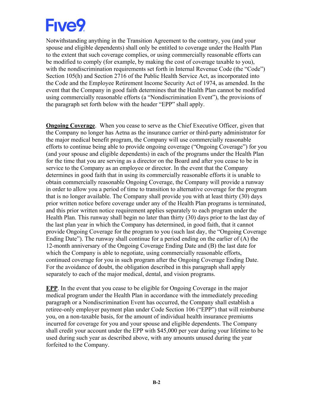 B-2 Notwithstanding anything in the Transition Agreement to the contrary, you (and your spouse and eligible dependents) shall only be entitled to coverage under the Health Plan to the extent that such coverage complies, or using commercially reasonable efforts can be modified to comply (for example, by making the cost of coverage taxable to you), with the nondiscrimination requirements set forth in Internal Revenue Code (the “Code”) Section 105(h) and Section 2716 of the Public Health Service Act, as incorporated into the Code and the Employee Retirement Income Security Act of 1974, as amended. In the event that the Company in good faith determines that the Health Plan cannot be modified using commercially reasonable efforts (a “Nondiscrimination Event”), the provisions of the paragraph set forth below with the header “EPP” shall apply. Ongoing Coverage. When you cease to serve as the Chief Executive Officer, given that the Company no longer has Aetna as the insurance carrier or third-party administrator for the major medical benefit program, the Company will use commercially reasonable efforts to continue being able to provide ongoing coverage (“Ongoing Coverage”) for you (and your spouse and eligible dependents) in each of the programs under the Health Plan for the time that you are serving as a director on the Board and after you cease to be in service to the Company as an employee or director. In the event that the Company determines in good faith that in using its commercially reasonable efforts it is unable to obtain commercially reasonable Ongoing Coverage, the Company will provide a runway in order to allow you a period of time to transition to alternative coverage for the program that is no longer available. The Company shall provide you with at least thirty (30) days prior written notice before coverage under any of the Health Plan programs is terminated, and this prior written notice requirement applies separately to each program under the Health Plan. This runway shall begin no later than thirty (30) days prior to the last day of the last plan year in which the Company has determined, in good faith, that it cannot provide Ongoing Coverage for the program to you (such last day, the “Ongoing Coverage Ending Date”). The runway shall continue for a period ending on the earlier of (A) the 12-month anniversary of the Ongoing Coverage Ending Date and (B) the last date for which the Company is able to negotiate, using commercially reasonable efforts, continued coverage for you in such program after the Ongoing Coverage Ending Date. For the avoidance of doubt, the obligation described in this paragraph shall apply separately to each of the major medical, dental, and vision programs. EPP. In the event that you cease to be eligible for Ongoing Coverage in the major medical program under the Health Plan in accordance with the immediately preceding paragraph or a Nondiscrimination Event has occurred, the Company shall establish a retiree-only employer payment plan under Code Section 106 (“EPP”) that will reimburse you, on a non-taxable basis, for the amount of individual health insurance premiums incurred for coverage for you and your spouse and eligible dependents. The Company shall credit your account under the EPP with $45,000 per year during your lifetime to be used during such year as described above, with any amounts unused during the year forfeited to the Company.