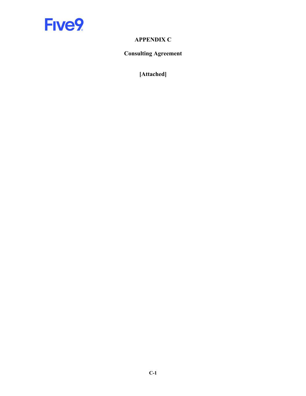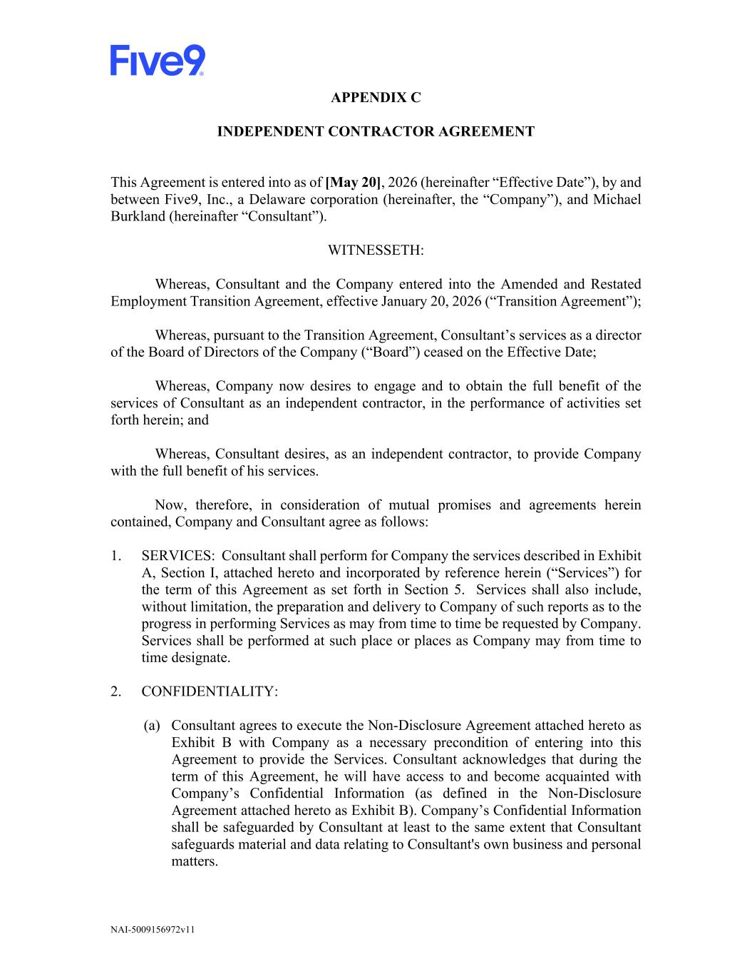 NAI-5009156972v11 APPENDIX C INDEPENDENT CONTRACTOR AGREEMENT This Agreement is entered into as of [May 20], 2026 (hereinafter “Effective Date”), by and between Five9, Inc., a Delaware corporation (hereinafter, the “Company”), and Michael Burkland (hereinafter “Consultant”). WITNESSETH: Whereas, Consultant and the Company entered into the Amended and Restated Employment Transition Agreement, effective January 20, 2026 (“Transition Agreement”); Whereas, pursuant to the Transition Agreement, Consultant’s services as a director of the Board of Directors of the Company (“Board”) ceased on the Effective Date; Whereas, Company now desires to engage and to obtain the full benefit of the services of Consultant as an independent contractor, in the performance of activities set forth herein; and Whereas, Consultant desires, as an independent contractor, to provide Company with the full benefit of his services. Now, therefore, in consideration of mutual promises and agreements herein contained, Company and Consultant agree as follows: 1. SERVICES: Consultant shall perform for Company the services described in Exhibit A, Section I, attached hereto and incorporated by reference herein (“Services”) for the term of this Agreement as set forth in Section 5. Services shall also include, without limitation, the preparation and delivery to Company of such reports as to the progress in performing Services as may from time to time be requested by Company. Services shall be performed at such place or places as Company may from time to time designate. 2. CONFIDENTIALITY: (a) Consultant agrees to execute the Non-Disclosure Agreement attached hereto as Exhibit B with Company as a necessary precondition of entering into this Agreement to provide the Services. Consultant acknowledges that during the term of this Agreement, he will have access to and become acquainted with Company’s Confidential Information (as defined in the Non-Disclosure Agreement attached hereto as Exhibit B). Company’s Confidential Information shall be safeguarded by Consultant at least to the same extent that Consultant safeguards material and data relating to Consultant's own business and personal matters.