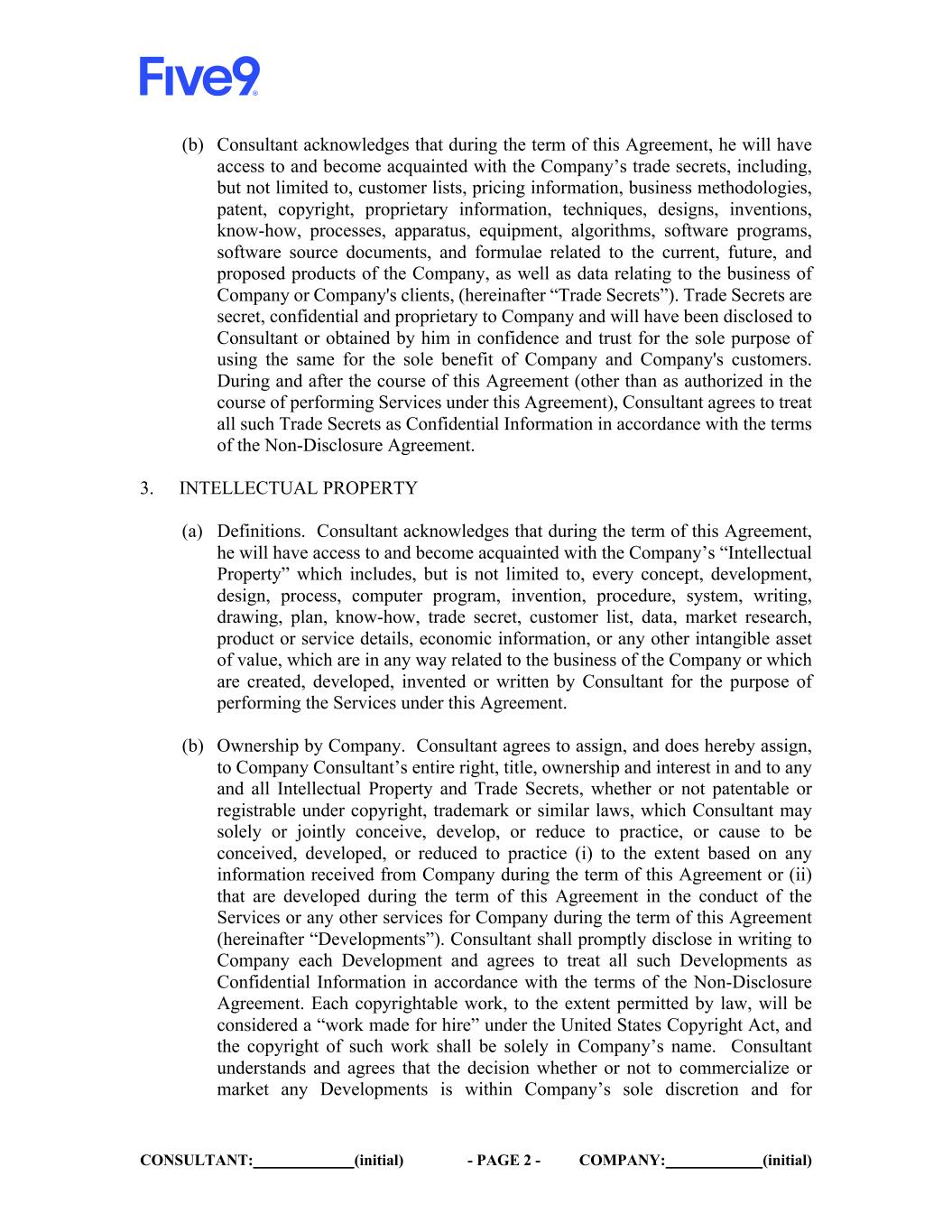 CONSULTANT: (initial) - PAGE 2 - COMPANY: (initial) (b) Consultant acknowledges that during the term of this Agreement, he will have access to and become acquainted with the Company’s trade secrets, including, but not limited to, customer lists, pricing information, business methodologies, patent, copyright, proprietary information, techniques, designs, inventions, know-how, processes, apparatus, equipment, algorithms, software programs, software source documents, and formulae related to the current, future, and proposed products of the Company, as well as data relating to the business of Company or Company's clients, (hereinafter “Trade Secrets”). Trade Secrets are secret, confidential and proprietary to Company and will have been disclosed to Consultant or obtained by him in confidence and trust for the sole purpose of using the same for the sole benefit of Company and Company's customers. During and after the course of this Agreement (other than as authorized in the course of performing Services under this Agreement), Consultant agrees to treat all such Trade Secrets as Confidential Information in accordance with the terms of the Non-Disclosure Agreement. 3. INTELLECTUAL PROPERTY (a) Definitions. Consultant acknowledges that during the term of this Agreement, he will have access to and become acquainted with the Company’s “Intellectual Property” which includes, but is not limited to, every concept, development, design, process, computer program, invention, procedure, system, writing, drawing, plan, know-how, trade secret, customer list, data, market research, product or service details, economic information, or any other intangible asset of value, which are in any way related to the business of the Company or which are created, developed, invented or written by Consultant for the purpose of performing the Services under this Agreement. (b) Ownership by Company. Consultant agrees to assign, and does hereby assign, to Company Consultant’s entire right, title, ownership and interest in and to any and all Intellectual Property and Trade Secrets, whether or not patentable or registrable under copyright, trademark or similar laws, which Consultant may solely or jointly conceive, develop, or reduce to practice, or cause to be conceived, developed, or reduced to practice (i) to the extent based on any information received from Company during the term of this Agreement or (ii) that are developed during the term of this Agreement in the conduct of the Services or any other services for Company during the term of this Agreement (hereinafter “Developments”). Consultant shall promptly disclose in writing to Company each Development and agrees to treat all such Developments as Confidential Information in accordance with the terms of the Non-Disclosure Agreement. Each copyrightable work, to the extent permitted by law, will be considered a “work made for hire” under the United States Copyright Act, and the copyright of such work shall be solely in Company’s name. Consultant understands and agrees that the decision whether or not to commercialize or market any Developments is within Company’s sole discretion and for