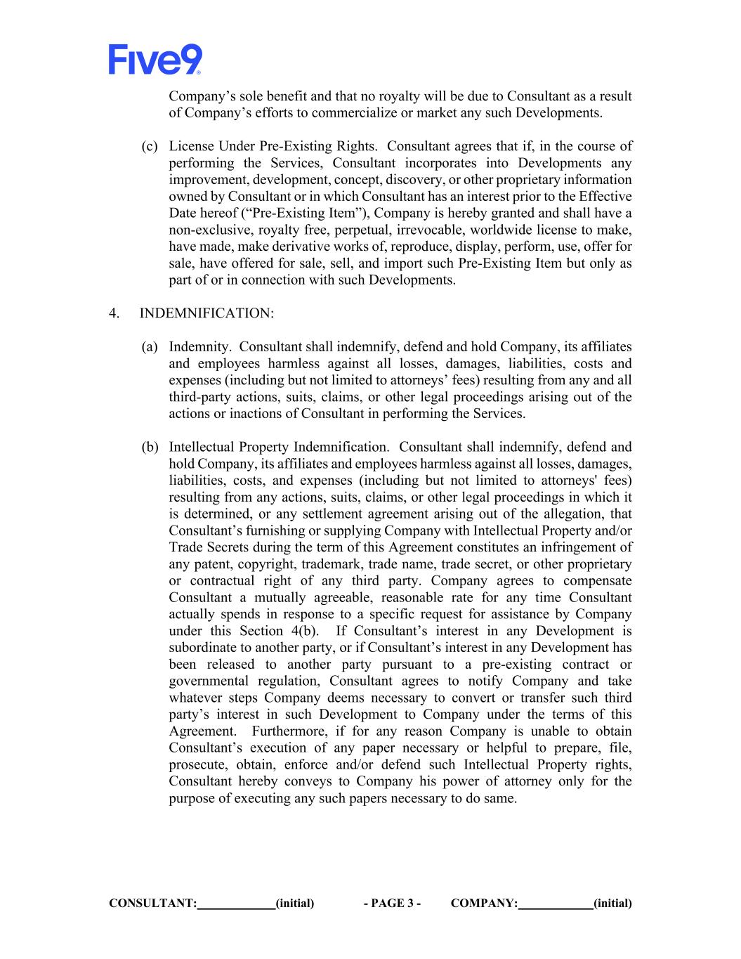 CONSULTANT: (initial) - PAGE 3 - COMPANY: (initial) Company’s sole benefit and that no royalty will be due to Consultant as a result of Company’s efforts to commercialize or market any such Developments. (c) License Under Pre-Existing Rights. Consultant agrees that if, in the course of performing the Services, Consultant incorporates into Developments any improvement, development, concept, discovery, or other proprietary information owned by Consultant or in which Consultant has an interest prior to the Effective Date hereof (“Pre-Existing Item”), Company is hereby granted and shall have a non-exclusive, royalty free, perpetual, irrevocable, worldwide license to make, have made, make derivative works of, reproduce, display, perform, use, offer for sale, have offered for sale, sell, and import such Pre-Existing Item but only as part of or in connection with such Developments. 4. INDEMNIFICATION: (a) Indemnity. Consultant shall indemnify, defend and hold Company, its affiliates and employees harmless against all losses, damages, liabilities, costs and expenses (including but not limited to attorneys’ fees) resulting from any and all third-party actions, suits, claims, or other legal proceedings arising out of the actions or inactions of Consultant in performing the Services. (b) Intellectual Property Indemnification. Consultant shall indemnify, defend and hold Company, its affiliates and employees harmless against all losses, damages, liabilities, costs, and expenses (including but not limited to attorneys' fees) resulting from any actions, suits, claims, or other legal proceedings in which it is determined, or any settlement agreement arising out of the allegation, that Consultant’s furnishing or supplying Company with Intellectual Property and/or Trade Secrets during the term of this Agreement constitutes an infringement of any patent, copyright, trademark, trade name, trade secret, or other proprietary or contractual right of any third party. Company agrees to compensate Consultant a mutually agreeable, reasonable rate for any time Consultant actually spends in response to a specific request for assistance by Company under this Section 4(b). If Consultant’s interest in any Development is subordinate to another party, or if Consultant’s interest in any Development has been released to another party pursuant to a pre-existing contract or governmental regulation, Consultant agrees to notify Company and take whatever steps Company deems necessary to convert or transfer such third party’s interest in such Development to Company under the terms of this Agreement. Furthermore, if for any reason Company is unable to obtain Consultant’s execution of any paper necessary or helpful to prepare, file, prosecute, obtain, enforce and/or defend such Intellectual Property rights, Consultant hereby conveys to Company his power of attorney only for the purpose of executing any such papers necessary to do same.