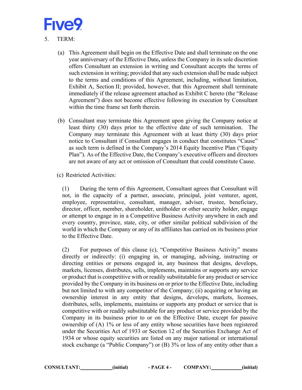 CONSULTANT: (initial) - PAGE 4 - COMPANY: (initial) 5. TERM: (a) This Agreement shall begin on the Effective Date and shall terminate on the one year anniversary of the Effective Date, unless the Company in its sole discretion offers Consultant an extension in writing and Consultant accepts the terms of such extension in writing; provided that any such extension shall be made subject to the terms and conditions of this Agreement, including, without limitation, Exhibit A, Section II; provided, however, that this Agreement shall terminate immediately if the release agreement attached as Exhibit C hereto (the “Release Agreement”) does not become effective following its execution by Consultant within the time frame set forth therein. (b) Consultant may terminate this Agreement upon giving the Company notice at least thirty (30) days prior to the effective date of such termination. The Company may terminate this Agreement with at least thirty (30) days prior notice to Consultant if Consultant engages in conduct that constitutes “Cause” as such term is defined in the Company’s 2014 Equity Incentive Plan (“Equity Plan”). As of the Effective Date, the Company’s executive officers and directors are not aware of any act or omission of Consultant that could constitute Cause. (c) Restricted Activities: (1) During the term of this Agreement, Consultant agrees that Consultant will not, in the capacity of a partner, associate, principal, joint venturer, agent, employee, representative, consultant, manager, adviser, trustee, beneficiary, director, officer, member, shareholder, unitholder or other security holder, engage or attempt to engage in in a Competitive Business Activity anywhere in each and every country, province, state, city, or other similar political subdivision of the world in which the Company or any of its affiliates has carried on its business prior to the Effective Date. (2) For purposes of this clause (c), “Competitive Business Activity” means directly or indirectly: (i) engaging in, or managing, advising, instructing or directing entities or persons engaged in, any business that designs, develops, markets, licenses, distributes, sells, implements, maintains or supports any service or product that is competitive with or readily substitutable for any product or service provided by the Company in its business on or prior to the Effective Date, including but not limited to with any competitor of the Company; (ii) acquiring or having an ownership interest in any entity that designs, develops, markets, licenses, distributes, sells, implements, maintains or supports any product or service that is competitive with or readily substitutable for any product or service provided by the Company in its business prior to or on the Effective Date, except for passive ownership of (A) 1% or less of any entity whose securities have been registered under the Securities Act of 1933 or Section 12 of the Securities Exchange Act of 1934 or whose equity securities are listed on any major national or international stock exchange (a “Public Company”) or (B) 3% or less of any entity other than a