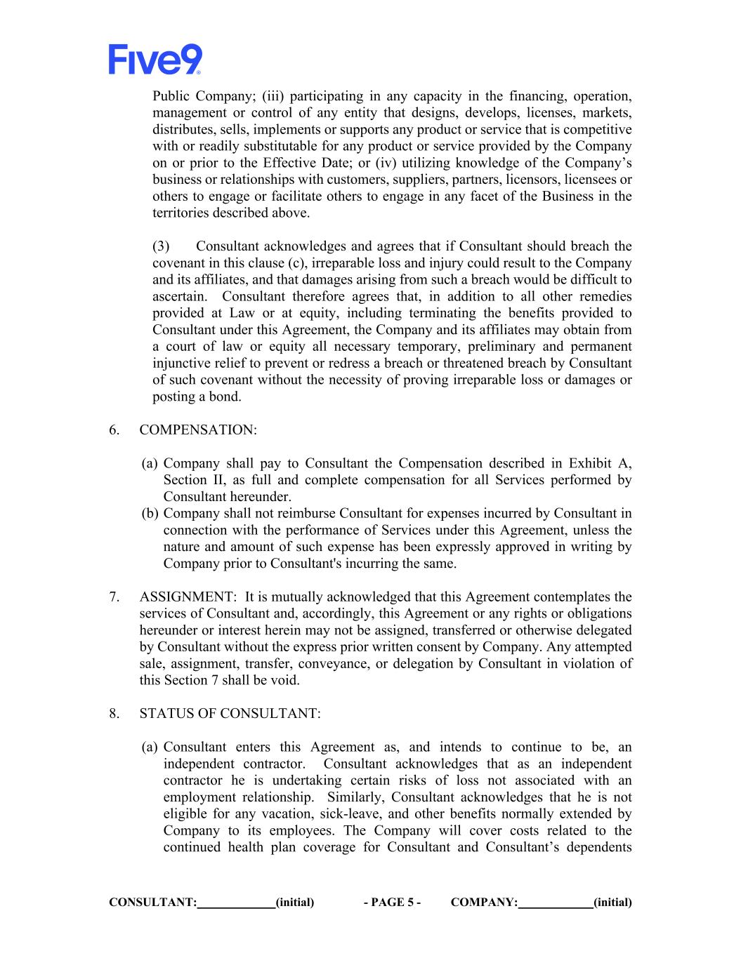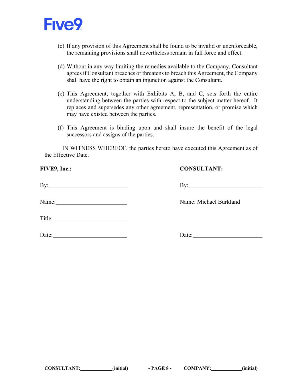 CONSULTANT: (initial) - PAGE 8 - COMPANY: (initial) (c) If any provision of this Agreement shall be found to be invalid or unenforceable, the remaining provisions shall nevertheless remain in full force and effect. (d) Without in any way limiting the remedies available to the Company, Consultant agrees if Consultant breaches or threatens to breach this Agreement, the Company shall have the right to obtain an injunction against the Consultant. (e) This Agreement, together with Exhibits A, B, and C, sets forth the entire understanding between the parties with respect to the subject matter hereof. It replaces and supersedes any other agreement, representation, or promise which may have existed between the parties. (f) This Agreement is binding upon and shall insure the benefit of the legal successors and assigns of the parties. IN WITNESS WHEREOF, the parties hereto have executed this Agreement as of the Effective Date. FIVE9, Inc.: CONSULTANT: By: By: Name: Name: Michael Burkland Title: Date: Date: