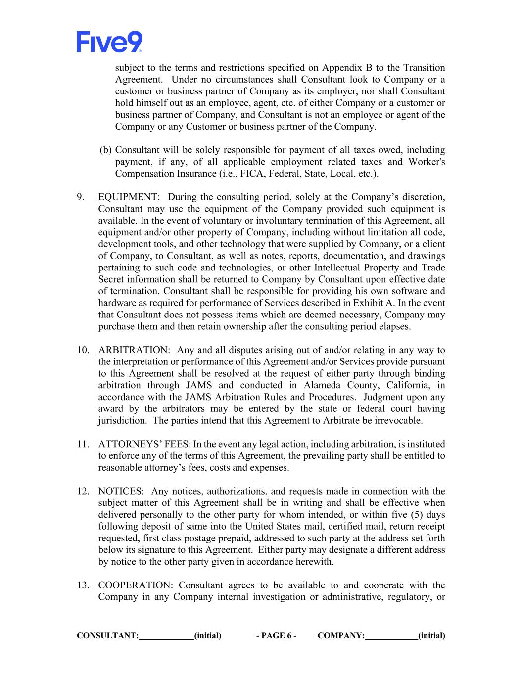 CONSULTANT: (initial) - PAGE 6 - COMPANY: (initial) subject to the terms and restrictions specified on Appendix B to the Transition Agreement. Under no circumstances shall Consultant look to Company or a customer or business partner of Company as its employer, nor shall Consultant hold himself out as an employee, agent, etc. of either Company or a customer or business partner of Company, and Consultant is not an employee or agent of the Company or any Customer or business partner of the Company. (b) Consultant will be solely responsible for payment of all taxes owed, including payment, if any, of all applicable employment related taxes and Worker's Compensation Insurance (i.e., FICA, Federal, State, Local, etc.). 9. EQUIPMENT: During the consulting period, solely at the Company’s discretion, Consultant may use the equipment of the Company provided such equipment is available. In the event of voluntary or involuntary termination of this Agreement, all equipment and/or other property of Company, including without limitation all code, development tools, and other technology that were supplied by Company, or a client of Company, to Consultant, as well as notes, reports, documentation, and drawings pertaining to such code and technologies, or other Intellectual Property and Trade Secret information shall be returned to Company by Consultant upon effective date of termination. Consultant shall be responsible for providing his own software and hardware as required for performance of Services described in Exhibit A. In the event that Consultant does not possess items which are deemed necessary, Company may purchase them and then retain ownership after the consulting period elapses. 10. ARBITRATION: Any and all disputes arising out of and/or relating in any way to the interpretation or performance of this Agreement and/or Services provide pursuant to this Agreement shall be resolved at the request of either party through binding arbitration through JAMS and conducted in Alameda County, California, in accordance with the JAMS Arbitration Rules and Procedures. Judgment upon any award by the arbitrators may be entered by the state or federal court having jurisdiction. The parties intend that this Agreement to Arbitrate be irrevocable. 11. ATTORNEYS’ FEES: In the event any legal action, including arbitration, is instituted to enforce any of the terms of this Agreement, the prevailing party shall be entitled to reasonable attorney’s fees, costs and expenses. 12. NOTICES: Any notices, authorizations, and requests made in connection with the subject matter of this Agreement shall be in writing and shall be effective when delivered personally to the other party for whom intended, or within five (5) days following deposit of same into the United States mail, certified mail, return receipt requested, first class postage prepaid, addressed to such party at the address set forth below its signature to this Agreement. Either party may designate a different address by notice to the other party given in accordance herewith. 13. COOPERATION: Consultant agrees to be available to and cooperate with the Company in any Company internal investigation or administrative, regulatory, or