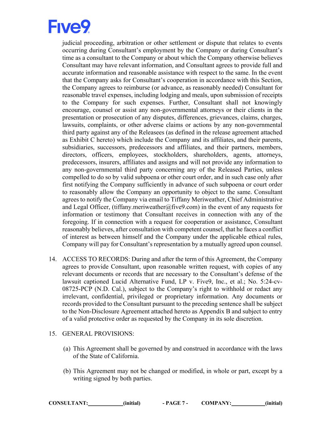 CONSULTANT: (initial) - PAGE 7 - COMPANY: (initial) judicial proceeding, arbitration or other settlement or dispute that relates to events occurring during Consultant’s employment by the Company or during Consultant’s time as a consultant to the Company or about which the Company otherwise believes Consultant may have relevant information, and Consultant agrees to provide full and accurate information and reasonable assistance with respect to the same. In the event that the Company asks for Consultant’s cooperation in accordance with this Section, the Company agrees to reimburse (or advance, as reasonably needed) Consultant for reasonable travel expenses, including lodging and meals, upon submission of receipts to the Company for such expenses. Further, Consultant shall not knowingly encourage, counsel or assist any non-governmental attorneys or their clients in the presentation or prosecution of any disputes, differences, grievances, claims, charges, lawsuits, complaints, or other adverse claims or actions by any non-governmental third party against any of the Releasees (as defined in the release agreement attached as Exhibit C hereto) which include the Company and its affiliates, and their parents, subsidiaries, successors, predecessors and affiliates, and their partners, members, directors, officers, employees, stockholders, shareholders, agents, attorneys, predecessors, insurers, affiliates and assigns and will not provide any information to any non-governmental third party concerning any of the Released Parties, unless compelled to do so by valid subpoena or other court order, and in such case only after first notifying the Company sufficiently in advance of such subpoena or court order to reasonably allow the Company an opportunity to object to the same. Consultant agrees to notify the Company via email to Tiffany Meriweather, Chief Administrative and Legal Officer, (tiffany.meriweather@five9.com) in the event of any requests for information or testimony that Consultant receives in connection with any of the foregoing. If in connection with a request for cooperation or assistance, Consultant reasonably believes, after consultation with competent counsel, that he faces a conflict of interest as between himself and the Company under the applicable ethical rules, Company will pay for Consultant’s representation by a mutually agreed upon counsel. 14. ACCESS TO RECORDS: During and after the term of this Agreement, the Company agrees to provide Consultant, upon reasonable written request, with copies of any relevant documents or records that are necessary to the Consultant’s defense of the lawsuit captioned Lucid Alternative Fund, LP v. Five9, Inc., et al.; No. 5:24-cv- 08725-PCP (N.D. Cal.), subject to the Company’s right to withhold or redact any irrelevant, confidential, privileged or proprietary information. Any documents or records provided to the Consultant pursuant to the preceding sentence shall be subject to the Non-Disclosure Agreement attached hereto as Appendix B and subject to entry of a valid protective order as requested by the Company in its sole discretion. 15. GENERAL PROVISIONS: (a) This Agreement shall be governed by and construed in accordance with the laws of the State of California. (b) This Agreement may not be changed or modified, in whole or part, except by a writing signed by both parties.