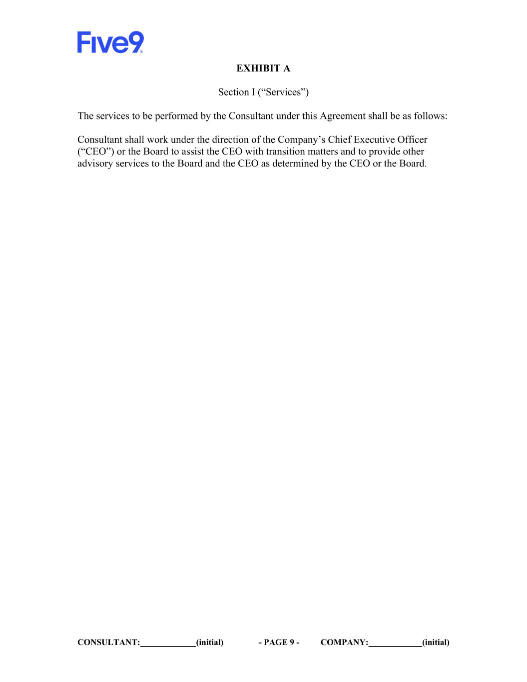 CONSULTANT: (initial) - PAGE 9 - COMPANY: (initial) EXHIBIT A Section I (“Services”) The services to be performed by the Consultant under this Agreement shall be as follows: Consultant shall work under the direction of the Company’s Chief Executive Officer (“CEO”) or the Board to assist the CEO with transition matters and to provide other advisory services to the Board and the CEO as determined by the CEO or the Board.