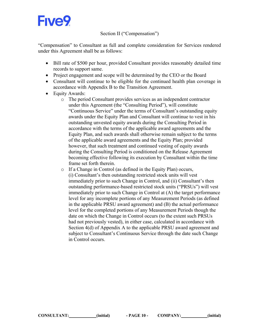 CONSULTANT: (initial) - PAGE 10 - COMPANY: (initial) Section II (“Compensation”) “Compensation” to Consultant as full and complete consideration for Services rendered under this Agreement shall be as follows: • Bill rate of $500 per hour, provided Consultant provides reasonably detailed time records to support same. • Project engagement and scope will be determined by the CEO or the Board • Consultant will continue to be eligible for the continued health plan coverage in accordance with Appendix B to the Transition Agreement. • Equity Awards: o The period Consultant provides services as an independent contractor under this Agreement (the “Consulting Period”), will constitute “Continuous Service” under the terms of Consultant’s outstanding equity awards under the Equity Plan and Consultant will continue to vest in his outstanding unvested equity awards during the Consulting Period in accordance with the terms of the applicable award agreements and the Equity Plan, and such awards shall otherwise remain subject to the terms of the applicable award agreements and the Equity Plan; provided however, that such treatment and continued vesting of equity awards during the Consulting Period is conditioned on the Release Agreement becoming effective following its execution by Consultant within the time frame set forth therein. o If a Change in Control (as defined in the Equity Plan) occurs, (i) Consultant’s then outstanding restricted stock units will vest immediately prior to such Change in Control, and (ii) Consultant’s then outstanding performance-based restricted stock units (“PRSUs”) will vest immediately prior to such Change in Control at (A) the target performance level for any incomplete portions of any Measurement Periods (as defined in the applicable PRSU award agreement) and (B) the actual performance level for the completed portions of any Measurement Periods though the date on which the Change in Control occurs (to the extent such PRSUs had not previously vested), in either case, calculated in accordance with Section 4(d) of Appendix A to the applicable PRSU award agreement and subject to Consultant’s Continuous Service through the date such Change in Control occurs.