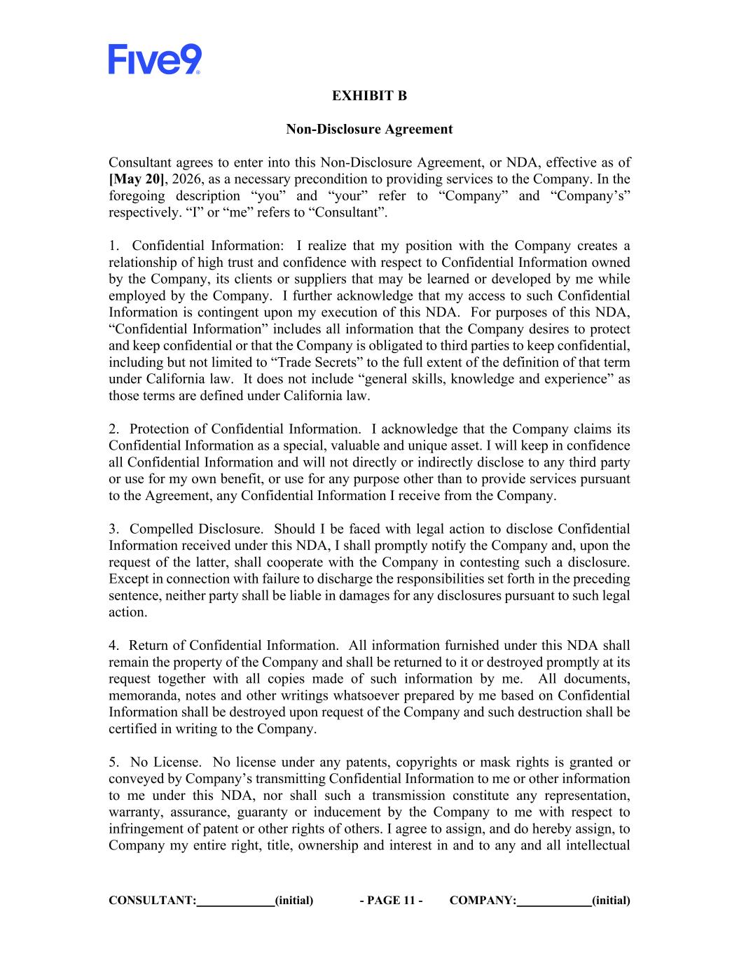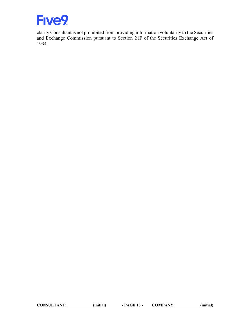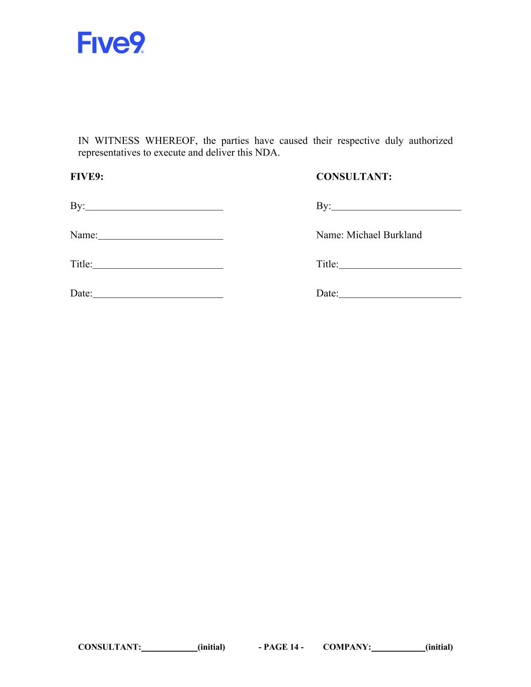 CONSULTANT: (initial) - PAGE 14 - COMPANY: (initial) IN WITNESS WHEREOF, the parties have caused their respective duly authorized representatives to execute and deliver this NDA. FIVE9: CONSULTANT: By: By: Name: Name: Michael Burkland Title: Title: Date: Date: