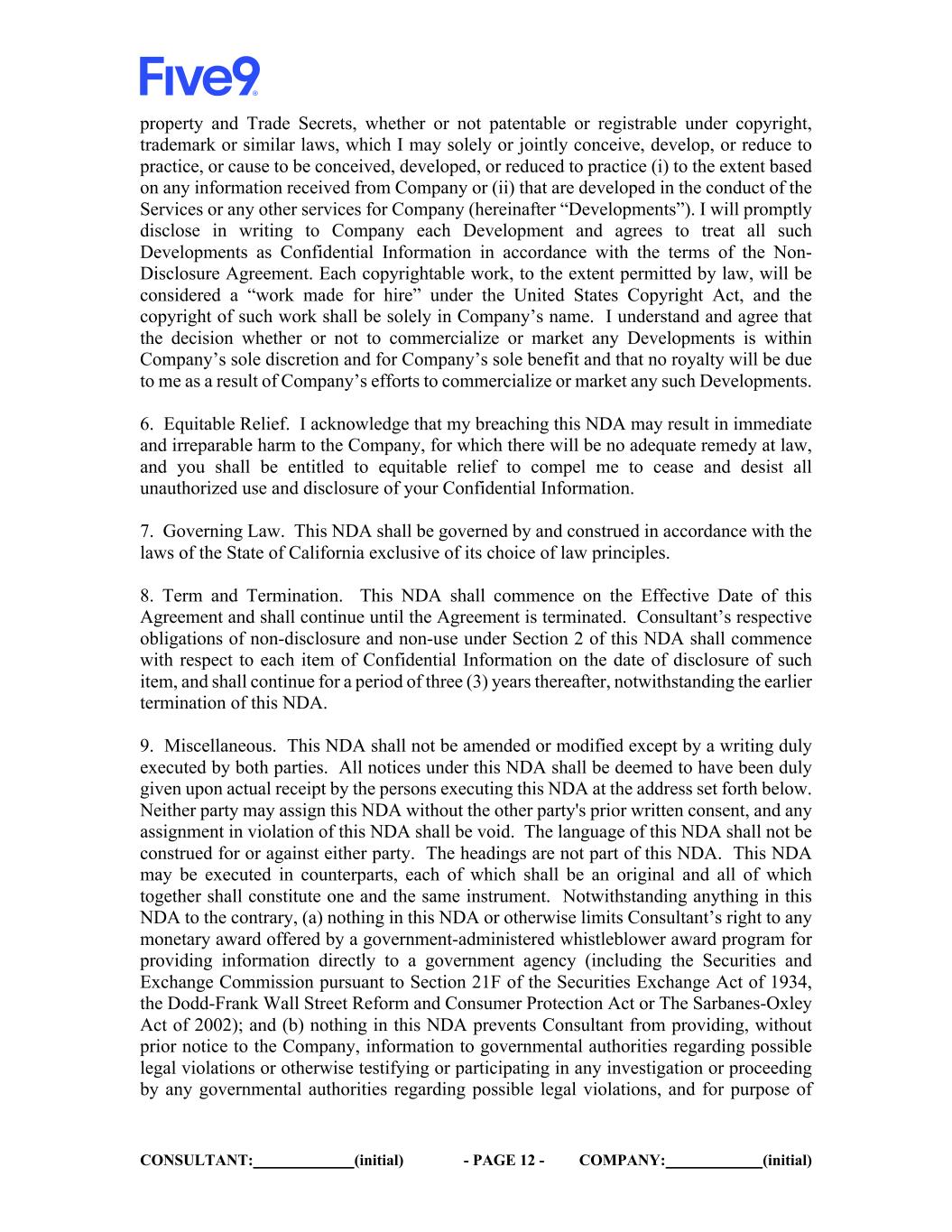 CONSULTANT: (initial) - PAGE 12 - COMPANY: (initial) property and Trade Secrets, whether or not patentable or registrable under copyright, trademark or similar laws, which I may solely or jointly conceive, develop, or reduce to practice, or cause to be conceived, developed, or reduced to practice (i) to the extent based on any information received from Company or (ii) that are developed in the conduct of the Services or any other services for Company (hereinafter “Developments”). I will promptly disclose in writing to Company each Development and agrees to treat all such Developments as Confidential Information in accordance with the terms of the Non- Disclosure Agreement. Each copyrightable work, to the extent permitted by law, will be considered a “work made for hire” under the United States Copyright Act, and the copyright of such work shall be solely in Company’s name. I understand and agree that the decision whether or not to commercialize or market any Developments is within Company’s sole discretion and for Company’s sole benefit and that no royalty will be due to me as a result of Company’s efforts to commercialize or market any such Developments. 6. Equitable Relief. I acknowledge that my breaching this NDA may result in immediate and irreparable harm to the Company, for which there will be no adequate remedy at law, and you shall be entitled to equitable relief to compel me to cease and desist all unauthorized use and disclosure of your Confidential Information. 7. Governing Law. This NDA shall be governed by and construed in accordance with the laws of the State of California exclusive of its choice of law principles. 8. Term and Termination. This NDA shall commence on the Effective Date of this Agreement and shall continue until the Agreement is terminated. Consultant’s respective obligations of non-disclosure and non-use under Section 2 of this NDA shall commence with respect to each item of Confidential Information on the date of disclosure of such item, and shall continue for a period of three (3) years thereafter, notwithstanding the earlier termination of this NDA. 9. Miscellaneous. This NDA shall not be amended or modified except by a writing duly executed by both parties. All notices under this NDA shall be deemed to have been duly given upon actual receipt by the persons executing this NDA at the address set forth below. Neither party may assign this NDA without the other party's prior written consent, and any assignment in violation of this NDA shall be void. The language of this NDA shall not be construed for or against either party. The headings are not part of this NDA. This NDA may be executed in counterparts, each of which shall be an original and all of which together shall constitute one and the same instrument. Notwithstanding anything in this NDA to the contrary, (a) nothing in this NDA or otherwise limits Consultant’s right to any monetary award offered by a government-administered whistleblower award program for providing information directly to a government agency (including the Securities and Exchange Commission pursuant to Section 21F of the Securities Exchange Act of 1934, the Dodd-Frank Wall Street Reform and Consumer Protection Act or The Sarbanes-Oxley Act of 2002); and (b) nothing in this NDA prevents Consultant from providing, without prior notice to the Company, information to governmental authorities regarding possible legal violations or otherwise testifying or participating in any investigation or proceeding by any governmental authorities regarding possible legal violations, and for purpose of