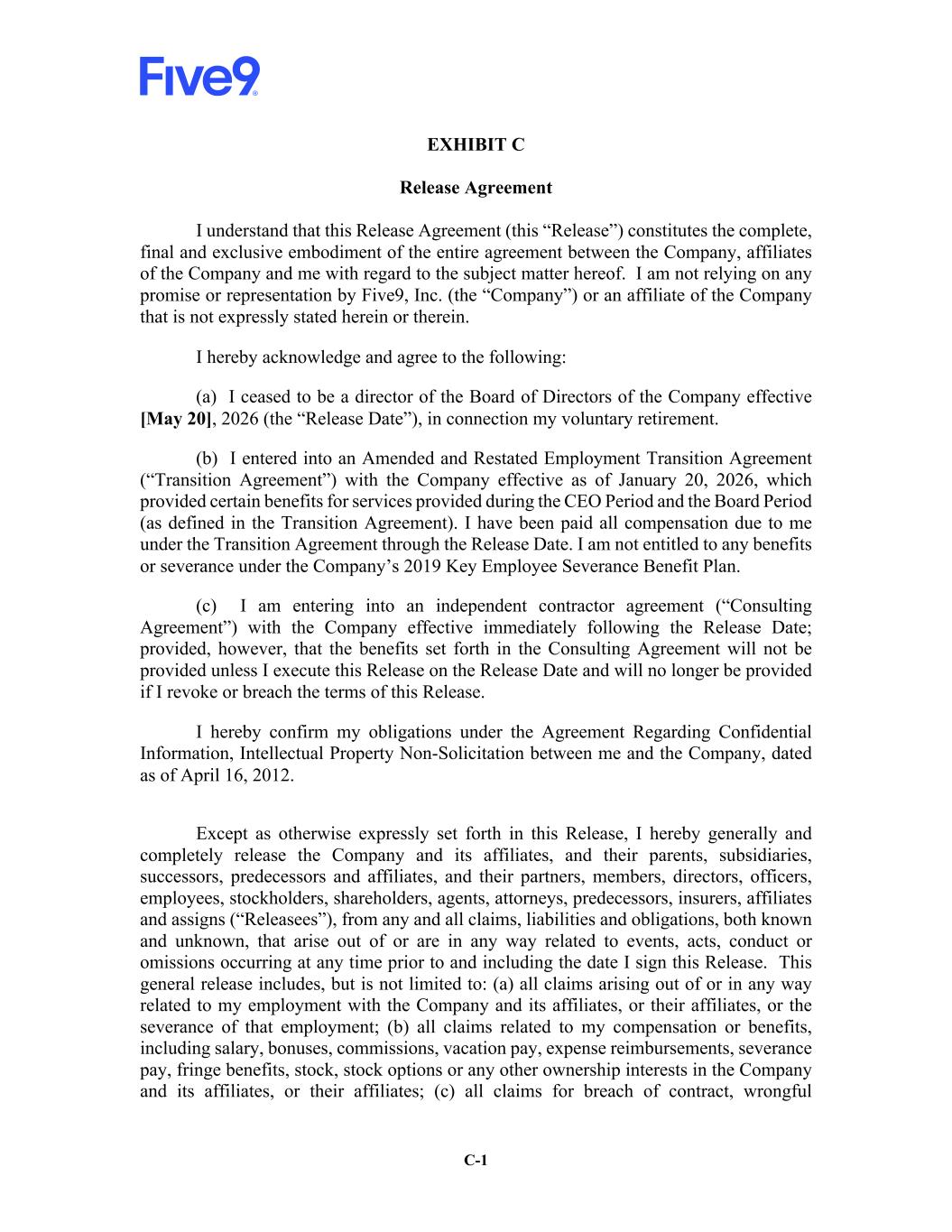 C-1 EXHIBIT C Release Agreement I understand that this Release Agreement (this “Release”) constitutes the complete, final and exclusive embodiment of the entire agreement between the Company, affiliates of the Company and me with regard to the subject matter hereof. I am not relying on any promise or representation by Five9, Inc. (the “Company”) or an affiliate of the Company that is not expressly stated herein or therein. I hereby acknowledge and agree to the following: (a) I ceased to be a director of the Board of Directors of the Company effective [May 20], 2026 (the “Release Date”), in connection my voluntary retirement. (b) I entered into an Amended and Restated Employment Transition Agreement (“Transition Agreement”) with the Company effective as of January 20, 2026, which provided certain benefits for services provided during the CEO Period and the Board Period (as defined in the Transition Agreement). I have been paid all compensation due to me under the Transition Agreement through the Release Date. I am not entitled to any benefits or severance under the Company’s 2019 Key Employee Severance Benefit Plan. (c) I am entering into an independent contractor agreement (“Consulting Agreement”) with the Company effective immediately following the Release Date; provided, however, that the benefits set forth in the Consulting Agreement will not be provided unless I execute this Release on the Release Date and will no longer be provided if I revoke or breach the terms of this Release. I hereby confirm my obligations under the Agreement Regarding Confidential Information, Intellectual Property Non-Solicitation between me and the Company, dated as of April 16, 2012. Except as otherwise expressly set forth in this Release, I hereby generally and completely release the Company and its affiliates, and their parents, subsidiaries, successors, predecessors and affiliates, and their partners, members, directors, officers, employees, stockholders, shareholders, agents, attorneys, predecessors, insurers, affiliates and assigns (“Releasees”), from any and all claims, liabilities and obligations, both known and unknown, that arise out of or are in any way related to events, acts, conduct or omissions occurring at any time prior to and including the date I sign this Release. This general release includes, but is not limited to: (a) all claims arising out of or in any way related to my employment with the Company and its affiliates, or their affiliates, or the severance of that employment; (b) all claims related to my compensation or benefits, including salary, bonuses, commissions, vacation pay, expense reimbursements, severance pay, fringe benefits, stock, stock options or any other ownership interests in the Company and its affiliates, or their affiliates; (c) all claims for breach of contract, wrongful