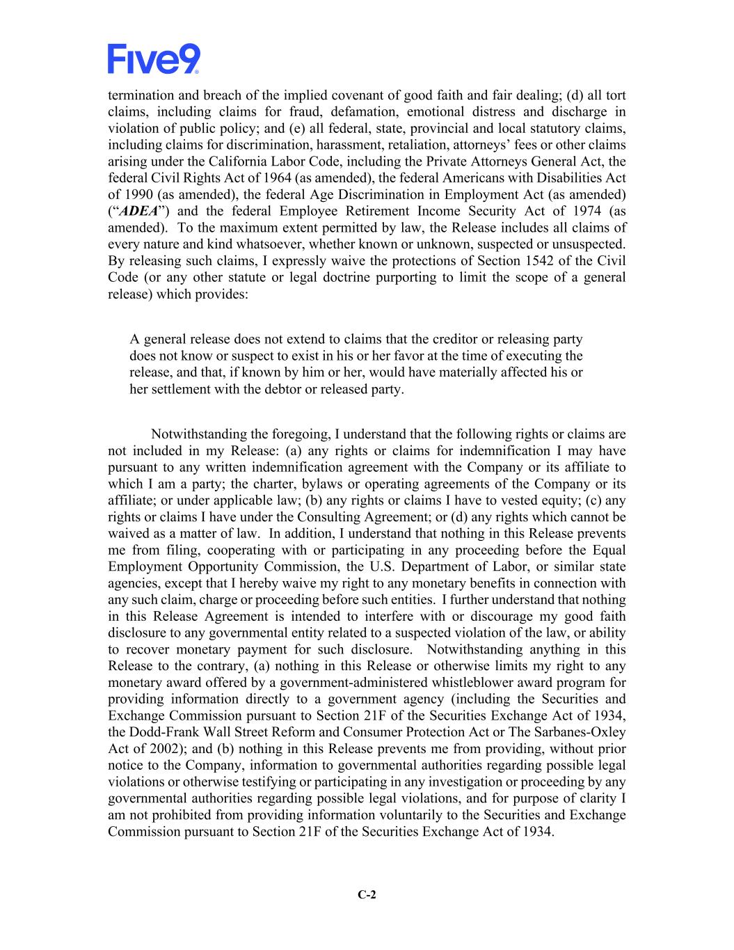 C-2 termination and breach of the implied covenant of good faith and fair dealing; (d) all tort claims, including claims for fraud, defamation, emotional distress and discharge in violation of public policy; and (e) all federal, state, provincial and local statutory claims, including claims for discrimination, harassment, retaliation, attorneys’ fees or other claims arising under the California Labor Code, including the Private Attorneys General Act, the federal Civil Rights Act of 1964 (as amended), the federal Americans with Disabilities Act of 1990 (as amended), the federal Age Discrimination in Employment Act (as amended) (“ADEA”) and the federal Employee Retirement Income Security Act of 1974 (as amended). To the maximum extent permitted by law, the Release includes all claims of every nature and kind whatsoever, whether known or unknown, suspected or unsuspected. By releasing such claims, I expressly waive the protections of Section 1542 of the Civil Code (or any other statute or legal doctrine purporting to limit the scope of a general release) which provides: A general release does not extend to claims that the creditor or releasing party does not know or suspect to exist in his or her favor at the time of executing the release, and that, if known by him or her, would have materially affected his or her settlement with the debtor or released party. Notwithstanding the foregoing, I understand that the following rights or claims are not included in my Release: (a) any rights or claims for indemnification I may have pursuant to any written indemnification agreement with the Company or its affiliate to which I am a party; the charter, bylaws or operating agreements of the Company or its affiliate; or under applicable law; (b) any rights or claims I have to vested equity; (c) any rights or claims I have under the Consulting Agreement; or (d) any rights which cannot be waived as a matter of law. In addition, I understand that nothing in this Release prevents me from filing, cooperating with or participating in any proceeding before the Equal Employment Opportunity Commission, the U.S. Department of Labor, or similar state agencies, except that I hereby waive my right to any monetary benefits in connection with any such claim, charge or proceeding before such entities. I further understand that nothing in this Release Agreement is intended to interfere with or discourage my good faith disclosure to any governmental entity related to a suspected violation of the law, or ability to recover monetary payment for such disclosure. Notwithstanding anything in this Release to the contrary, (a) nothing in this Release or otherwise limits my right to any monetary award offered by a government-administered whistleblower award program for providing information directly to a government agency (including the Securities and Exchange Commission pursuant to Section 21F of the Securities Exchange Act of 1934, the Dodd-Frank Wall Street Reform and Consumer Protection Act or The Sarbanes-Oxley Act of 2002); and (b) nothing in this Release prevents me from providing, without prior notice to the Company, information to governmental authorities regarding possible legal violations or otherwise testifying or participating in any investigation or proceeding by any governmental authorities regarding possible legal violations, and for purpose of clarity I am not prohibited from providing information voluntarily to the Securities and Exchange Commission pursuant to Section 21F of the Securities Exchange Act of 1934.