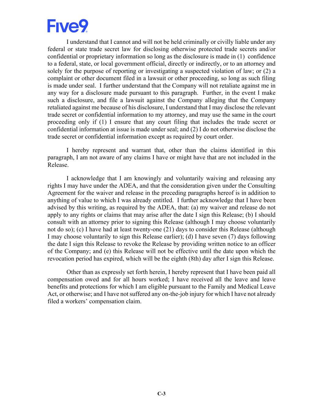 C-3 I understand that I cannot and will not be held criminally or civilly liable under any federal or state trade secret law for disclosing otherwise protected trade secrets and/or confidential or proprietary information so long as the disclosure is made in (1) confidence to a federal, state, or local government official, directly or indirectly, or to an attorney and solely for the purpose of reporting or investigating a suspected violation of law; or (2) a complaint or other document filed in a lawsuit or other proceeding, so long as such filing is made under seal. I further understand that the Company will not retaliate against me in any way for a disclosure made pursuant to this paragraph. Further, in the event I make such a disclosure, and file a lawsuit against the Company alleging that the Company retaliated against me because of his disclosure, I understand that I may disclose the relevant trade secret or confidential information to my attorney, and may use the same in the court proceeding only if (1) I ensure that any court filing that includes the trade secret or confidential information at issue is made under seal; and (2) I do not otherwise disclose the trade secret or confidential information except as required by court order. I hereby represent and warrant that, other than the claims identified in this paragraph, I am not aware of any claims I have or might have that are not included in the Release. I acknowledge that I am knowingly and voluntarily waiving and releasing any rights I may have under the ADEA, and that the consideration given under the Consulting Agreement for the waiver and release in the preceding paragraphs hereof is in addition to anything of value to which I was already entitled. I further acknowledge that I have been advised by this writing, as required by the ADEA, that: (a) my waiver and release do not apply to any rights or claims that may arise after the date I sign this Release; (b) I should consult with an attorney prior to signing this Release (although I may choose voluntarily not do so); (c) I have had at least twenty-one (21) days to consider this Release (although I may choose voluntarily to sign this Release earlier); (d) I have seven (7) days following the date I sign this Release to revoke the Release by providing written notice to an officer of the Company; and (e) this Release will not be effective until the date upon which the revocation period has expired, which will be the eighth (8th) day after I sign this Release. Other than as expressly set forth herein, I hereby represent that I have been paid all compensation owed and for all hours worked; I have received all the leave and leave benefits and protections for which I am eligible pursuant to the Family and Medical Leave Act, or otherwise; and I have not suffered any on-the-job injury for which I have not already filed a workers’ compensation claim.