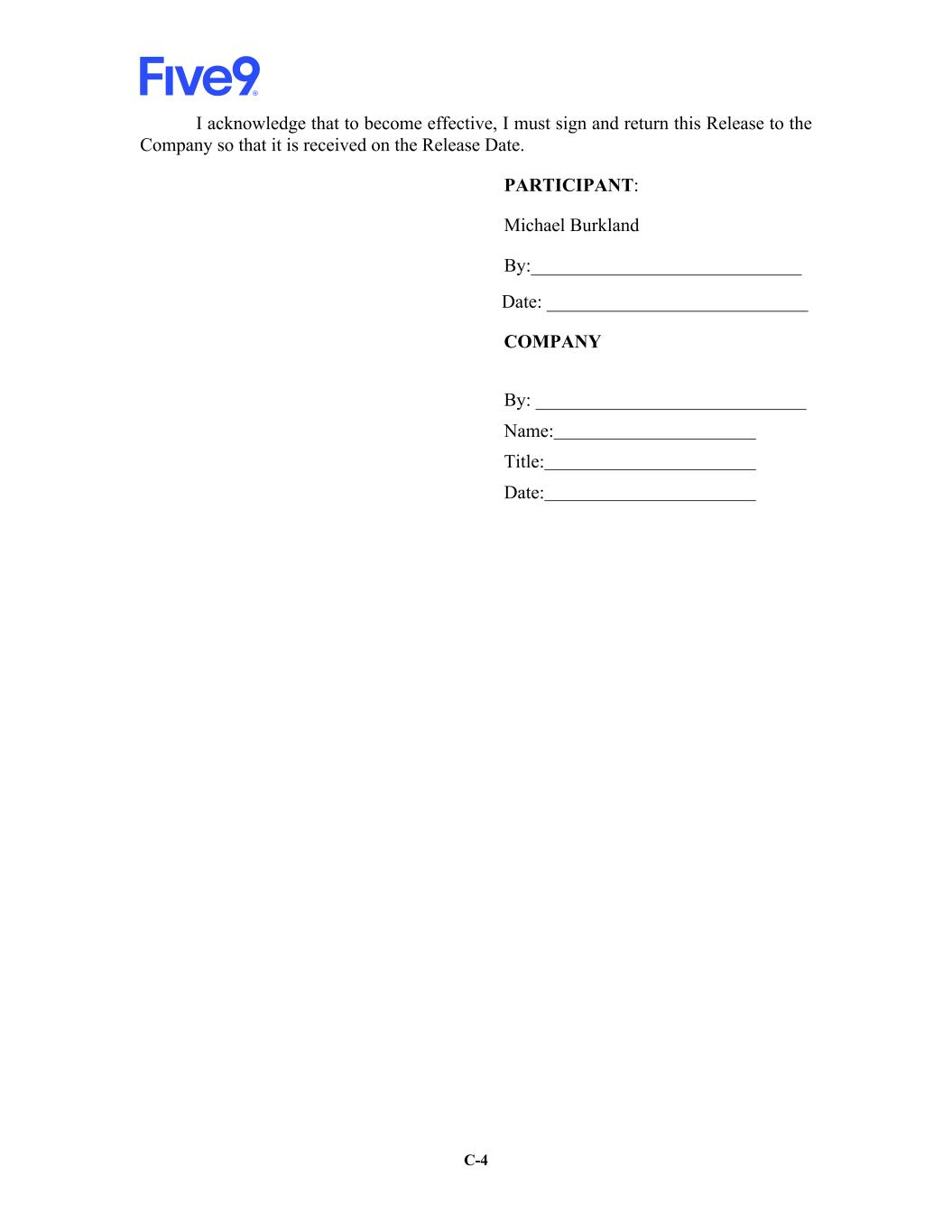 C-4 I acknowledge that to become effective, I must sign and return this Release to the Company so that it is received on the Release Date. PARTICIPANT: Michael Burkland By:_____________________________ Date: ____________________________ COMPANY By: _____________________________ Name: Title: Date: