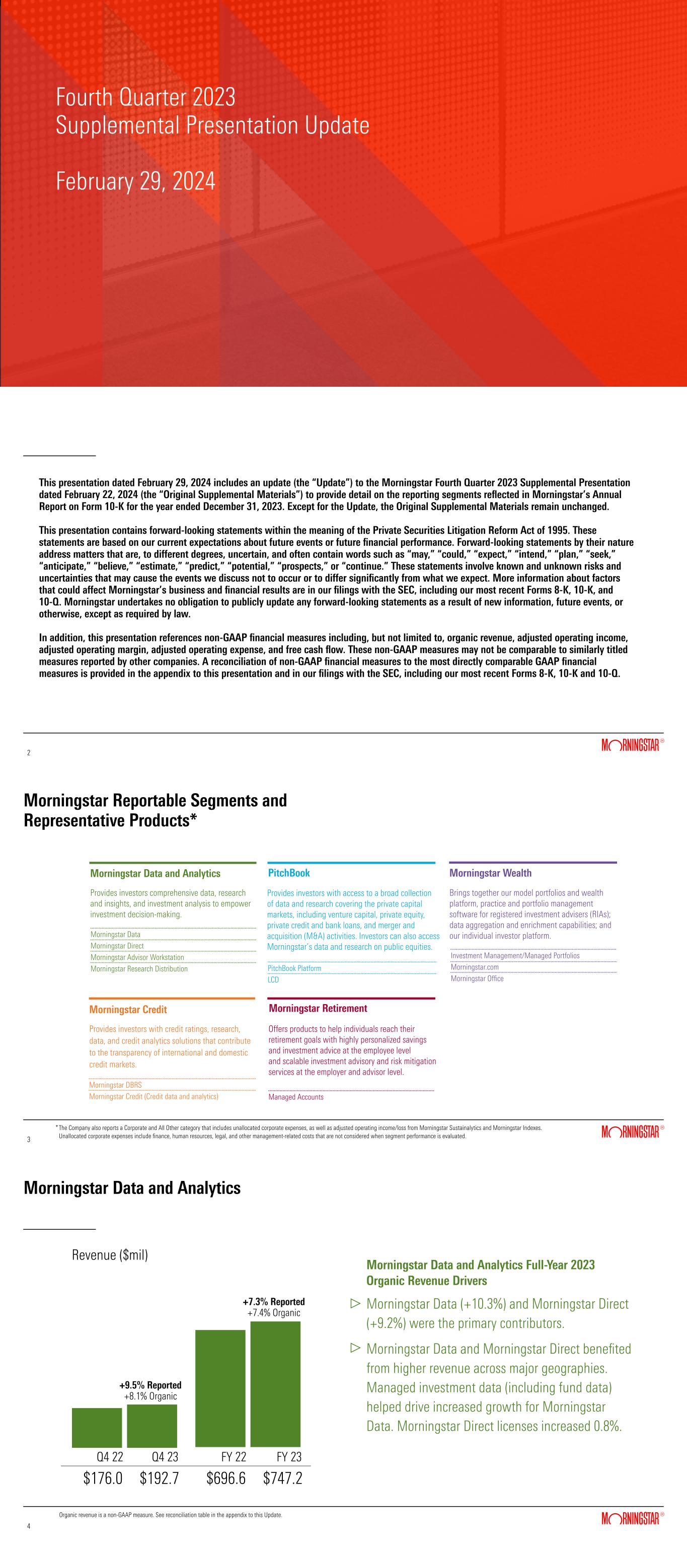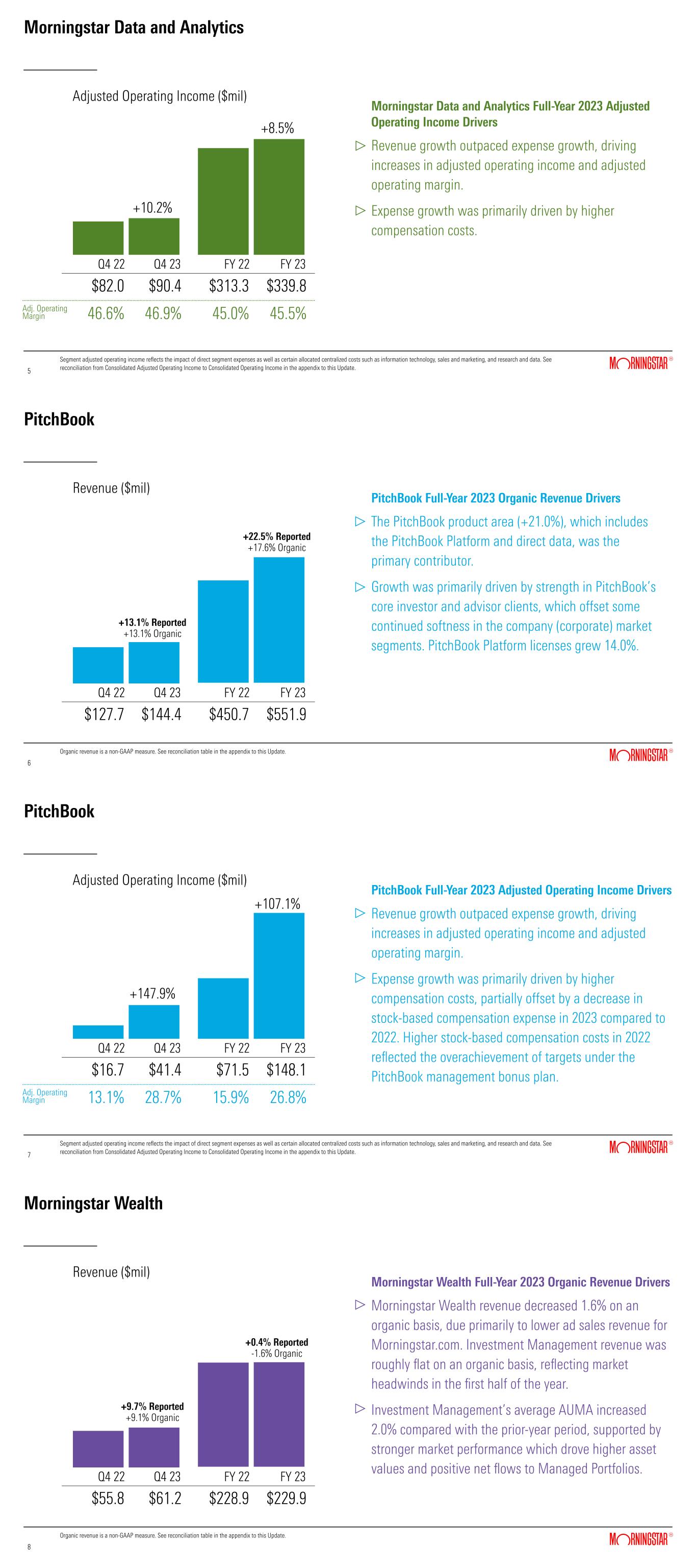 Morningstar Data and Analytics Morningstar Data and Analytics Full-Year 2023 Adjusted Operating Income Drivers Revenue growth outpaced expense growth, driving increases in adjusted operating income and adjusted operating margin. Expense growth was primarily driven by higher compensation costs. Segment adjusted operating income reflects the impact of direct segment expenses as well as certain allocated centralized costs such as information technology, sales and marketing, and research and data. See reconciliation from Consolidated Adjusted Operating Income to Consolidated Operating Income in the appendix to this Update. 5 5 Q4 23Q4 22 $82.0 $90.4 Adjusted Operating Income ($mil) FY 23FY 22 $313.3 $339.8 +10.2% +8.5% 46.6% 46.9% 45.0% 45.5%Adj. Operating Margin PitchBook Q4 23Q4 22 PitchBook Full-Year 2023 Organic Revenue Drivers The PitchBook product area (+21.0%), which includes the PitchBook Platform and direct data, was the primary contributor. Growth was primarily driven by strength in PitchBook’s core investor and advisor clients, which offset some continued softness in the company (corporate) market segments. PitchBook Platform licenses grew 14.0%. Organic revenue is a non-GAAP measure. See reconciliation table in the appendix to this Update. $127.7 $144.4 6 6 Revenue ($mil) FY 23FY 22 $450.7 $551.9 +13.1% Reported +13.1% Organic +22.5% Reported +17.6% Organic PitchBook PitchBook Full-Year 2023 Adjusted Operating Income Drivers Revenue growth outpaced expense growth, driving increases in adjusted operating income and adjusted operating margin. Expense growth was primarily driven by higher compensation costs, partially offset by a decrease in stock-based compensation expense in 2023 compared to 2022. Higher stock-based compensation costs in 2022 reflected the overachievement of targets under the PitchBook management bonus plan. Segment adjusted operating income reflects the impact of direct segment expenses as well as certain allocated centralized costs such as information technology, sales and marketing, and research and data. See reconciliation from Consolidated Adjusted Operating Income to Consolidated Operating Income in the appendix to this Update. 7 7 Q4 23Q4 22 $16.7 $41.4 Adjusted Operating Income ($mil) FY 23FY 22 $71.5 $148.1 +147.9% +107.1% 13.1% 28.7% 15.9% 26.8%Adj. Operating Margin Morningstar Wealth Q4 23Q4 22 Morningstar Wealth Full-Year 2023 Organic Revenue Drivers Morningstar Wealth revenue decreased 1.6% on an organic basis, due primarily to lower ad sales revenue for Morningstar.com. Investment Management revenue was roughly flat on an organic basis, reflecting market headwinds in the first half of the year. Investment Management’s average AUMA increased 2.0% compared with the prior-year period, supported by stronger market performance which drove higher asset values and positive net flows to Managed Portfolios.   Organic revenue is a non-GAAP measure. See reconciliation table in the appendix to this Update. $55.8 $61.2 8 8 Revenue ($mil) FY 23FY 22 $228.9 $229.9 +9.7% Reported +9.1% Organic +0.4% Reported -1.6% Organic