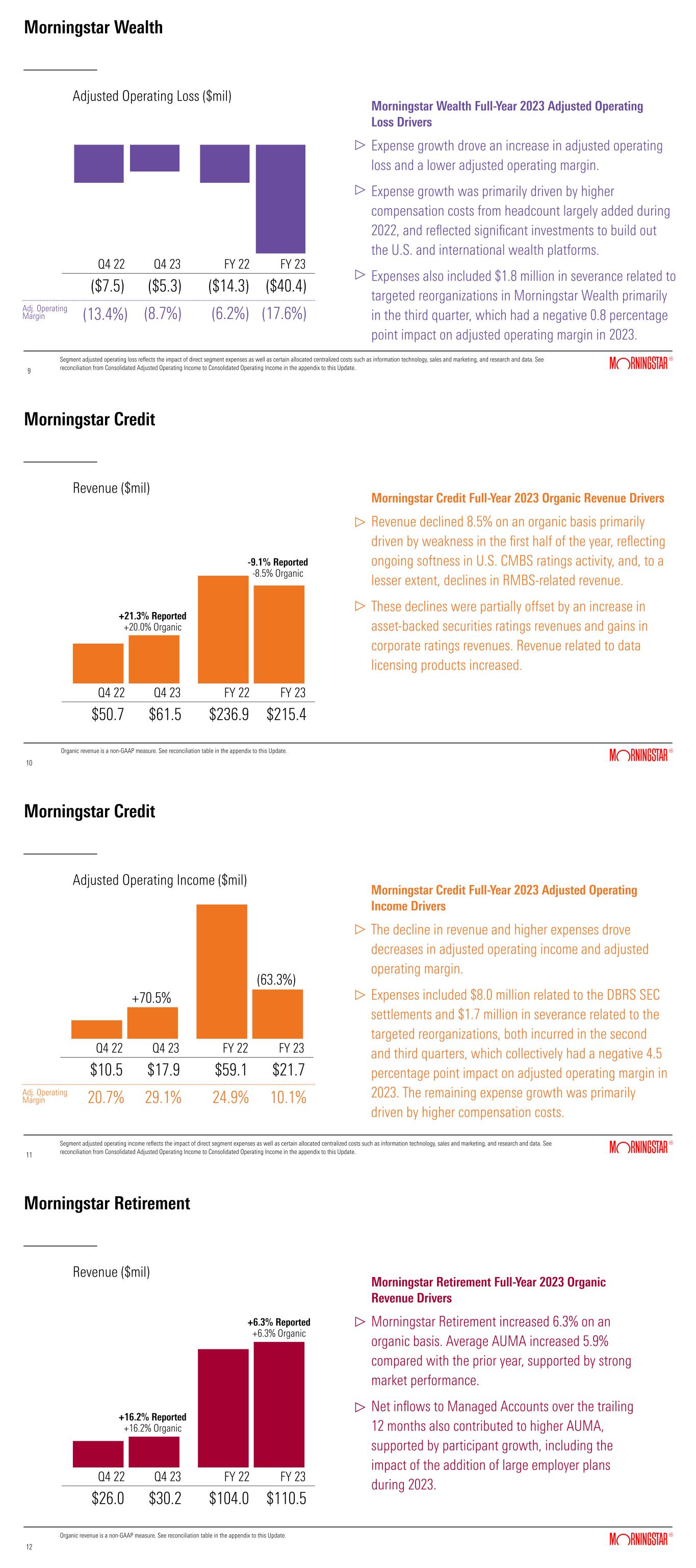Morningstar Wealth Morningstar Wealth Full-Year 2023 Adjusted Operating Loss Drivers Expense growth drove an increase in adjusted operating loss and a lower adjusted operating margin. Expense growth was primarily driven by higher compensation costs from headcount largely added during 2022, and reflected significant investments to build out the U.S. and international wealth platforms. Expenses also included $1.8 million in severance related to targeted reorganizations in Morningstar Wealth primarily in the third quarter, which had a negative 0.8 percentage point impact on adjusted operating margin in 2023. Segment adjusted operating loss reflects the impact of direct segment expenses as well as certain allocated centralized costs such as information technology, sales and marketing, and research and data. See reconciliation from Consolidated Adjusted Operating Income to Consolidated Operating Income in the appendix to this Update. 9 9 Q4 23Q4 22 ($7.5) ($5.3) Adjusted Operating Loss ($mil) FY 23FY 22 ($14.3) ($40.4) (13.4%) (8.7%) (6.2%) (17.6%)Adj. Operating Margin Morningstar Credit Q4 23Q4 22 Morningstar Credit Full-Year 2023 Organic Revenue Drivers Revenue declined 8.5% on an organic basis primarily driven by weakness in the first half of the year, reflecting ongoing softness in U.S. CMBS ratings activity, and, to a lesser extent, declines in RMBS-related revenue. These declines were partially offset by an increase in asset-backed securities ratings revenues and gains in corporate ratings revenues. Revenue related to data licensing products increased. Organic revenue is a non-GAAP measure. See reconciliation table in the appendix to this Update. $50.7 $61.5 10 10 Revenue ($mil) FY 23FY 22 $236.9 $215.4 +21.3% Reported +20.0% Organic -9.1% Reported -8.5% Organic Morningstar Credit Q4 23Q4 22 Morningstar Credit Full-Year 2023 Adjusted Operating Income Drivers The decline in revenue and higher expenses drove decreases in adjusted operating income and adjusted operating margin. Expenses included $8.0 million related to the DBRS SEC settlements and $1.7 million in severance related to the targeted reorganizations, both incurred in the second and third quarters, which collectively had a negative 4.5 percentage point impact on adjusted operating margin in 2023. The remaining expense growth was primarily driven by higher compensation costs. Segment adjusted operating income reflects the impact of direct segment expenses as well as certain allocated centralized costs such as information technology, sales and marketing, and research and data. See reconciliation from Consolidated Adjusted Operating Income to Consolidated Operating Income in the appendix to this Update. $10.5 $17.9 11 11 Adjusted Operating Income ($mil) FY 23FY 22 $59.1 $21.7 +70.5% (63.3%) 20.7% 29.1% 24.9% 10.1%Adj. Operating Margin Morningstar Retirement Q4 23Q4 22 Morningstar Retirement Full-Year 2023 Organic Revenue Drivers Morningstar Retirement increased 6.3% on an organic basis. Average AUMA increased 5.9% compared with the prior year, supported by strong market performance. Net inflows to Managed Accounts over the trailing 12 months also contributed to higher AUMA, supported by participant growth, including the impact of the addition of large employer plans during 2023. Organic revenue is a non-GAAP measure. See reconciliation table in the appendix to this Update. $26.0 $30.2 12 12 Revenue ($mil) FY 23FY 22 $104.0 $110.5 +16.2% Reported +16.2% Organic +6.3% Reported +6.3% Organic