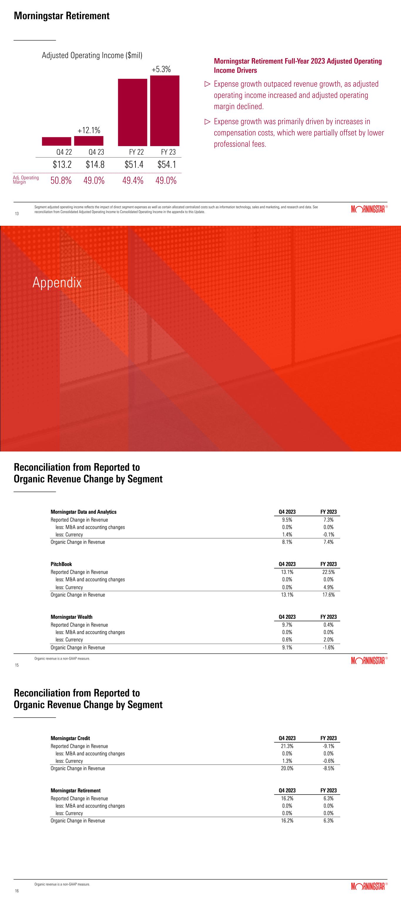 Morningstar Retirement Q4 23Q4 22 Morningstar Retirement Full-Year 2023 Adjusted Operating Income Drivers Expense growth outpaced revenue growth, as adjusted operating income increased and adjusted operating margin declined. Expense growth was primarily driven by increases in compensation costs, which were partially offset by lower professional fees. Segment adjusted operating income reflects the impact of direct segment expenses as well as certain allocated centralized costs such as information technology, sales and marketing, and research and data. See reconciliation from Consolidated Adjusted Operating Income to Consolidated Operating Income in the appendix to this Update. $13.2 $14.8 13 13 Adjusted Operating Income ($mil) FY 23FY 22 $51.4 $54.1 +12.1% +5.3% Adj. Operating Margin 50.8% 49.0% 49.4% 49.0% Appendix Reconciliation from Reported to Organic Revenue Change by Segment Organic revenue is a non-GAAP measure. 15 15 Reconciliation from Reported to Organic Revenue Change by Segment Organic revenue is a non-GAAP measure. 16 16