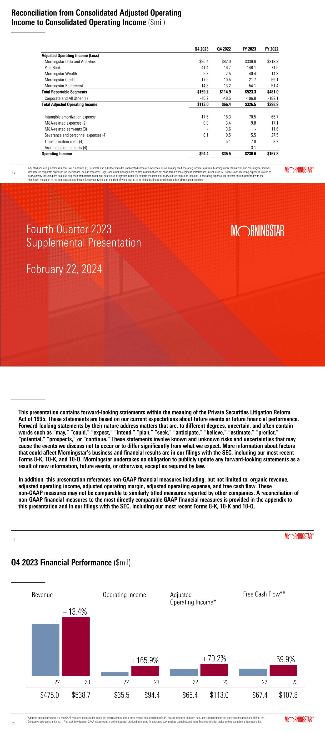 Reconciliation from Consolidated Adjusted Operating Income to Consolidated Operating Income ($mil) Adjusted operating income is a non-GAAP measure. (1) Corporate and All Other includes unallocated corporate expenses, as well as adjusted operating income/loss from Morningstar Sustainalytics and Morningstar Indexes. Unallocated corporate expenses include finance, human resources, legal, and other management-related costs that are not considered when segment performance is evaluated. (2) Reflects non-recurring expenses related to M&A activity including pre-deal due diligence, transaction costs, and post-close integration costs. (3) Reflects the impact of M&A-related earn-outs included in operating expense. (4) Reflects costs associated with the significant reduction of the company's operations in Shenzhen, China and the shift of work related to its global business functions to other Morningstar locations. 17 Fourth Quarter 2023 Supplemental Presentation February 22, 2024 This presentation contains forward-looking statements within the meaning of the Private Securities Litigation Reform Act of 1995. These statements are based on our current expectations about future events or future financial performance. Forward-looking statements by their nature address matters that are, to different degrees, uncertain, and often contain words such as “may,” “could,” “expect,” “intend,” “plan,” “seek,” “anticipate,” “believe,” “estimate,” “predict,” “potential,” “prospects,” or “continue.” These statements involve known and unknown risks and uncertainties that may cause the events we discuss not to occur or to differ significantly from what we expect. More information about factors that could affect Morningstar’s business and financial results are in our filings with the SEC, including our most recent Forms 8-K, 10-K, and 10-Q. Morningstar undertakes no obligation to publicly update any forward-looking statements as a result of new information, future events, or otherwise, except as required by law. In addition, this presentation references non-GAAP financial measures including, but not limited to, organic revenue, adjusted operating income, adjusted operating margin, adjusted operating expense, and free cash flow. These non-GAAP measures may not be comparable to similarly titled measures reported by other companies. A reconciliation of non-GAAP financial measures to the most directly comparable GAAP financial measures is provided in the appendix to this presentation and in our filings with the SEC, including our most recent Forms 8-K, 10-K and 10-Q. 19 19 Q4 2023 Financial Performance ($mil) $94.4$35.5 2322 $113.0 +13.4% +70.2% 2322 $538.7$475.0 2322 $66.4 $107.8 2322 $67.4 Operating Income Free Cash Flow** Revenue Adjusted Operating Income* * 20 20 Adjusted operating income is a non-GAAP measure and excludes intangible amortization expense, other merger and acquisition (M&A) related expenses and earn-outs, and items related to the significant reduction and shift of the Company’s operations in China. **Free cash flow is a non-GAAP measure and is defined as cash provided by or used for operating activities less capital expenditures. See reconciliation tables in the appendix of this presentation. +59.9%+165.9%