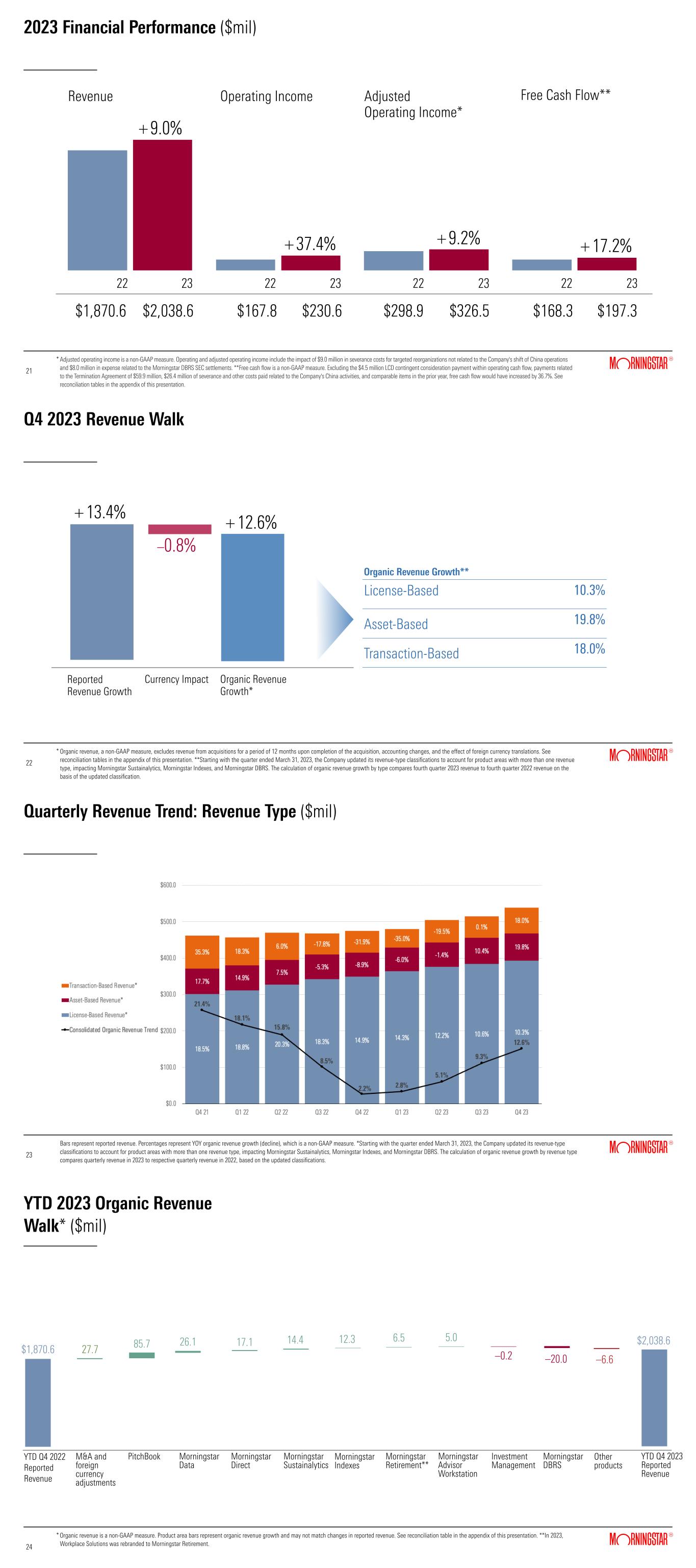 2023 Financial Performance ($mil) $230.6$167.8 2322 $326.5 +9.0% +9.2% 2322 $2,038.6$1,870.6 2322 $298.9 $197.3 2322 $168.3 Operating Income Free Cash Flow** Revenue Adjusted Operating Income* * 21 21 Adjusted operating income is a non-GAAP measure. Operating and adjusted operating income include the impact of $9.0 million in severance costs for targeted reorganizations not related to the Company's shift of China operations and $8.0 million in expense related to the Morningstar DBRS SEC settlements. **Free cash flow is a non-GAAP measure. Excluding the $4.5 million LCD contingent consideration payment within operating cash flow, payments related to the Termination Agreement of $59.9 million, $26.4 million of severance and other costs paid related to the Company's China activities, and comparable items in the prior year, free cash flow would have increased by 36.7%. See reconciliation tables in the appendix of this presentation. +17.2%+37.4% Q4 2023 Revenue Walk Organic revenue, a non-GAAP measure, excludes revenue from acquisitions for a period of 12 months upon completion of the acquisition, accounting changes, and the effect of foreign currency translations. See reconciliation tables in the appendix of this presentation. **Starting with the quarter ended March 31, 2023, the Company updated its revenue-type classifications to account for product areas with more than one revenue type, impacting Morningstar Sustainalytics, Morningstar Indexes, and Morningstar DBRS. The calculation of organic revenue growth by type compares fourth quarter 2023 revenue to fourth quarter 2022 revenue on the basis of the updated classification. 22 22 * +13.4% Reported Revenue Growth +12.6% Organic Revenue Growth** License-Based 10.3% Asset-Based 19.8% Transaction-Based 18.0% Organic Revenue Growth* –0.8% Currency Impact Quarterly Revenue Trend: Revenue Type ($mil) Bars represent reported revenue. Percentages represent YOY organic revenue growth (decline), which is a non-GAAP measure. *Starting with the quarter ended March 31, 2023, the Company updated its revenue-type classifications to account for product areas with more than one revenue type, impacting Morningstar Sustainalytics, Morningstar Indexes, and Morningstar DBRS. The calculation of organic revenue growth by revenue type compares quarterly revenue in 2023 to respective quarterly revenue in 2022, based on the updated classifications. 23 23 YTD 2023 Organic Revenue Walk* ($mil) 24 24 * YTD Q4 2022 Reported Revenue M&A and foreign currency adjustments PitchBook Morningstar Data Morningstar Direct Morningstar Sustainalytics Morningstar Indexes Morningstar Advisor Workstation Investment Management Morningstar DBRS Morningstar Retirement** Other products YTD Q4 2023 Reported Revenue $1,870.6 27.7 85.7 26.1 17.1 12.314.4 5.0 –20.0 $2,038.6 Organic revenue is a non-GAAP measure. Product area bars represent organic revenue growth and may not match changes in reported revenue. See reconciliation table in the appendix of this presentation. **In 2023, Workplace Solutions was rebranded to Morningstar Retirement. –6.6 6.5 –0.2
