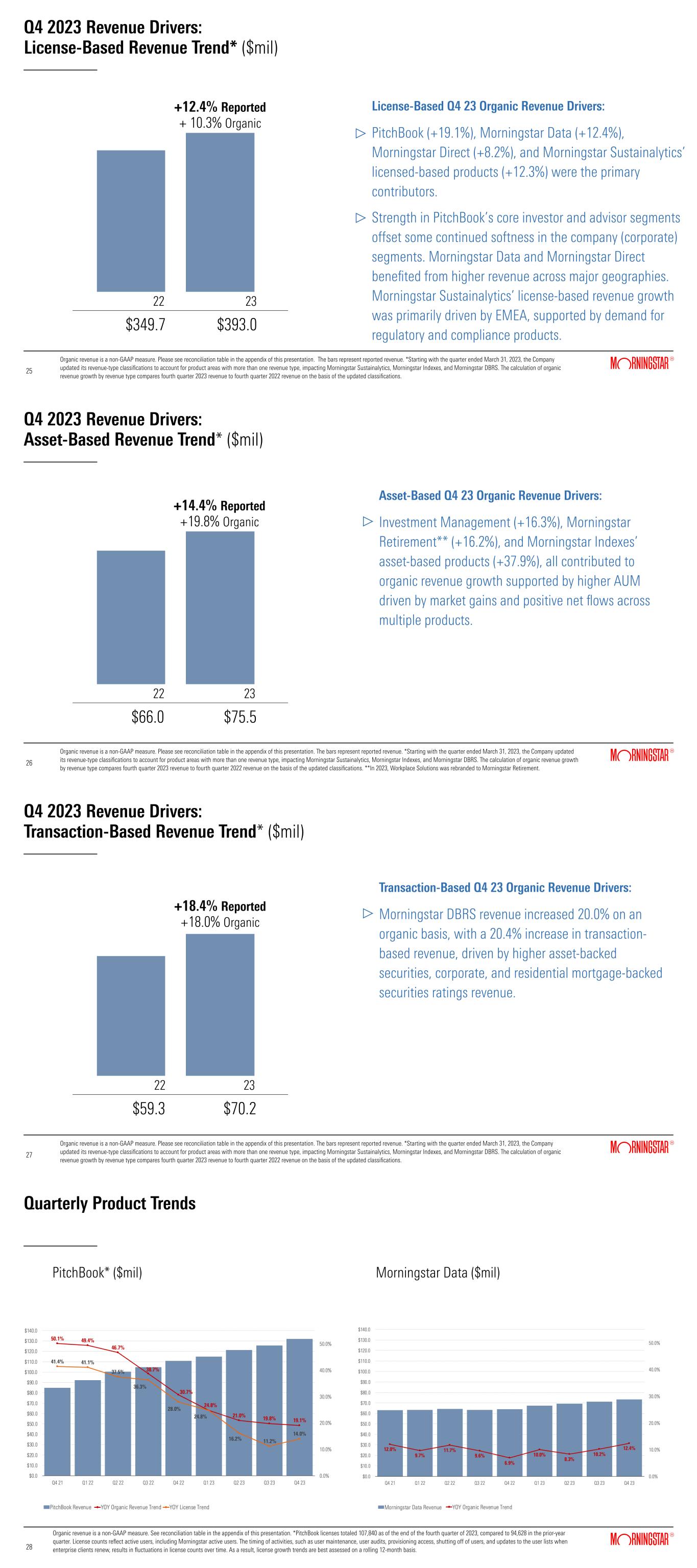 Q4 2023 Revenue Drivers:  License-Based Revenue Trend* ($mil) +12.4% Reported + 10.3% Organic 2322 License-Based Q4 23 Organic Revenue Drivers: PitchBook (+19.1%), Morningstar Data (+12.4%), Morningstar Direct (+8.2%), and Morningstar Sustainalytics’ licensed-based products (+12.3%) were the primary contributors.  Strength in PitchBook’s core investor and advisor segments offset some continued softness in the company (corporate) segments. Morningstar Data and Morningstar Direct benefited from higher revenue across major geographies. Morningstar Sustainalytics’ license-based revenue growth was primarily driven by EMEA, supported by demand for regulatory and compliance products. Organic revenue is a non-GAAP measure. Please see reconciliation table in the appendix of this presentation. The bars represent reported revenue. *Starting with the quarter ended March 31, 2023, the Company updated its revenue-type classifications to account for product areas with more than one revenue type, impacting Morningstar Sustainalytics, Morningstar Indexes, and Morningstar DBRS. The calculation of organic revenue growth by revenue type compares fourth quarter 2023 revenue to fourth quarter 2022 revenue on the basis of the updated classifications. $349.7 $393.0 25 25 Q4 2023 Revenue Drivers: Asset-Based Revenue Trend* ($mil) Asset-Based Q4 23 Organic Revenue Drivers: Investment Management (+16.3%), Morningstar Retirement** (+16.2%), and Morningstar Indexes’ asset-based products (+37.9%), all contributed to organic revenue growth supported by higher AUM driven by market gains and positive net flows across multiple products. +14.4% Reported +19.8% Organic 2322 $66.0 $75.5 26 26 Organic revenue is a non-GAAP measure. Please see reconciliation table in the appendix of this presentation. The bars represent reported revenue. *Starting with the quarter ended March 31, 2023, the Company updated its revenue-type classifications to account for product areas with more than one revenue type, impacting Morningstar Sustainalytics, Morningstar Indexes, and Morningstar DBRS. The calculation of organic revenue growth by revenue type compares fourth quarter 2023 revenue to fourth quarter 2022 revenue on the basis of the updated classifications. **In 2023, Workplace Solutions was rebranded to Morningstar Retirement. Q4 2023 Revenue Drivers: Transaction-Based Revenue Trend* ($mil) Transaction-Based Q4 23 Organic Revenue Drivers: Morningstar DBRS revenue increased 20.0% on an organic basis, with a 20.4% increase in transaction- based revenue, driven by higher asset-backed securities, corporate, and residential mortgage-backed securities ratings revenue. +18.4% Reported +18.0% Organic 2322 $59.3 $70.2 27 27 Organic revenue is a non-GAAP measure. Please see reconciliation table in the appendix of this presentation. The bars represent reported revenue. *Starting with the quarter ended March 31, 2023, the Company updated its revenue-type classifications to account for product areas with more than one revenue type, impacting Morningstar Sustainalytics, Morningstar Indexes, and Morningstar DBRS. The calculation of organic revenue growth by revenue type compares fourth quarter 2023 revenue to fourth quarter 2022 revenue on the basis of the updated classifications. Quarterly Product Trends PitchBook* ($mil) 28 28 Morningstar Data ($mil) Organic revenue is a non-GAAP measure. See reconciliation table in the appendix of this presentation. *PitchBook licenses totaled 107,840 as of the end of the fourth quarter of 2023, compared to 94,628 in the prior-year quarter. License counts reflect active users, including Morningstar active users. The timing of activities, such as user maintenance, user audits, provisioning access, shutting off of users, and updates to the user lists when enterprise clients renew, results in fluctuations in license counts over time. As a result, license growth trends are best assessed on a rolling 12-month basis.