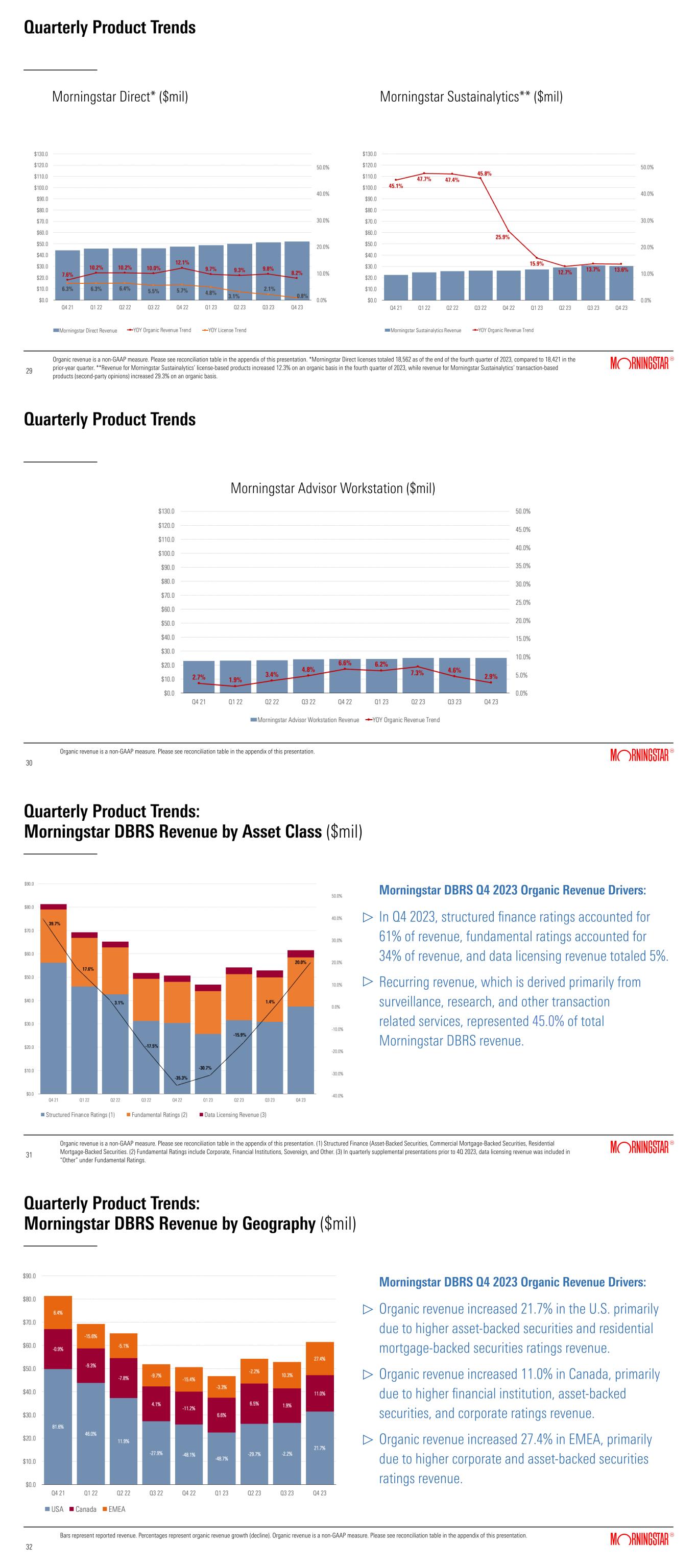 Quarterly Product Trends Morningstar Direct* ($mil) 29 29 Organic revenue is a non-GAAP measure. Please see reconciliation table in the appendix of this presentation. *Morningstar Direct licenses totaled 18,562 as of the end of the fourth quarter of 2023, compared to 18,421 in the prior-year quarter. **Revenue for Morningstar Sustainalytics’ license-based products increased 12.3% on an organic basis in the fourth quarter of 2023, while revenue for Morningstar Sustainalytics’ transaction-based products (second-party opinions) increased 29.3% on an organic basis. Morningstar Sustainalytics** ($mil) Quarterly Product Trends Morningstar Advisor Workstation ($mil) 30 30 Organic revenue is a non-GAAP measure. Please see reconciliation table in the appendix of this presentation. Quarterly Product Trends: Morningstar DBRS Revenue by Asset Class ($mil) Morningstar DBRS Q4 2023 Organic Revenue Drivers: In Q4 2023, structured finance ratings accounted for 61% of revenue, fundamental ratings accounted for 34% of revenue, and data licensing revenue totaled 5%. Recurring revenue, which is derived primarily from surveillance, research, and other transaction related services, represented 45.0% of total Morningstar DBRS revenue.   Organic revenue is a non-GAAP measure. Please see reconciliation table in the appendix of this presentation. (1) Structured Finance (Asset-Backed Securities, Commercial Mortgage-Backed Securities, Residential Mortgage-Backed Securities. (2) Fundamental Ratings include Corporate, Financial Institutions, Sovereign, and Other. (3) In quarterly supplemental presentations prior to 4Q 2023, data licensing revenue was included in “Other” under Fundamental Ratings. 31 31 Quarterly Product Trends: Morningstar DBRS Revenue by Geography ($mil) Morningstar DBRS Q4 2023 Organic Revenue Drivers: Organic revenue increased 21.7% in the U.S. primarily due to higher asset-backed securities and residential mortgage-backed securities ratings revenue. Organic revenue increased 11.0% in Canada, primarily due to higher financial institution, asset-backed securities, and corporate ratings revenue.   Organic revenue increased 27.4% in EMEA, primarily due to higher corporate and asset-backed securities ratings revenue. Bars represent reported revenue. Percentages represent organic revenue growth (decline). Organic revenue is a non-GAAP measure. Please see reconciliation table in the appendix of this presentation. 32 32