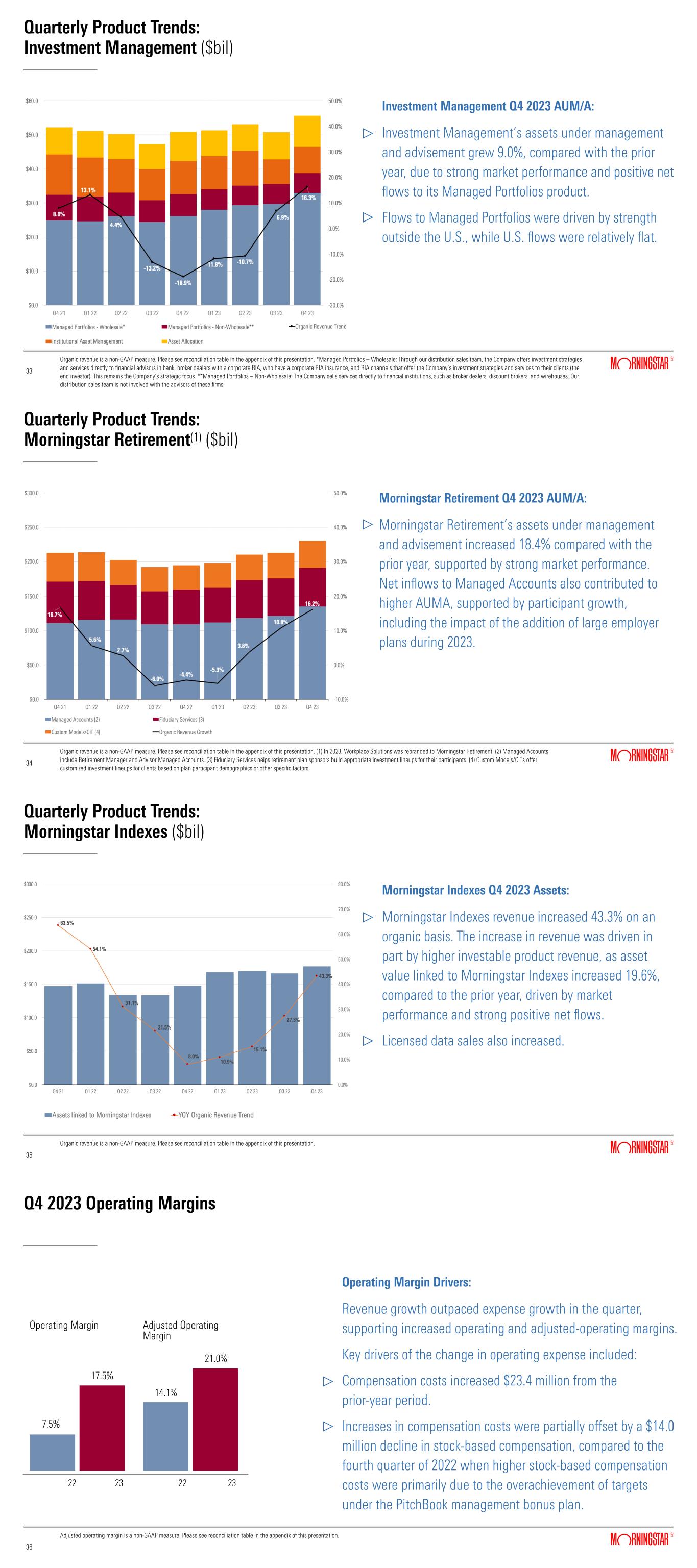 Quarterly Product Trends: Investment Management ($bil) Investment Management Q4 2023 AUM/A: Investment Management’s assets under management and advisement grew 9.0%, compared with the prior year, due to strong market performance and positive net flows to its Managed Portfolios product.   Flows to Managed Portfolios were driven by strength outside the U.S., while U.S. flows were relatively flat. Organic revenue is a non-GAAP measure. Please see reconciliation table in the appendix of this presentation. *Managed Portfolios – Wholesale: Through our distribution sales team, the Company offers investment strategies and services directly to financial advisors in bank, broker dealers with a corporate RIA, who have a corporate RIA insurance, and RIA channels that offer the Company’s investment strategies and services to their clients (the end investor). This remains the Company’s strategic focus. **Managed Portfolios – Non-Wholesale: The Company sells services directly to financial institutions, such as broker dealers, discount brokers, and wirehouses. Our distribution sales team is not involved with the advisors of these firms. 33 33 Morningstar Retirement Q4 2023 AUM/A: Morningstar Retirement’s assets under management and advisement increased 18.4% compared with the prior year, supported by strong market performance. Net inflows to Managed Accounts also contributed to higher AUMA, supported by participant growth, including the impact of the addition of large employer plans during 2023.  Quarterly Product Trends: Morningstar Retirement(1) ($bil) Organic revenue is a non-GAAP measure. Please see reconciliation table in the appendix of this presentation. (1) In 2023, Workplace Solutions was rebranded to Morningstar Retirement. (2) Managed Accounts include Retirement Manager and Advisor Managed Accounts. (3) Fiduciary Services helps retirement plan sponsors build appropriate investment lineups for their participants. (4) Custom Models/CITs offer customized investment lineups for clients based on plan participant demographics or other specific factors. 34 34 Quarterly Product Trends: Morningstar Indexes ($bil) 35 35 Organic revenue is a non-GAAP measure. Please see reconciliation table in the appendix of this presentation. Morningstar Indexes Q4 2023 Assets: Morningstar Indexes revenue increased 43.3% on an organic basis. The increase in revenue was driven in part by higher investable product revenue, as asset value linked to Morningstar Indexes increased 19.6%, compared to the prior year, driven by market performance and strong positive net flows. Licensed data sales also increased. Q4 2023 Operating Margins 36 36 Adjusted operating margin is a non-GAAP measure. Please see reconciliation table in the appendix of this presentation. Adjusted Operating Margin Operating Margin 2322 17.5% 21.0% 2322 7.5% 14.1% Operating Margin Drivers: Revenue growth outpaced expense growth in the quarter, supporting increased operating and adjusted-operating margins. Key drivers of the change in operating expense included: Compensation costs increased $23.4 million from the prior-year period. Increases in compensation costs were partially offset by a $14.0 million decline in stock-based compensation, compared to the fourth quarter of 2022 when higher stock-based compensation costs were primarily due to the overachievement of targets under the PitchBook management bonus plan.