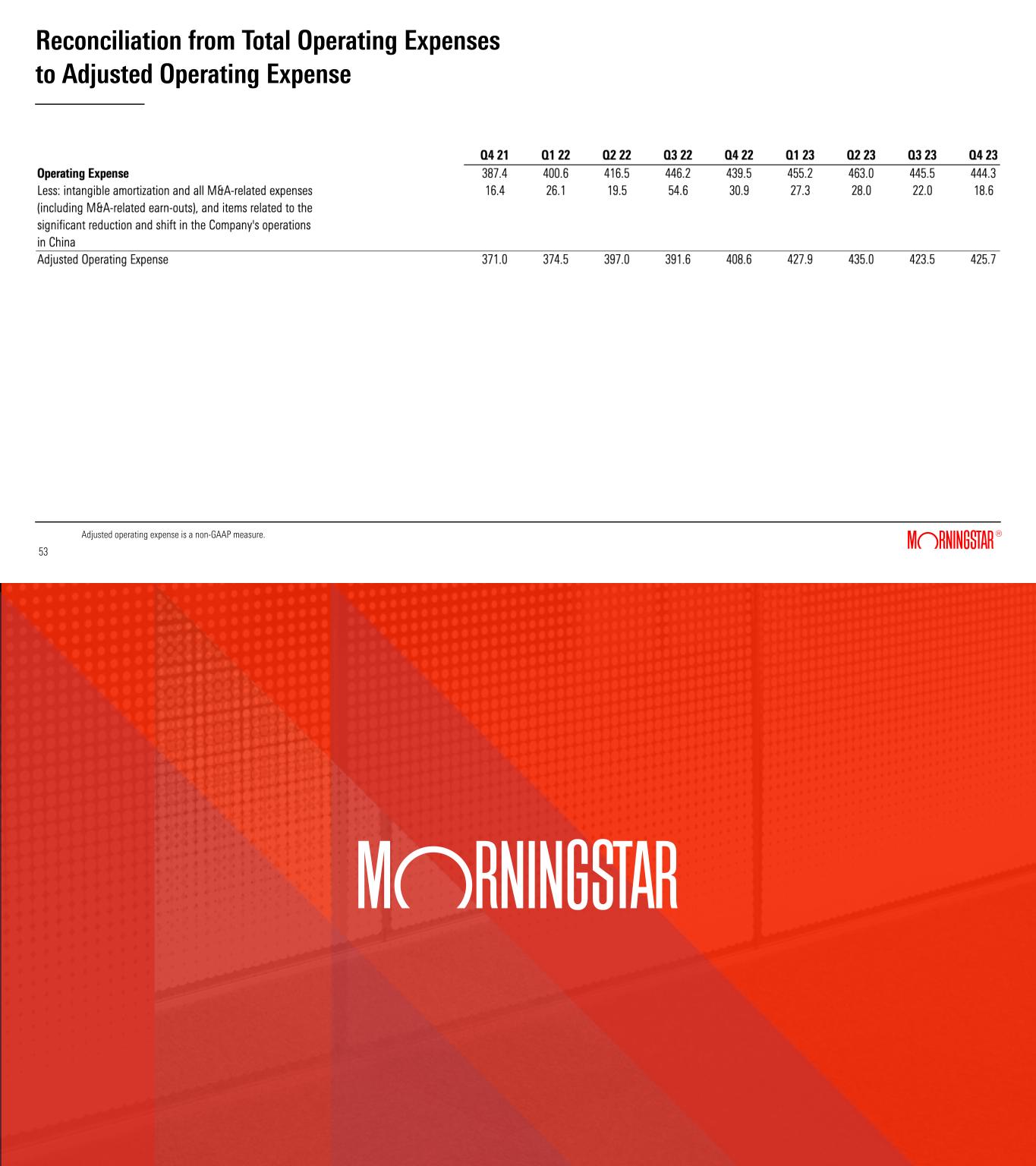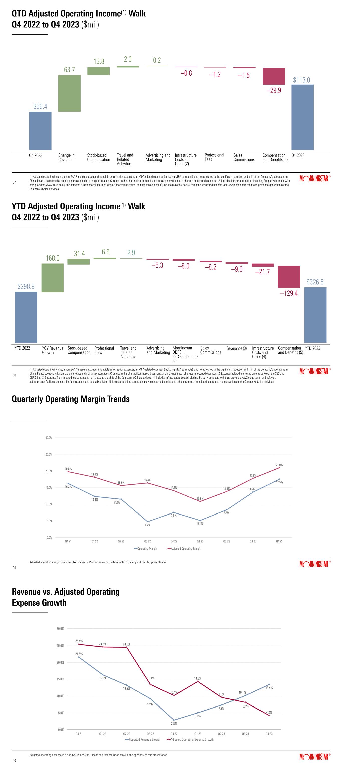 QTD Adjusted Operating Income(1) Walk Q4 2022 to Q4 2023 ($mil) (1) Adjusted operating income, a non-GAAP measure, excludes intangible amortization expenses, all M&A-related expenses (including M&A earn-outs), and items related to the significant reduction and shift of the Company’s operations in China. Please see reconciliation table in the appendix of this presentation. Changes in this chart reflect these adjustments and may not match changes in reported expenses. (2) Includes infrastructure costs (including 3rd party contracts with data providers, AWS cloud costs, and software subscriptions), facilities, depreciation/amortization, and capitalized labor. (3) Includes salaries, bonus, company-sponsored benefits, and severance not related to targeted reorganizations or the Company’s China activities. 37 37 Q4 2022 Change in Revenue Stock-based Compensation Travel and Related Activities Professional Fees Advertising and Marketing Infrastructure Costs and Other (2) Q4 2023 $66.4 13.8 63.7 2.3 –0.8 $113.0 Sales Commissions –29.9 –1.2 Compensation and Benefits (3) –1.5 0.2 YTD Adjusted Operating Income(1) Walk Q4 2022 to Q4 2023 ($mil) (1) Adjusted operating income, a non-GAAP measure, excludes intangible amortization expenses, all M&A-related expenses (including M&A earn-outs), and items related to the significant reduction and shift of the Company’s operations in China. Please see reconciliation table in the appendix of this presentation. Changes in this chart reflect these adjustments and may not match changes in reported expenses. (2) Expenses related to the settlements between the SEC and DBRS, Inc. (3) Severance from targeted reorganizations not related to the shift of the Company’s China activities.  (4) Includes infrastructure costs (including 3rd party contracts with data providers, AWS cloud costs, and software subscriptions), facilities, depreciation/amortization, and capitalized labor. (5) Includes salaries, bonus, company-sponsored benefits, and other severance not related to targeted reorganizations or the Company’s China activities. 38 38 YTD 2022 YOY Revenue Growth Stock-based Compensation Professional Fees Travel and Related Activities Advertising and Marketing Sales Commissions Infrastructure Costs and Other (4) YTD 2023 $298.9 –21.7 31.4 168.0 6.9 –8.0 2.9 –5.3 $326.5 Morningstar DBRS SEC settlements (2) –8.2 –129.4 Compensation and Benefits (5) –9.0 Severance (3) Quarterly Operating Margin Trends Adjusted operating margin is a non-GAAP measure. Please see reconciliation table in the appendix of this presentation. 39 39 Revenue vs. Adjusted Operating Expense Growth 40 40 Adjusted operating expense is a non-GAAP measure. Please see reconciliation table in the appendix of this presentation.