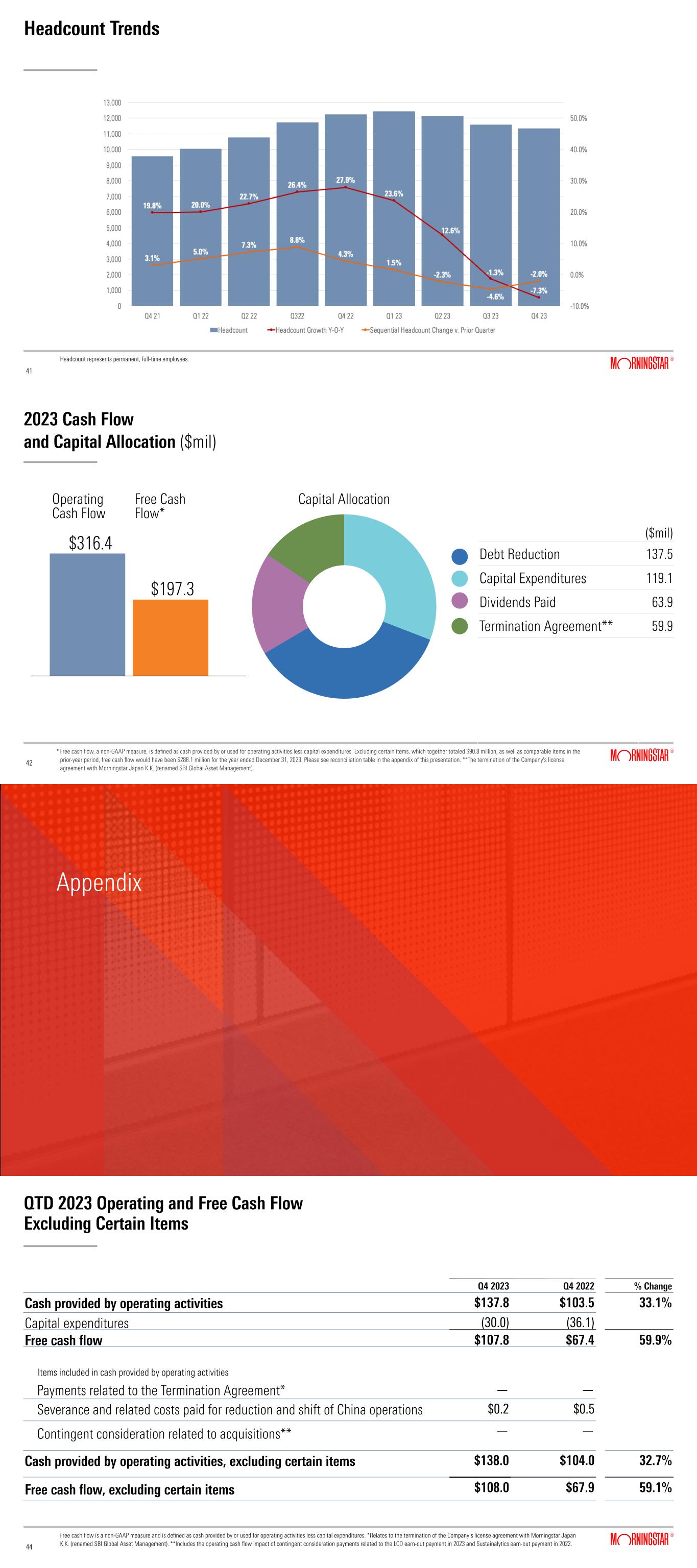 Headcount Trends 41 41 Headcount represents permanent, full-time employees. 2023 Cash Flow and Capital Allocation ($mil) 2 $316.4 $197.3 Operating Cash Flow Free Cash Flow* Capital Allocation 42 42 * ($mil) Debt Reduction 137.5 Capital Expenditures 119.1 Dividends Paid 63.9 Termination Agreement** 59.9 Free cash flow, a non-GAAP measure, is defined as cash provided by or used for operating activities less capital expenditures. Excluding certain items, which together totaled $90.8 million, as well as comparable items in the prior-year period, free cash flow would have been $288.1 million for the year ended December 31, 2023. Please see reconciliation table in the appendix of this presentation. **The termination of the Company's license agreement with Morningstar Japan K.K. (renamed SBI Global Asset Management). Appendix QTD 2023 Operating and Free Cash Flow Excluding Certain Items Free cash flow is a non-GAAP measure and is defined as cash provided by or used for operating activities less capital expenditures. *Relates to the termination of the Company’s license agreement with Morningstar Japan K.K. (renamed SBI Global Asset Management). **Includes the operating cash flow impact of contingent consideration payments related to the LCD earn-out payment in 2023 and Sustainalytics earn-out payment in 2022. Q4 2023 Q4 2022 % Change Cash provided by operating activities $137.8 $103.5 33.1% Capital expenditures (30.0) (36.1) Free cash flow $107.8 $67.4 59.9% Items included in cash provided by operating activities Payments related to the Termination Agreement* — — Severance and related costs paid for reduction and shift of China operations S $0.2 $0.5 Contingent consideration related to acquisitions** — — Cash provided by operating activities, excluding certain items $138.0 $104.0 32.7% Free cash flow, excluding certain items $108.0 $67.9 59.1% 44 44