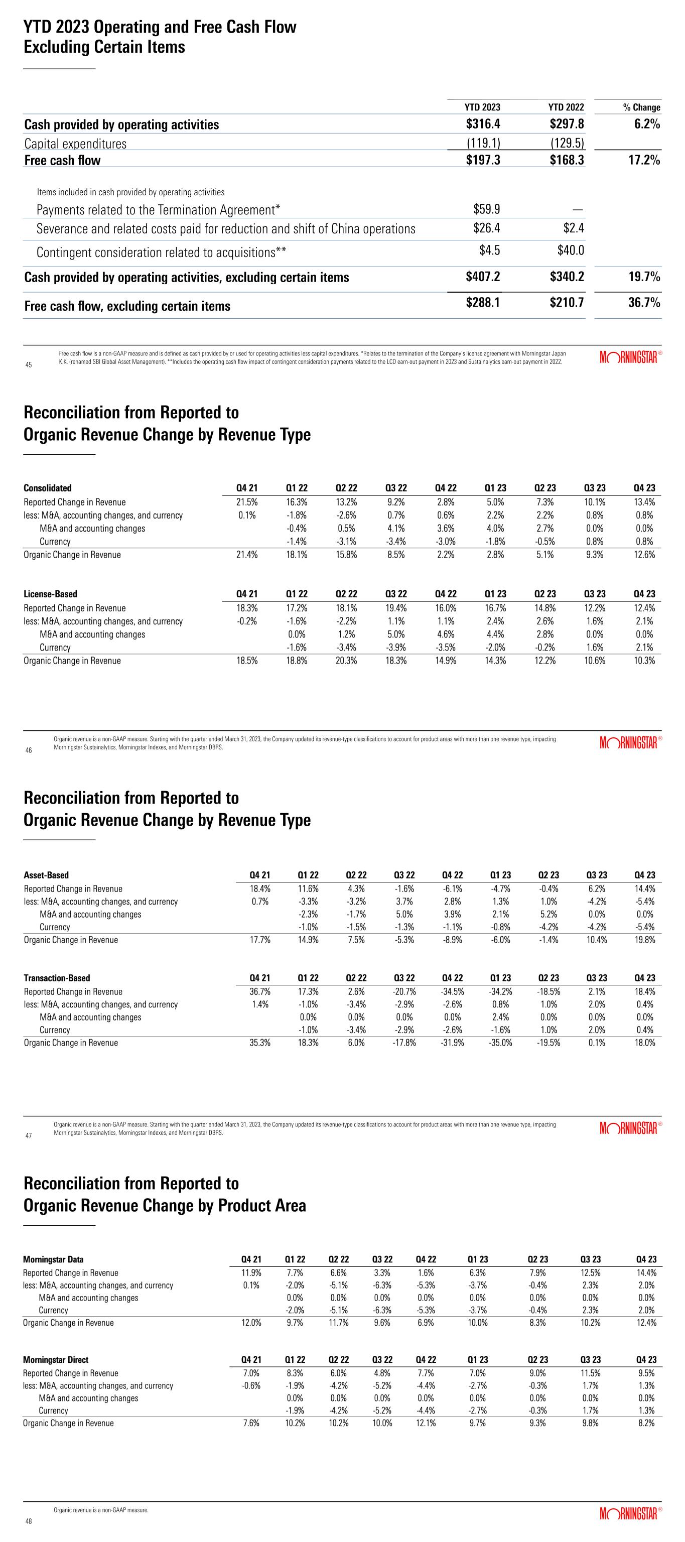 YTD 2023 Operating and Free Cash Flow Excluding Certain Items Free cash flow is a non-GAAP measure and is defined as cash provided by or used for operating activities less capital expenditures. *Relates to the termination of the Company’s license agreement with Morningstar Japan K.K. (renamed SBI Global Asset Management). **Includes the operating cash flow impact of contingent consideration payments related to the LCD earn-out payment in 2023 and Sustainalytics earn-out payment in 2022. YTD 2023 YTD 2022 % Change Cash provided by operating activities $316.4 $297.8 6.2% Capital expenditures (119.1) (129.5) Free cash flow $197.3 $168.3 17.2% Items included in cash provided by operating activities Payments related to the Termination Agreement* $59.9 — Severance and related costs paid for reduction and shift of China operations S $26.4 $2.4 Contingent consideration related to acquisitions** $4.5 $40.0 Cash provided by operating activities, excluding certain items $407.2 $340.2 19.7% Free cash flow, excluding certain items $288.1 $210.7 36.7% 45 45 Reconciliation from Reported to Organic Revenue Change by Revenue Type 46 46 Organic revenue is a non-GAAP measure. Starting with the quarter ended March 31, 2023, the Company updated its revenue-type classifications to account for product areas with more than one revenue type, impacting Morningstar Sustainalytics, Morningstar Indexes, and Morningstar DBRS. Reconciliation from Reported to Organic Revenue Change by Revenue Type 47 47 Organic revenue is a non-GAAP measure. Starting with the quarter ended March 31, 2023, the Company updated its revenue-type classifications to account for product areas with more than one revenue type, impacting Morningstar Sustainalytics, Morningstar Indexes, and Morningstar DBRS. Reconciliation from Reported to Organic Revenue Change by Product Area 48 48 Organic revenue is a non-GAAP measure.