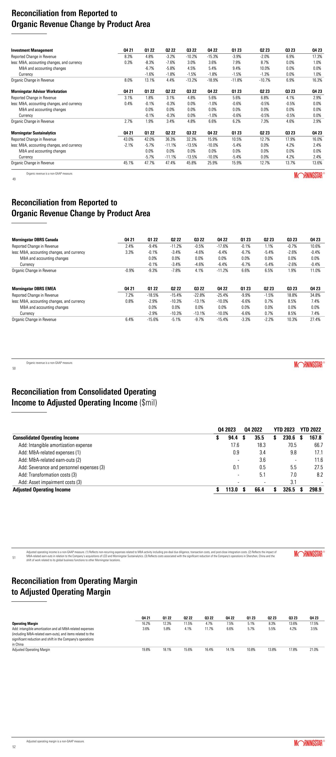 Reconciliation from Reported to Organic Revenue Change by Product Area 49 49 Organic revenue is a non-GAAP measure. Reconciliation from Reported to Organic Revenue Change by Product Area 50 50 Organic revenue is a non-GAAP measure. Reconciliation from Consolidated Operating Income to Adjusted Operating Income ($mil) 51 51 Adjusted operating income is a non-GAAP measure. (1) Reflects non-recurring expenses related to M&A activity including pre-deal due diligence, transaction costs, and post-close integration costs. (2) Reflects the impact of M&A-related earn-outs in relation to the Company’s acquisitions of LCD and Morningstar Sustainalytics. (3) Reflects costs associated with the significant reduction of the Company's operations in Shenzhen, China and the shift of work related to its global business functions to other Morningstar locations. Reconciliation from Operating Margin to Adjusted Operating Margin 52 52 Adjusted operating margin is a non-GAAP measure.