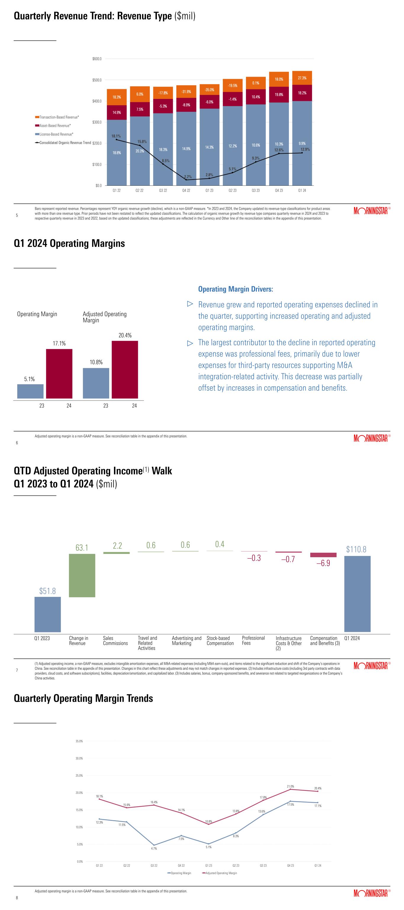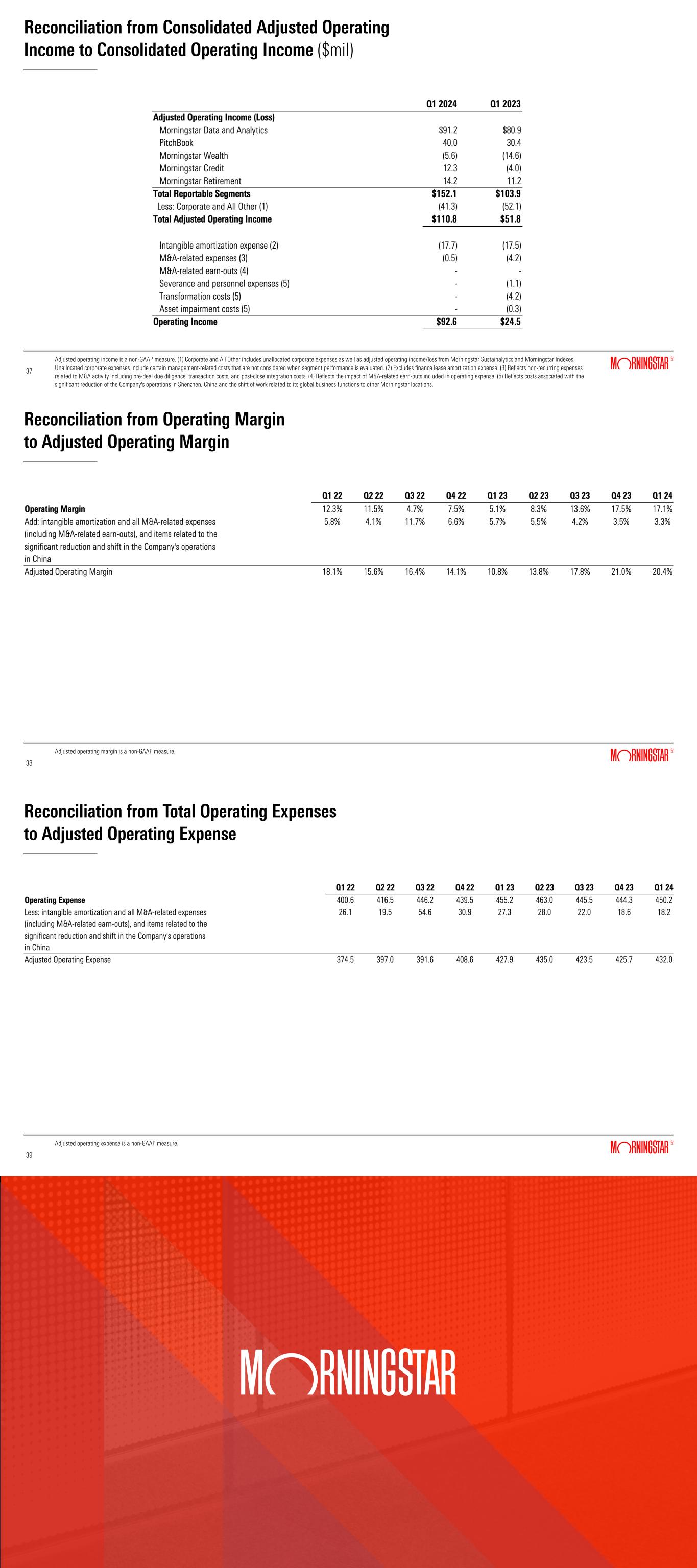 First-Quarter 2024 Supplemental Presentation April 24, 2024 This presentation contains forward-looking statements within the meaning of the Private Securities Litigation Reform Act of 1995. These statements are based on our current expectations about future events or future financial performance. Forward-looking statements by their nature address matters that are, to different degrees, uncertain, and often contain words such as “may,” “could,” “expect,” “intend,” “plan,” “seek,” “anticipate,” “believe,” “estimate,” “predict,” “potential,” “prospects,” or “continue.” These statements involve known and unknown risks and uncertainties that may cause the events we discuss not to occur or to differ significantly from what we expect. More information about factors that could affect Morningstar’s business and financial results are in our filings with the SEC, including our most recent Forms 8-K, 10-K, and 10-Q. Morningstar undertakes no obligation to publicly update any forward-looking statements as a result of new information, future events, or otherwise, except as required by law. In addition, this presentation references non-GAAP financial measures including, but not limited to, organic revenue, adjusted operating income, adjusted operating margin, adjusted operating expense, and free cash flow. These non-GAAP measures may not be comparable to similarly titled measures reported by other companies. A reconciliation of non-GAAP financial measures to the most directly comparable GAAP financial measures is provided in the appendix to this presentation and in our filings with the SEC, including our most recent Forms 8-K, 10-K and 10-Q. 2 2 Q1 2024 Financial Performance ($mil) $92.6$24.5 2423 $110.8 +13.2% +113.9% 2423 $542.8$479.7 2423 $51.8 $59.5 2423 ($6.1) Operating Income Free Cash Flow** Revenue Adjusted Operating Income* * 3 3 Adjusted operating income is a non-GAAP measure and excludes intangible amortization expense, other merger and acquisition (M&A) related expenses and earn-outs, and items related to the significant reduction and shift of the Company’s operations in China in 2023. **Free cash flow is a non-GAAP measure and is defined as cash provided by or used for operating activities less capital expenditures. See reconciliation tables in the appendix of this presentation. NMF+278.0% YTD 2024 Organic Revenue Walk* ($mil) 4 4 * YTD Q1 2023 Reported Revenue Foreign Currency Adjustments PitchBook Morningstar Data and Analytics Morningstar Credit Morningstar Wealth Corporate and All Other Morningstar Retirement YTD Q1 2024 Reported Revenue $479.7 1.2 16.5 16.0 13.2 3.2 8.8 $542.8 Organic revenue is a non-GAAP measure. The Company's five reportable segment bars represent organic growth and may not match changes in reported revenue. See reconciliation tables in the appendix of this presentation. Corporate and All Other provides a reconciliation between revenue from our Total Reportable Segments and consolidated revenue amounts. Corporate and All Other includes Morningstar Sustainalytics and Morningstar Indexes as sources of revenues. 4.2