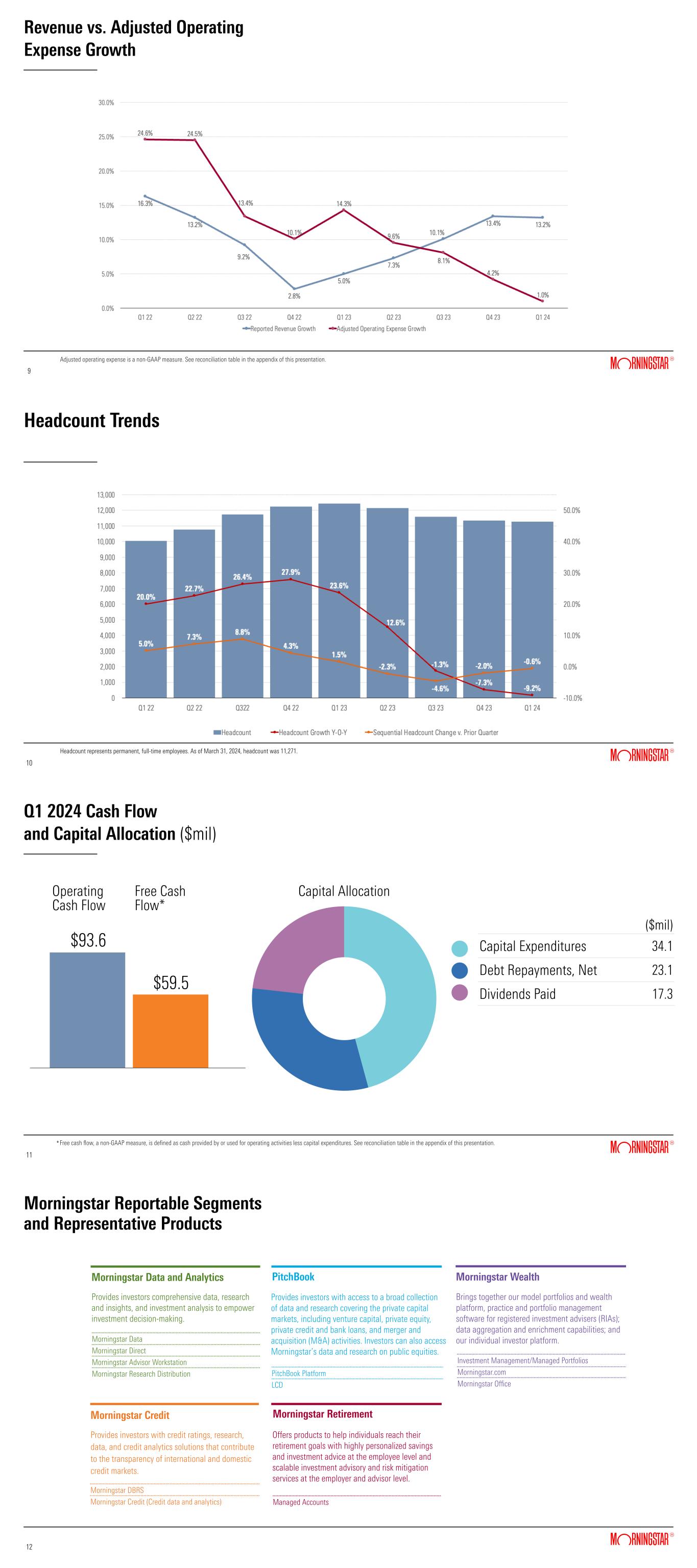 Revenue vs. Adjusted Operating Expense Growth 9 9 Adjusted operating expense is a non-GAAP measure. See reconciliation table in the appendix of this presentation. Headcount Trends 10 10 Headcount represents permanent, full-time employees. As of March 31, 2024, headcount was 11,271. Q1 2024 Cash Flow and Capital Allocation ($mil) 2 $93.6 $59.5 Operating Cash Flow Free Cash Flow* Capital Allocation 11 11 * ($mil) Capital Expenditures 34.1 Debt Repayments, Net 23.1 Dividends Paid 17.3 Free cash flow, a non-GAAP measure, is defined as cash provided by or used for operating activities less capital expenditures. See reconciliation table in the appendix of this presentation. Morningstar Reportable Segments and Representative Products 12 12 Morningstar Data and Analytics Provides investors comprehensive data, research and insights, and investment analysis to empower investment decision-making. Morningstar Retirement Offers products to help individuals reach their retirement goals with highly personalized savings and investment advice at the employee level and scalable investment advisory and risk mitigation services at the employer and advisor level. Morningstar Credit Provides investors with credit ratings, research, data, and credit analytics solutions that contribute to the transparency of international and domestic credit markets. Morningstar Wealth Brings together our model portfolios and wealth platform, practice and portfolio management software for registered investment advisers (RIAs); data aggregation and enrichment capabilities; and our individual investor platform. PitchBook Morningstar Data Morningstar Direct Morningstar Advisor Workstation Morningstar Research Distribution Provides investors with access to a broad collection of data and research covering the private capital markets, including venture capital, private equity, private credit and bank loans, and merger and acquisition (M&A) activities. Investors can also access Morningstar’s data and research on public equities. PitchBook Platform LCD Investment Management/Managed Portfolios Morningstar.com Morningstar Office Morningstar DBRS Morningstar Credit (Credit data and analytics) Managed Accounts