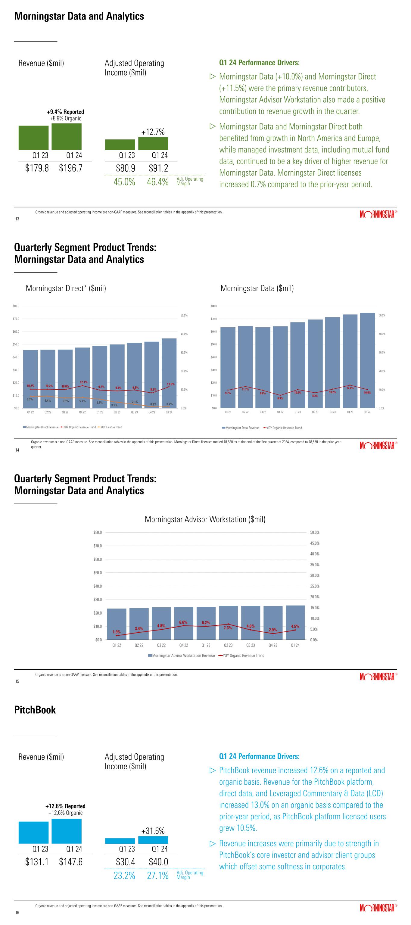 Morningstar Data and Analytics Q1 24Q1 23 Q1 24 Performance Drivers: Morningstar Data (+10.0%) and Morningstar Direct (+11.5%) were the primary revenue contributors. Morningstar Advisor Workstation also made a positive contribution to revenue growth in the quarter. Morningstar Data and Morningstar Direct both benefited from growth in North America and Europe, while managed investment data, including mutual fund data, continued to be a key driver of higher revenue for Morningstar Data. Morningstar Direct licenses increased 0.7% compared to the prior-year period. Organic revenue and adjusted operating income are non-GAAP measures. See reconciliation tables in the appendix of this presentation. $179.8 $196.7 13 13 Revenue ($mil) Q1 24Q1 23 $80.9 $91.2 Adjusted Operating Income ($mil) +12.7% 45.0% 46.4% Adj. Operating Margin +9.4% Reported +8.9% Organic Quarterly Segment Product Trends: Morningstar Data and Analytics Morningstar Direct* ($mil) 14 14 Morningstar Data ($mil) Organic revenue is a non-GAAP measure. See reconciliation tables in the appendix of this presentation. Morningstar Direct licenses totaled 18,680 as of the end of the first quarter of 2024, compared to 18,558 in the prior-year quarter. Quarterly Segment Product Trends: Morningstar Data and Analytics Morningstar Advisor Workstation ($mil) 15 15 Organic revenue is a non-GAAP measure. See reconciliation tables in the appendix of this presentation. PitchBook Q1 24Q1 23 Q1 24 Performance Drivers: PitchBook revenue increased 12.6% on a reported and organic basis. Revenue for the PitchBook platform, direct data, and Leveraged Commentary & Data (LCD) increased 13.0% on an organic basis compared to the prior-year period, as PitchBook platform licensed users grew 10.5%. Revenue increases were primarily due to strength in PitchBook’s core investor and advisor client groups which offset some softness in corporates. Organic revenue and adjusted operating income are non-GAAP measures. See reconciliation tables in the appendix of this presentation. $131.1 $147.6 16 16 Revenue ($mil) Q1 24Q1 23 $30.4 $40.0 Adjusted Operating Income ($mil) +31.6% 23.2% 27.1% Adj. Operating Margin +12.6% Reported +12.6% Organic