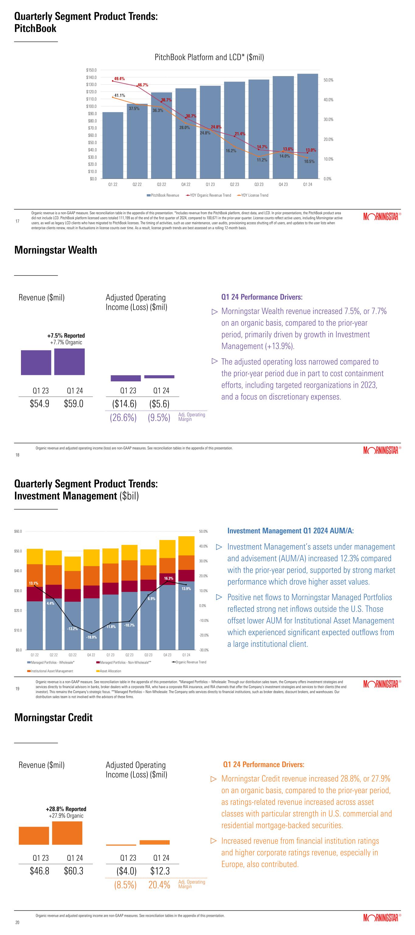 Quarterly Segment Product Trends: PitchBook PitchBook Platform and LCD* ($mil) 17 17 Organic revenue is a non-GAAP measure. See reconciliation table in the appendix of this presentation. *Includes revenue from the PitchBook platform, direct data, and LCD. In prior presentations, the PitchBook product area did not include LCD. PitchBook platform licensed users totaled 111,199 as of the end of the first quarter of 2024, compared to 100,671 in the prior-year quarter. License counts reflect active users, including Morningstar active users, as well as legacy LCD clients who have migrated to PitchBook licenses. The timing of activities, such as user maintenance, user audits, provisioning access shutting off of users, and updates to the user lists when enterprise clients renew, result in fluctuations in license counts over time. As a result, license growth trends are best assessed on a rolling 12-month basis. Morningstar Wealth Q1 24Q1 23 Q1 24 Performance Drivers: Morningstar Wealth revenue increased 7.5%, or 7.7% on an organic basis, compared to the prior-year period, primarily driven by growth in Investment Management (+13.9%). The adjusted operating loss narrowed compared to the prior-year period due in part to cost containment efforts, including targeted reorganizations in 2023, and a focus on discretionary expenses.   Organic revenue and adjusted operating income (loss) are non-GAAP measures. See reconciliation tables in the appendix of this presentation. $54.9 $59.0 18 18 Revenue ($mil) Q1 24Q1 23 ($14.6) ($5.6) Adjusted Operating Income (Loss) ($mil) (26.6%) (9.5%) Adj. Operating Margin +7.5% Reported +7.7% Organic Quarterly Segment Product Trends: Investment Management ($bil) Investment Management Q1 2024 AUM/A: Investment Management’s assets under management and advisement (AUM/A) increased 12.3% compared with the prior-year period, supported by strong market performance which drove higher asset values. Positive net flows to Morningstar Managed Portfolios reflected strong net inflows outside the U.S. Those offset lower AUM for Institutional Asset Management which experienced significant expected outflows from a large institutional client. Organic revenue is a non-GAAP measure. See reconciliation table in the appendix of this presentation. *Managed Portfolios – Wholesale: Through our distribution sales team, the Company offers investment strategies and services directly to financial advisors in banks, broker dealers with a corporate RIA, who have a corporate RIA insurance, and RIA channels that offer the Company’s investment strategies and services to their clients (the end investor). This remains the Company’s strategic focus. **Managed Portfolios – Non-Wholesale: The Company sells services directly to financial institutions, such as broker dealers, discount brokers, and warehouses. Our distribution sales team is not involved with the advisors of these firms. 19 19 Morningstar Credit Q1 24Q1 23 Q1 24 Performance Drivers: Morningstar Credit revenue increased 28.8%, or 27.9% on an organic basis, compared to the prior-year period, as ratings-related revenue increased across asset classes with particular strength in U.S. commercial and residential mortgage-backed securities. Increased revenue from financial institution ratings and higher corporate ratings revenue, especially in Europe, also contributed.   Organic revenue and adjusted operating income are non-GAAP measures. See reconciliation tables in the appendix of this presentation. $46.8 $60.3 20 20 Revenue ($mil) Q1 24Q1 23 ($4.0) $12.3 Adjusted Operating Income (Loss) ($mil)  (8.5%) 20.4% Adj. Operating Margin +28.8% Reported +27.9% Organic