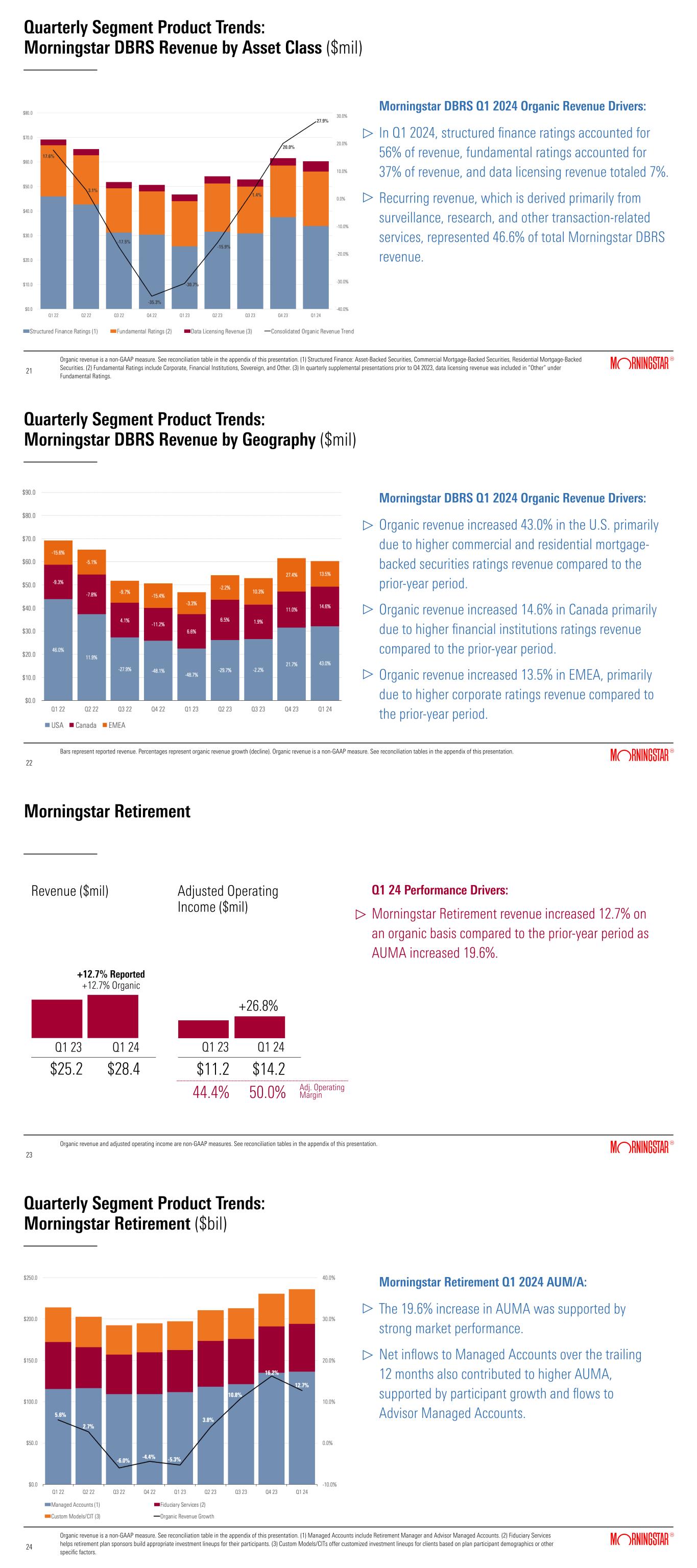 Quarterly Segment Product Trends: Morningstar DBRS Revenue by Asset Class ($mil) Morningstar DBRS Q1 2024 Organic Revenue Drivers: In Q1 2024, structured finance ratings accounted for 56% of revenue, fundamental ratings accounted for 37% of revenue, and data licensing revenue totaled 7%. Recurring revenue, which is derived primarily from surveillance, research, and other transaction-related services, represented 46.6% of total Morningstar DBRS revenue. Organic revenue is a non-GAAP measure. See reconciliation table in the appendix of this presentation. (1) Structured Finance: Asset-Backed Securities, Commercial Mortgage-Backed Securities, Residential Mortgage-Backed Securities. (2) Fundamental Ratings include Corporate, Financial Institutions, Sovereign, and Other. (3) In quarterly supplemental presentations prior to Q4 2023, data licensing revenue was included in “Other” under Fundamental Ratings. 21 21 Quarterly Segment Product Trends: Morningstar DBRS Revenue by Geography ($mil) Morningstar DBRS Q1 2024 Organic Revenue Drivers: Organic revenue increased 43.0% in the U.S. primarily due to higher commercial and residential mortgage- backed securities ratings revenue compared to the prior-year period. Organic revenue increased 14.6% in Canada primarily due to higher financial institutions ratings revenue compared to the prior-year period. Organic revenue increased 13.5% in EMEA, primarily due to higher corporate ratings revenue compared to the prior-year period. Bars represent reported revenue. Percentages represent organic revenue growth (decline). Organic revenue is a non-GAAP measure. See reconciliation tables in the appendix of this presentation. 22 22 Morningstar Retirement Q1 24Q1 23 Q1 24 Performance Drivers: Morningstar Retirement revenue increased 12.7% on an organic basis compared to the prior-year period as AUMA increased 19.6%. $25.2 $28.4 23 23 Revenue ($mil) Q1 24Q1 23 $11.2 $14.2 Adjusted Operating Income ($mil) +26.8% 44.4% 50.0% Adj. Operating Margin +12.7% Reported +12.7% Organic Organic revenue and adjusted operating income are non-GAAP measures. See reconciliation tables in the appendix of this presentation. Morningstar Retirement Q1 2024 AUM/A: The 19.6% increase in AUMA was supported by strong market performance. Net inflows to Managed Accounts over the trailing 12 months also contributed to higher AUMA, supported by participant growth and flows to Advisor Managed Accounts. Quarterly Segment Product Trends: Morningstar Retirement ($bil) Organic revenue is a non-GAAP measure. See reconciliation table in the appendix of this presentation. (1) Managed Accounts include Retirement Manager and Advisor Managed Accounts. (2) Fiduciary Services helps retirement plan sponsors build appropriate investment lineups for their participants. (3) Custom Models/CITs offer customized investment lineups for clients based on plan participant demographics or other specific factors. 24 24