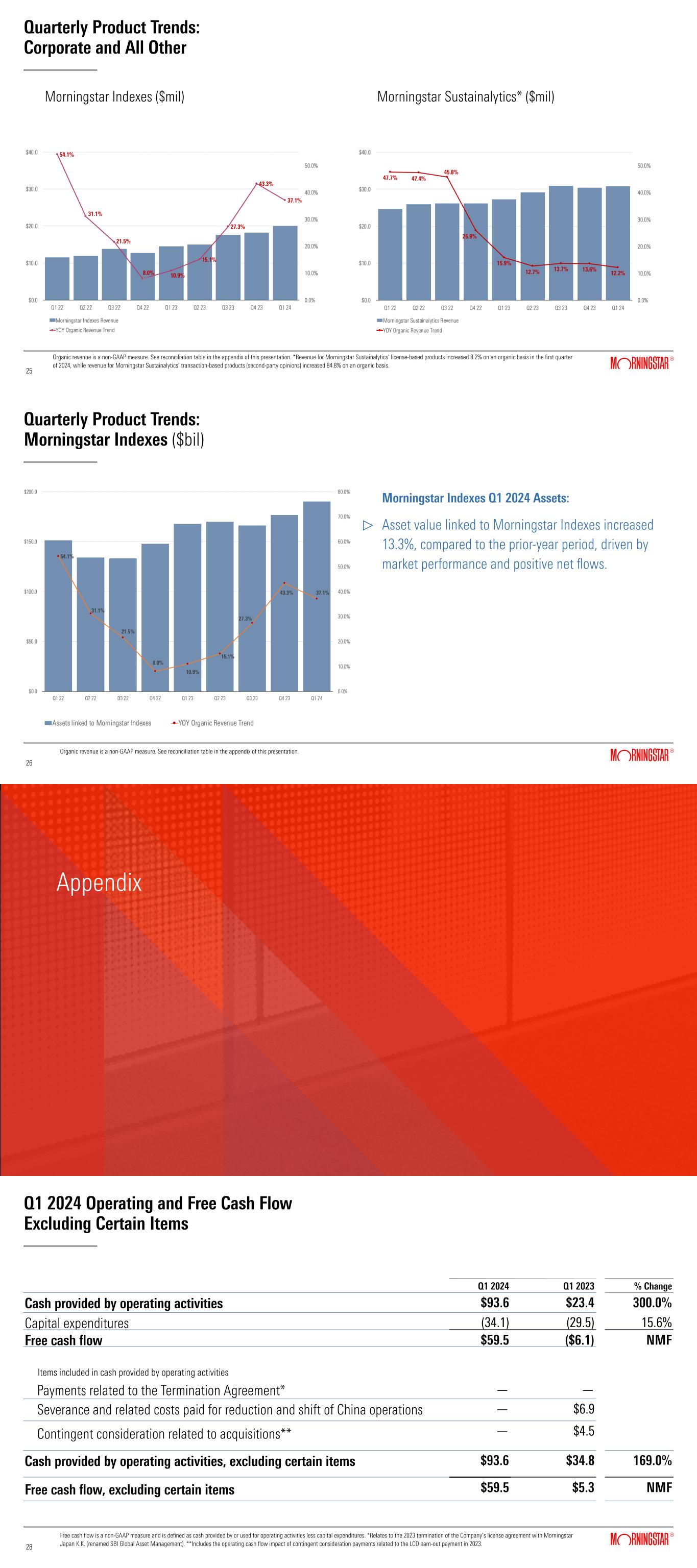 Quarterly Product Trends: Corporate and All Other Morningstar Sustainalytics* ($mil) 25 25 Morningstar Indexes ($mil) Organic revenue is a non-GAAP measure. See reconciliation table in the appendix of this presentation. *Revenue for Morningstar Sustainalytics’ license-based products increased 8.2% on an organic basis in the first quarter of 2024, while revenue for Morningstar Sustainalytics’ transaction-based products (second-party opinions) increased 84.8% on an organic basis. Quarterly Product Trends: Morningstar Indexes ($bil) 26 26 Organic revenue is a non-GAAP measure. See reconciliation table in the appendix of this presentation. Morningstar Indexes Q1 2024 Assets: Asset value linked to Morningstar Indexes increased 13.3%, compared to the prior-year period, driven by market performance and positive net flows. Appendix Q1 2024 Operating and Free Cash Flow Excluding Certain Items Free cash flow is a non-GAAP measure and is defined as cash provided by or used for operating activities less capital expenditures. *Relates to the 2023 termination of the Company’s license agreement with Morningstar Japan K.K. (renamed SBI Global Asset Management). **Includes the operating cash flow impact of contingent consideration payments related to the LCD earn-out payment in 2023. Q1 2024 Q1 2023 % Change Cash provided by operating activities $93.6 $23.4 300.0% Capital expenditures (34.1) (29.5) 15.6% Free cash flow $59.5 ($6.1) NMF Items included in cash provided by operating activities Payments related to the Termination Agreement* — — Severance and related costs paid for reduction and shift of China operations S — $6.9 Contingent consideration related to acquisitions** — $4.5 Cash provided by operating activities, excluding certain items $93.6 $34.8 169.0% Free cash flow, excluding certain items $59.5 $5.3 NMF 28 28