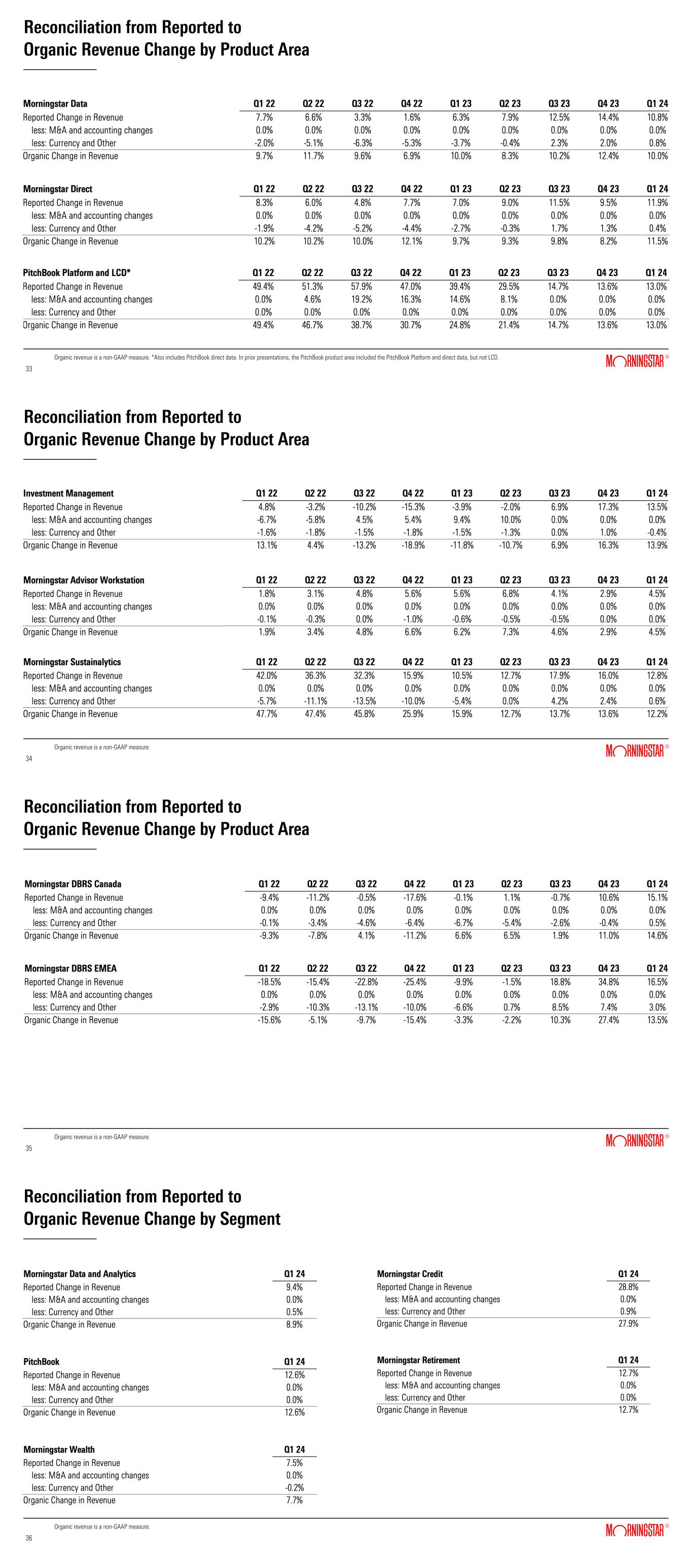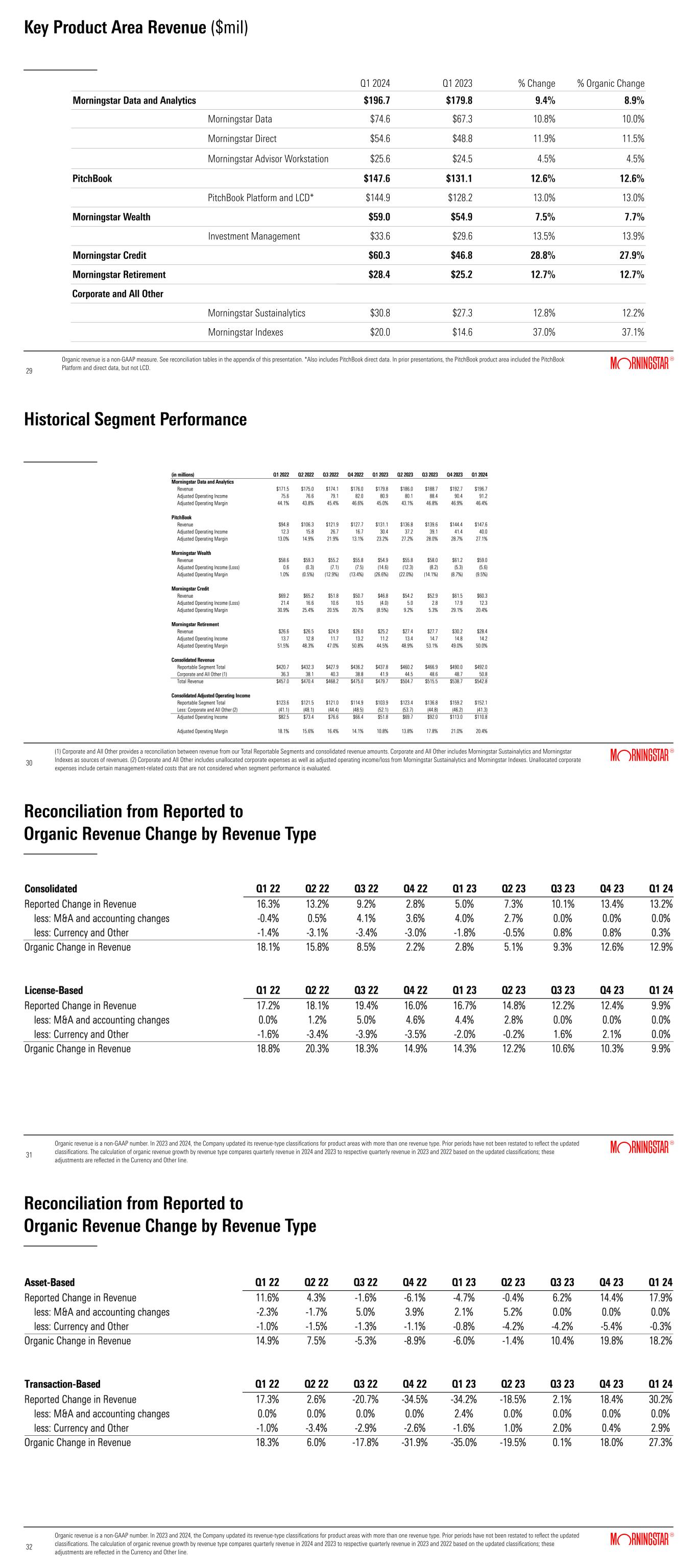 Key Product Area Revenue ($mil) 29 29 Q1 2024 Q1 2023 % Change % Organic Change Morningstar Data and Analytics $196.7 $179.8 9.4% 8.9% Morningstar Data $74.6 $67.3 10.8% 10.0% Morningstar Direct $54.6 $48.8 11.9% 11.5% Morningstar Advisor Workstation $25.6 $24.5 4.5% 4.5% PitchBook $147.6 $131.1 12.6% 12.6% PitchBook Platform and LCD* $144.9 $128.2 13.0% 13.0% Morningstar Wealth $59.0 $54.9 7.5% 7.7% Investment Management $33.6 $29.6 13.5% 13.9% Morningstar Credit $60.3 $46.8 28.8% 27.9% Morningstar Retirement $28.4 $25.2 12.7% 12.7% Corporate and All Other Morningstar Sustainalytics $30.8 $27.3 12.8% 12.2% Morningstar Indexes $20.0 $14.6 37.0% 37.1% Organic revenue is a non-GAAP measure. See reconciliation tables in the appendix of this presentation. *Also includes PitchBook direct data. In prior presentations, the PitchBook product area included the PitchBook Platform and direct data, but not LCD. 30 30 Historical Segment Performance (1) Corporate and All Other provides a reconciliation between revenue from our Total Reportable Segments and consolidated revenue amounts. Corporate and All Other includes Morningstar Sustainalytics and Morningstar Indexes as sources of revenues. (2) Corporate and All Other includes unallocated corporate expenses as well as adjusted operating income/loss from Morningstar Sustainalytics and Morningstar Indexes. Unallocated corporate expenses include certain management-related costs that are not considered when segment performance is evaluated. Reconciliation from Reported to Organic Revenue Change by Revenue Type 31 31 Organic revenue is a non-GAAP number. In 2023 and 2024, the Company updated its revenue-type classifications for product areas with more than one revenue type. Prior periods have not been restated to reflect the updated classifications. The calculation of organic revenue growth by revenue type compares quarterly revenue in 2024 and 2023 to respective quarterly revenue in 2023 and 2022 based on the updated classifications; these adjustments are reflected in the Currency and Other line. Reconciliation from Reported to Organic Revenue Change by Revenue Type 32 32 Organic revenue is a non-GAAP number. In 2023 and 2024, the Company updated its revenue-type classifications for product areas with more than one revenue type. Prior periods have not been restated to reflect the updated classifications. The calculation of organic revenue growth by revenue type compares quarterly revenue in 2024 and 2023 to respective quarterly revenue in 2023 and 2022 based on the updated classifications; these adjustments are reflected in the Currency and Other line.