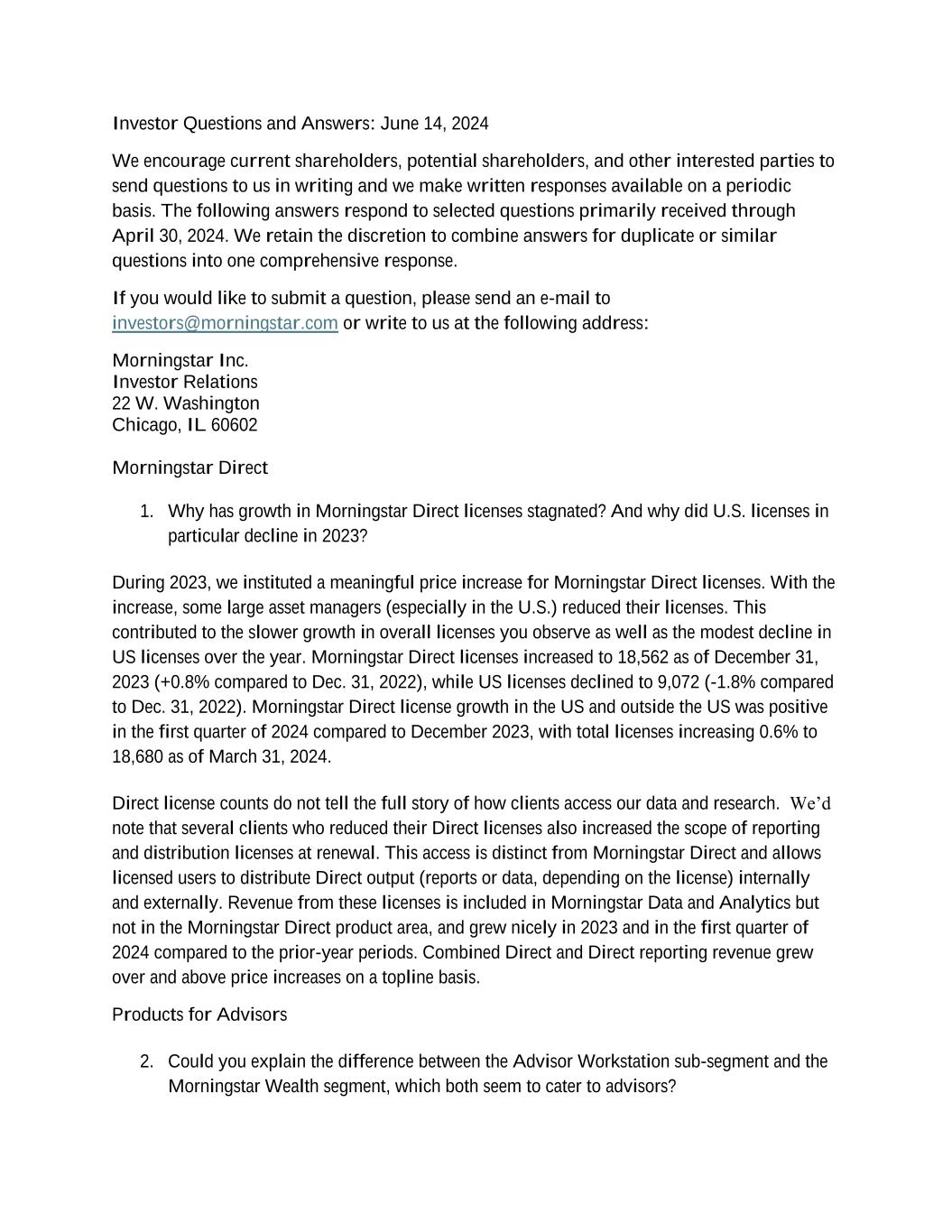 Investor Questions and Answers: June 14, 2024 We encourage current shareholders, potential shareholders, and other interested parties to send questions to us in writing and we make written responses available on a periodic basis. The following answers respond to selected questions primarily received through April 30, 2024. We retain the discretion to combine answers for duplicate or similar questions into one comprehensive response. If you would like to submit a question, please send an e-mail to investors@morningstar.com or write to us at the following address: Morningstar Inc. Investor Relations 22 W. Washington Chicago, IL 60602 Morningstar Direct 1. Why has growth in Morningstar Direct licenses stagnated? And why did U.S. licenses in particular decline in 2023? During 2023, we instituted a meaningful price increase for Morningstar Direct licenses. With the increase, some large asset managers (especially in the U.S.) reduced their licenses. This contributed to the slower growth in overall licenses you observe as well as the modest decline in US licenses over the year. Morningstar Direct licenses increased to 18,562 as of December 31, 2023 (+0.8% compared to Dec. 31, 2022), while US licenses declined to 9,072 (-1.8% compared to Dec. 31, 2022). Morningstar Direct license growth in the US and outside the US was positive in the first quarter of 2024 compared to December 2023, with total licenses increasing 0.6% to 18,680 as of March 31, 2024. Direct license counts do not tell the full story of how clients access our data and research. We’d note that several clients who reduced their Direct licenses also increased the scope of reporting and distribution licenses at renewal. This access is distinct from Morningstar Direct and allows licensed users to distribute Direct output (reports or data, depending on the license) internally and externally. Revenue from these licenses is included in Morningstar Data and Analytics but not in the Morningstar Direct product area, and grew nicely in 2023 and in the first quarter of 2024 compared to the prior-year periods. Combined Direct and Direct reporting revenue grew over and above price increases on a topline basis. Products for Advisors 2. Could you explain the difference between the Advisor Workstation sub-segment and the Morningstar Wealth segment, which both seem to cater to advisors?