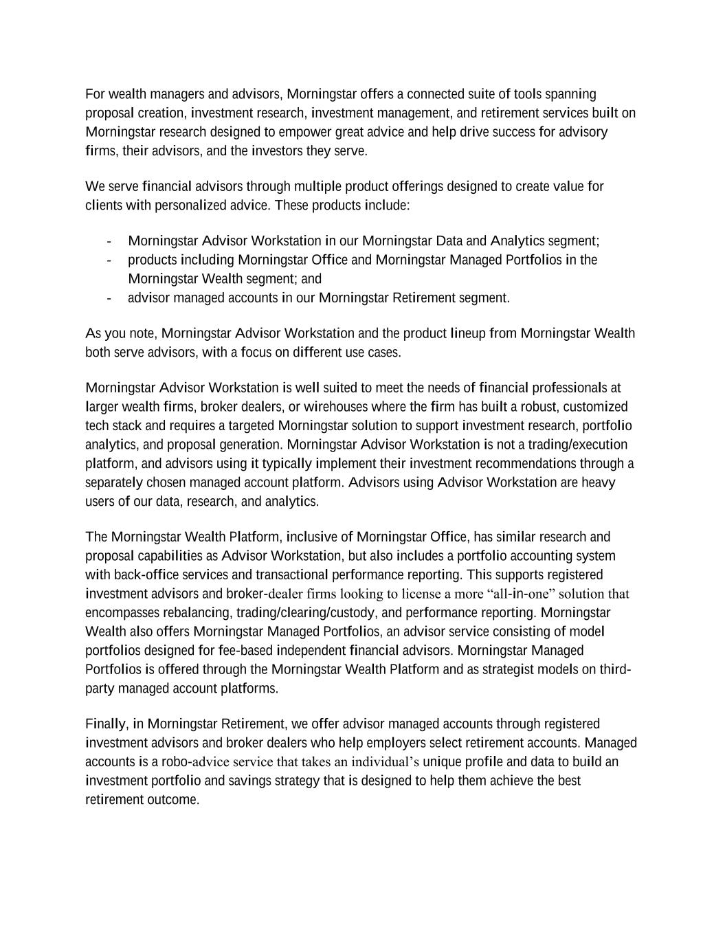 For wealth managers and advisors, Morningstar offers a connected suite of tools spanning proposal creation, investment research, investment management, and retirement services built on Morningstar research designed to empower great advice and help drive success for advisory firms, their advisors, and the investors they serve. We serve financial advisors through multiple product offerings designed to create value for clients with personalized advice. These products include: - Morningstar Advisor Workstation in our Morningstar Data and Analytics segment; - products including Morningstar Office and Morningstar Managed Portfolios in the Morningstar Wealth segment; and - advisor managed accounts in our Morningstar Retirement segment. As you note, Morningstar Advisor Workstation and the product lineup from Morningstar Wealth both serve advisors, with a focus on different use cases. Morningstar Advisor Workstation is well suited to meet the needs of financial professionals at larger wealth firms, broker dealers, or wirehouses where the firm has built a robust, customized tech stack and requires a targeted Morningstar solution to support investment research, portfolio analytics, and proposal generation. Morningstar Advisor Workstation is not a trading/execution platform, and advisors using it typically implement their investment recommendations through a separately chosen managed account platform. Advisors using Advisor Workstation are heavy users of our data, research, and analytics. The Morningstar Wealth Platform, inclusive of Morningstar Office, has similar research and proposal capabilities as Advisor Workstation, but also includes a portfolio accounting system with back-office services and transactional performance reporting. This supports registered investment advisors and broker-dealer firms looking to license a more “all-in-one” solution that encompasses rebalancing, trading/clearing/custody, and performance reporting. Morningstar Wealth also offers Morningstar Managed Portfolios, an advisor service consisting of model portfolios designed for fee-based independent financial advisors. Morningstar Managed Portfolios is offered through the Morningstar Wealth Platform and as strategist models on third- party managed account platforms. Finally, in Morningstar Retirement, we offer advisor managed accounts through registered investment advisors and broker dealers who help employers select retirement accounts. Managed accounts is a robo-advice service that takes an individual’s unique profile and data to build an investment portfolio and savings strategy that is designed to help them achieve the best retirement outcome.