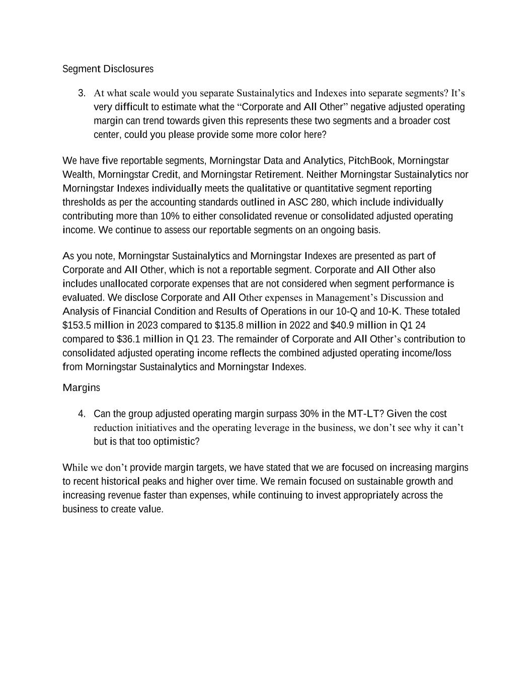 Segment Disclosures 3. At what scale would you separate Sustainalytics and Indexes into separate segments? It’s very difficult to estimate what the “Corporate and All Other” negative adjusted operating margin can trend towards given this represents these two segments and a broader cost center, could you please provide some more color here? We have five reportable segments, Morningstar Data and Analytics, PitchBook, Morningstar Wealth, Morningstar Credit, and Morningstar Retirement. Neither Morningstar Sustainalytics nor Morningstar Indexes individually meets the qualitative or quantitative segment reporting thresholds as per the accounting standards outlined in ASC 280, which include individually contributing more than 10% to either consolidated revenue or consolidated adjusted operating income. We continue to assess our reportable segments on an ongoing basis. As you note, Morningstar Sustainalytics and Morningstar Indexes are presented as part of Corporate and All Other, which is not a reportable segment. Corporate and All Other also includes unallocated corporate expenses that are not considered when segment performance is evaluated. We disclose Corporate and All Other expenses in Management’s Discussion and Analysis of Financial Condition and Results of Operations in our 10-Q and 10-K. These totaled $153.5 million in 2023 compared to $135.8 million in 2022 and $40.9 million in Q1 24 compared to $36.1 million in Q1 23. The remainder of Corporate and All Other’s contribution to consolidated adjusted operating income reflects the combined adjusted operating income/loss from Morningstar Sustainalytics and Morningstar Indexes. Margins 4. Can the group adjusted operating margin surpass 30% in the MT-LT? Given the cost reduction initiatives and the operating leverage in the business, we don’t see why it can’t but is that too optimistic? While we don’t provide margin targets, we have stated that we are focused on increasing margins to recent historical peaks and higher over time. We remain focused on sustainable growth and increasing revenue faster than expenses, while continuing to invest appropriately across the business to create value.