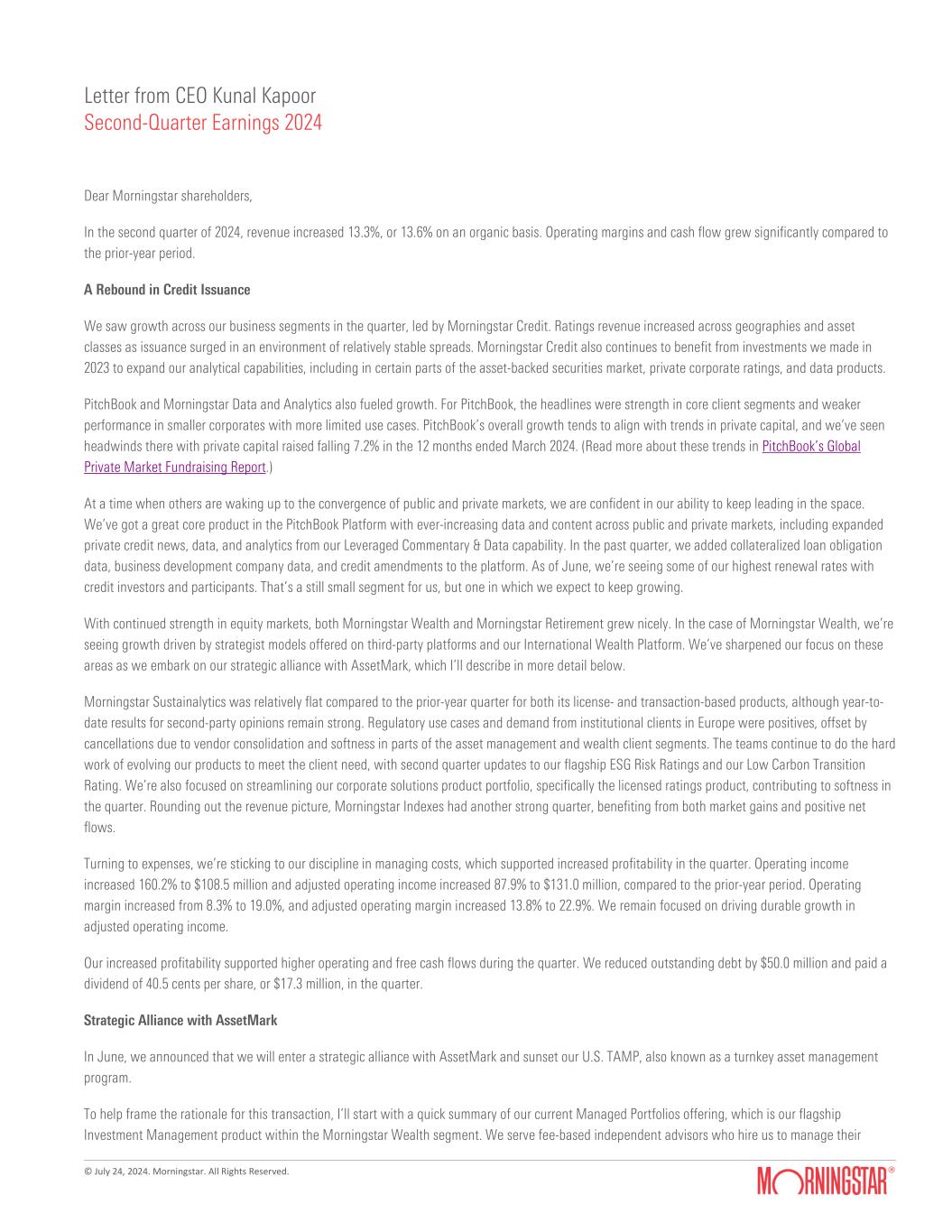 © July 24, 2024. Morningstar. All Rights Reserved. Letter from CEO Kunal Kapoor Second-Quarter Earnings 2024 Dear Morningstar shareholders, In the second quarter of 2024, revenue increased 13.3%, or 13.6% on an organic basis. Operating margins and cash flow grew significantly compared to the prior-year period. A Rebound in Credit Issuance We saw growth across our business segments in the quarter, led by Morningstar Credit. Ratings revenue increased across geographies and asset classes as issuance surged in an environment of relatively stable spreads. Morningstar Credit also continues to benefit from investments we made in 2023 to expand our analytical capabilities, including in certain parts of the asset-backed securities market, private corporate ratings, and data products. PitchBook and Morningstar Data and Analytics also fueled growth. For PitchBook, the headlines were strength in core client segments and weaker performance in smaller corporates with more limited use cases. PitchBook’s overall growth tends to align with trends in private capital, and we’ve seen headwinds there with private capital raised falling 7.2% in the 12 months ended March 2024. (Read more about these trends in PitchBook’s Global Private Market Fundraising Report.) At a time when others are waking up to the convergence of public and private markets, we are confident in our ability to keep leading in the space. We’ve got a great core product in the PitchBook Platform with ever-increasing data and content across public and private markets, including expanded private credit news, data, and analytics from our Leveraged Commentary & Data capability. In the past quarter, we added collateralized loan obligation data, business development company data, and credit amendments to the platform. As of June, we’re seeing some of our highest renewal rates with credit investors and participants. That’s a still small segment for us, but one in which we expect to keep growing. With continued strength in equity markets, both Morningstar Wealth and Morningstar Retirement grew nicely. In the case of Morningstar Wealth, we’re seeing growth driven by strategist models offered on third-party platforms and our International Wealth Platform. We’ve sharpened our focus on these areas as we embark on our strategic alliance with AssetMark, which I’ll describe in more detail below. Morningstar Sustainalytics was relatively flat compared to the prior-year quarter for both its license- and transaction-based products, although year-to- date results for second-party opinions remain strong. Regulatory use cases and demand from institutional clients in Europe were positives, offset by cancellations due to vendor consolidation and softness in parts of the asset management and wealth client segments. The teams continue to do the hard work of evolving our products to meet the client need, with second quarter updates to our flagship ESG Risk Ratings and our Low Carbon Transition Rating. We’re also focused on streamlining our corporate solutions product portfolio, specifically the licensed ratings product, contributing to softness in the quarter. Rounding out the revenue picture, Morningstar Indexes had another strong quarter, benefiting from both market gains and positive net flows. Turning to expenses, we’re sticking to our discipline in managing costs, which supported increased profitability in the quarter. Operating income increased 160.2% to $108.5 million and adjusted operating income increased 87.9% to $131.0 million, compared to the prior-year period. Operating margin increased from 8.3% to 19.0%, and adjusted operating margin increased 13.8% to 22.9%. We remain focused on driving durable growth in adjusted operating income. Our increased profitability supported higher operating and free cash flows during the quarter. We reduced outstanding debt by $50.0 million and paid a dividend of 40.5 cents per share, or $17.3 million, in the quarter. Strategic Alliance with AssetMark In June, we announced that we will enter a strategic alliance with AssetMark and sunset our U.S. TAMP, also known as a turnkey asset management program. To help frame the rationale for this transaction, I’ll start with a quick summary of our current Managed Portfolios offering, which is our flagship Investment Management product within the Morningstar Wealth segment. We serve fee-based independent advisors who hire us to manage their