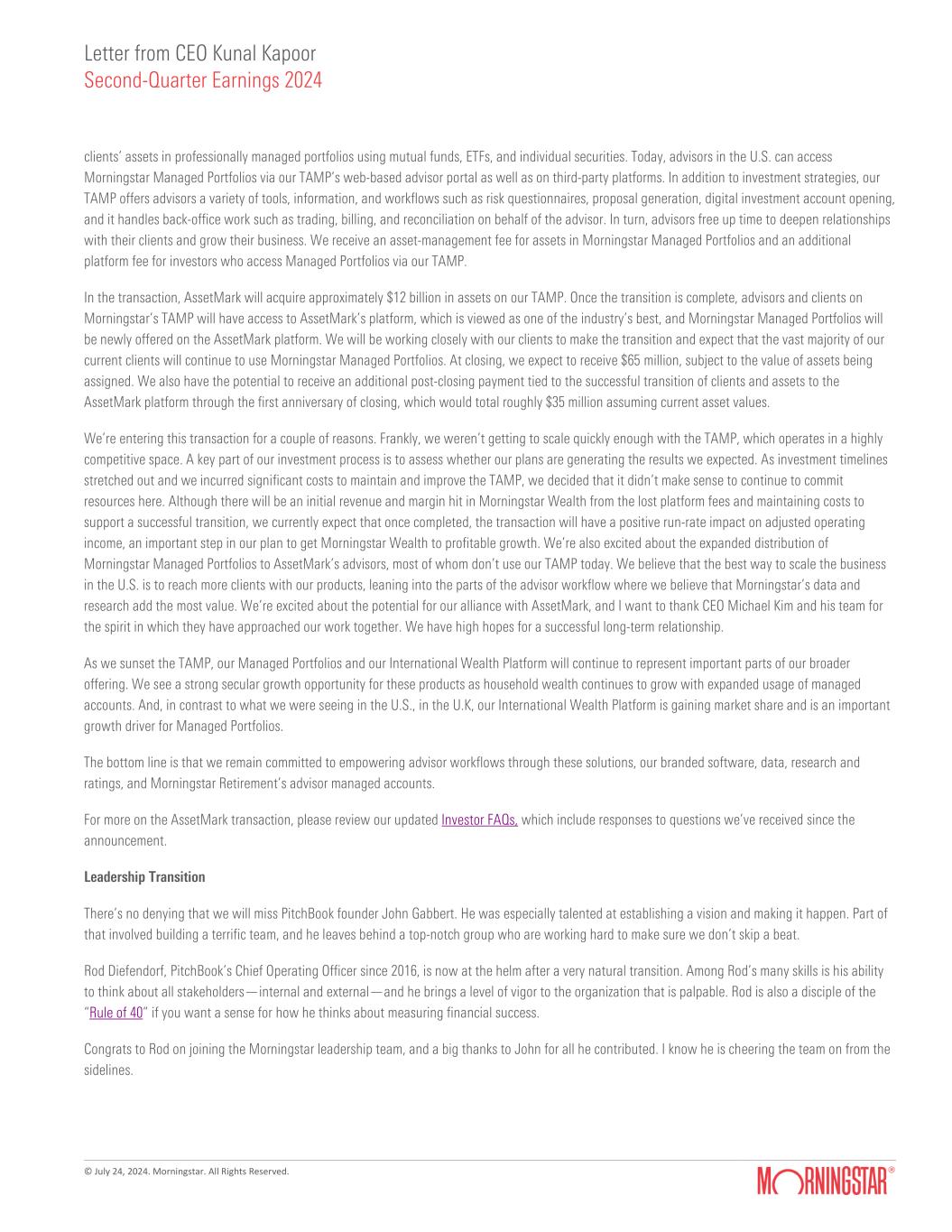 Letter from CEO Kunal Kapoor Second-Quarter Earnings 2024 © July 24, 2024. Morningstar. All Rights Reserved. clients’ assets in professionally managed portfolios using mutual funds, ETFs, and individual securities. Today, advisors in the U.S. can access Morningstar Managed Portfolios via our TAMP’s web-based advisor portal as well as on third-party platforms. In addition to investment strategies, our TAMP offers advisors a variety of tools, information, and workflows such as risk questionnaires, proposal generation, digital investment account opening, and it handles back-office work such as trading, billing, and reconciliation on behalf of the advisor. In turn, advisors free up time to deepen relationships with their clients and grow their business. We receive an asset-management fee for assets in Morningstar Managed Portfolios and an additional platform fee for investors who access Managed Portfolios via our TAMP. In the transaction, AssetMark will acquire approximately $12 billion in assets on our TAMP. Once the transition is complete, advisors and clients on Morningstar’s TAMP will have access to AssetMark’s platform, which is viewed as one of the industry’s best, and Morningstar Managed Portfolios will be newly offered on the AssetMark platform. We will be working closely with our clients to make the transition and expect that the vast majority of our current clients will continue to use Morningstar Managed Portfolios. At closing, we expect to receive $65 million, subject to the value of assets being assigned. We also have the potential to receive an additional post-closing payment tied to the successful transition of clients and assets to the AssetMark platform through the first anniversary of closing, which would total roughly $35 million assuming current asset values. We’re entering this transaction for a couple of reasons. Frankly, we weren’t getting to scale quickly enough with the TAMP, which operates in a highly competitive space. A key part of our investment process is to assess whether our plans are generating the results we expected. As investment timelines stretched out and we incurred significant costs to maintain and improve the TAMP, we decided that it didn’t make sense to continue to commit resources here. Although there will be an initial revenue and margin hit in Morningstar Wealth from the lost platform fees and maintaining costs to support a successful transition, we currently expect that once completed, the transaction will have a positive run-rate impact on adjusted operating income, an important step in our plan to get Morningstar Wealth to profitable growth. We’re also excited about the expanded distribution of Morningstar Managed Portfolios to AssetMark’s advisors, most of whom don’t use our TAMP today. We believe that the best way to scale the business in the U.S. is to reach more clients with our products, leaning into the parts of the advisor workflow where we believe that Morningstar’s data and research add the most value. We’re excited about the potential for our alliance with AssetMark, and I want to thank CEO Michael Kim and his team for the spirit in which they have approached our work together. We have high hopes for a successful long-term relationship. As we sunset the TAMP, our Managed Portfolios and our International Wealth Platform will continue to represent important parts of our broader offering. We see a strong secular growth opportunity for these products as household wealth continues to grow with expanded usage of managed accounts. And, in contrast to what we were seeing in the U.S., in the U.K, our International Wealth Platform is gaining market share and is an important growth driver for Managed Portfolios. The bottom line is that we remain committed to empowering advisor workflows through these solutions, our branded software, data, research and ratings, and Morningstar Retirement’s advisor managed accounts. For more on the AssetMark transaction, please review our updated Investor FAQs, which include responses to questions we’ve received since the announcement. Leadership Transition There’s no denying that we will miss PitchBook founder John Gabbert. He was especially talented at establishing a vision and making it happen. Part of that involved building a terrific team, and he leaves behind a top-notch group who are working hard to make sure we don’t skip a beat. Rod Diefendorf, PitchBook’s Chief Operating Officer since 2016, is now at the helm after a very natural transition. Among Rod’s many skills is his ability to think about all stakeholders—internal and external—and he brings a level of vigor to the organization that is palpable. Rod is also a disciple of the “Rule of 40” if you want a sense for how he thinks about measuring financial success. Congrats to Rod on joining the Morningstar leadership team, and a big thanks to John for all he contributed. I know he is cheering the team on from the sidelines.