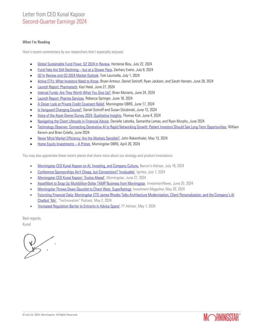 Letter from CEO Kunal Kapoor Second-Quarter Earnings 2024 © July 24, 2024. Morningstar. All Rights Reserved. What I'm Reading Here’s recent commentary by our researchers that I especially enjoyed: • Global Sustainable Fund Flows: Q2 2024 in Review, Hortense Bioy, July 22, 2024 • Fund Fees Are Still Declining—but at a Slower Pace, Zachary Evens, July 9, 2024 • Q2 In Review and Q3 2024 Market Outlook, Tom Lauricella, July 1, 2024 • Active ETFs: What Investors Need to Know, Bryan Armour, Daniel Sotiroff, Ryan Jackson, and Sarah Hansen, June 28, 2024 • Launch Report: Pharmatech, Kazi Helal, June 27, 2024 • Interval Funds: Are They Worth What You Give Up?, Brian Moriarty, June 24, 2024 • Launch Report: Pharma Services, Rebecca Springer, June 18, 2024 • A Closer Look at Private Credit Covenant Relief, Morningstar DBRS, June 17, 2024 • Is Vanguard Changing Course?, Daniel Sotiroff and Susan Dziubinski, June 12, 2024 • Voice of the Asset Owner Survey 2024: Qualitative Insights, Thomas Kuh, June 4, 2024 • Navigating the Client Lifecycle in Financial Advice, Danielle Labotka, Samantha Lamas, and Ryan Murphy, June 2024 • Technology Observer: Connecting Generative AI to Rapid Networking Growth: Patient Investors Should See Long-Term Opportunities, William Kerwin and Brian Colello, June 2024 • Never Mind Market Efficiency: Are the Markets Sensible?, John Rekenthaler, May 13, 2024 • Home Equity Investments—A Primer, Morningstar DBRS, April 26, 2024 You may also appreciate these recent pieces that share more about our strategy and product innovations: • Morningstar CEO Kunal Kapoor on AI, Investing, and Company Culture, Barron’s Advisor, July 16, 2024 • Conference Sponsorships Ain't Cheap, but Connections? 'Invaluable', Ignites, July 1, 2024 • Morningstar CEO Kunal Kapoor: ‘Evolve Ahead’, Morningstar, June 27, 2024 • AssetMark to Snap Up Multibillion-Dollar TAMP Business from Morningstar, InvestmentNews, June 20, 2024 • Morningstar Throws Down Gauntlet to Chant West, SuperRatings, Investment Magazine, May 29, 2024 • Futurizing Financial Data: Morningstar CTO James Rhodes Talks Architecture Modernization, Client Personalization, and the Company’s AI Chatbot ‘Mo’, “Technovation” Podcast, May 2, 2024 • 'Increased Regulation Barrier to Entrants in Advice Space', FT Adviser, May 1, 2024 Best regards, Kunal
