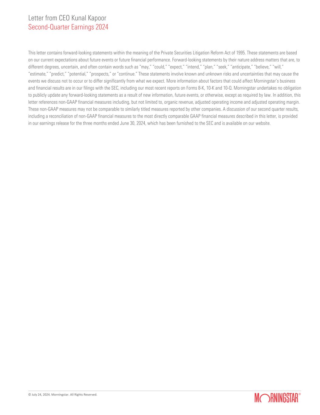 Letter from CEO Kunal Kapoor Second-Quarter Earnings 2024 © July 24, 2024. Morningstar. All Rights Reserved. This letter contains forward-looking statements within the meaning of the Private Securities Litigation Reform Act of 1995. These statements are based on our current expectations about future events or future financial performance. Forward-looking statements by their nature address matters that are, to different degrees, uncertain, and often contain words such as “may,” “could,” “expect,” “intend,” “plan,” “seek,” “anticipate,” “believe,” “will,” “estimate,” “predict,” “potential,” “prospects,” or “continue.” These statements involve known and unknown risks and uncertainties that may cause the events we discuss not to occur or to differ significantly from what we expect. More information about factors that could affect Morningstar’s business and financial results are in our filings with the SEC, including our most recent reports on Forms 8-K, 10-K and 10-Q. Morningstar undertakes no obligation to publicly update any forward-looking statements as a result of new information, future events, or otherwise, except as required by law. In addition, this letter references non-GAAP financial measures including, but not limited to, organic revenue, adjusted operating income and adjusted operating margin. These non-GAAP measures may not be comparable to similarly titled measures reported by other companies. A discussion of our second quarter results, including a reconciliation of non-GAAP financial measures to the most directly comparable GAAP financial measures described in this letter, is provided in our earnings release for the three months ended June 30, 2024, which has been furnished to the SEC and is available on our website.