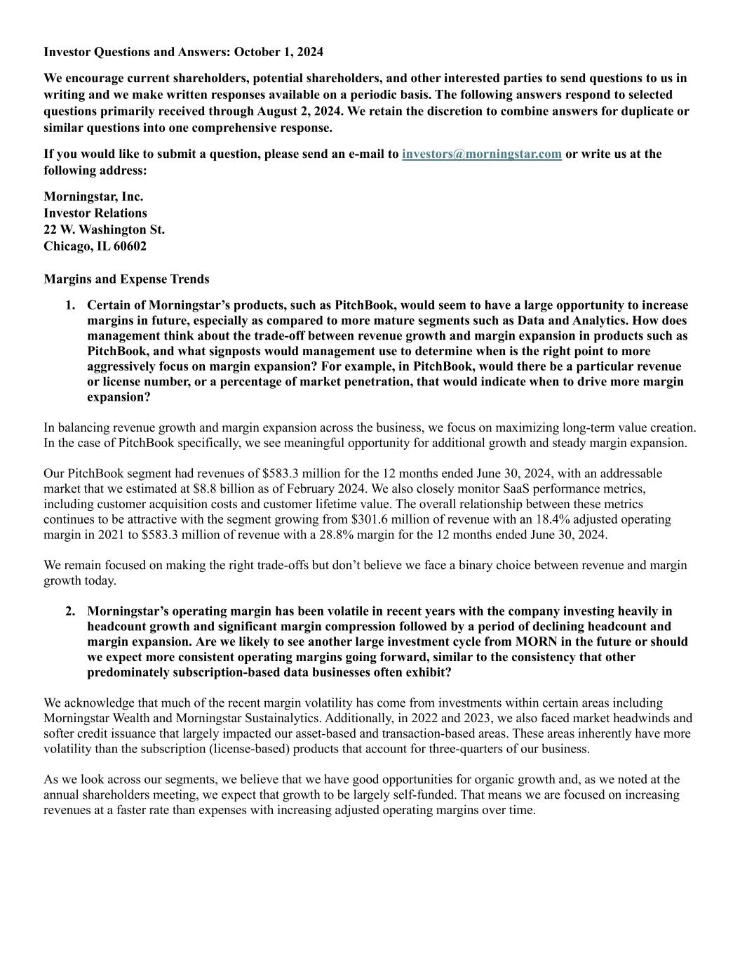 Investor Questions and Answers: October 1, 2024 We encourage current shareholders, potential shareholders, and other interested parties to send questions to us in writing and we make written responses available on a periodic basis. The following answers respond to selected questions primarily received through August 2, 2024. We retain the discretion to combine answers for duplicate or similar questions into one comprehensive response. If you would like to submit a question, please send an e-mail to investors@morningstar.com or write us at the following address: Morningstar, Inc. Investor Relations 22 W. Washington St. Chicago, IL 60602 Margins and Expense Trends 1. Certain of Morningstar’s products, such as PitchBook, would seem to have a large opportunity to increase margins in future, especially as compared to more mature segments such as Data and Analytics. How does management think about the trade-off between revenue growth and margin expansion in products such as PitchBook, and what signposts would management use to determine when is the right point to more aggressively focus on margin expansion? For example, in PitchBook, would there be a particular revenue or license number, or a percentage of market penetration, that would indicate when to drive more margin expansion? In balancing revenue growth and margin expansion across the business, we focus on maximizing long-term value creation. In the case of PitchBook specifically, we see meaningful opportunity for additional growth and steady margin expansion. Our PitchBook segment had revenues of $583.3 million for the 12 months ended June 30, 2024, with an addressable market that we estimated at $8.8 billion as of February 2024. We also closely monitor SaaS performance metrics, including customer acquisition costs and customer lifetime value. The overall relationship between these metrics continues to be attractive with the segment growing from $301.6 million of revenue with an 18.4% adjusted operating margin in 2021 to $583.3 million of revenue with a 28.8% margin for the 12 months ended June 30, 2024. We remain focused on making the right trade-offs but don’t believe we face a binary choice between revenue and margin growth today. 2. Morningstar’s operating margin has been volatile in recent years with the company investing heavily in headcount growth and significant margin compression followed by a period of declining headcount and margin expansion. Are we likely to see another large investment cycle from MORN in the future or should we expect more consistent operating margins going forward, similar to the consistency that other predominately subscription-based data businesses often exhibit? We acknowledge that much of the recent margin volatility has come from investments within certain areas including Morningstar Wealth and Morningstar Sustainalytics. Additionally, in 2022 and 2023, we also faced market headwinds and softer credit issuance that largely impacted our asset-based and transaction-based areas. These areas inherently have more volatility than the subscription (license-based) products that account for three-quarters of our business. As we look across our segments, we believe that we have good opportunities for organic growth and, as we noted at the annual shareholders meeting, we expect that growth to be largely self-funded. That means we are focused on increasing revenues at a faster rate than expenses with increasing adjusted operating margins over time.