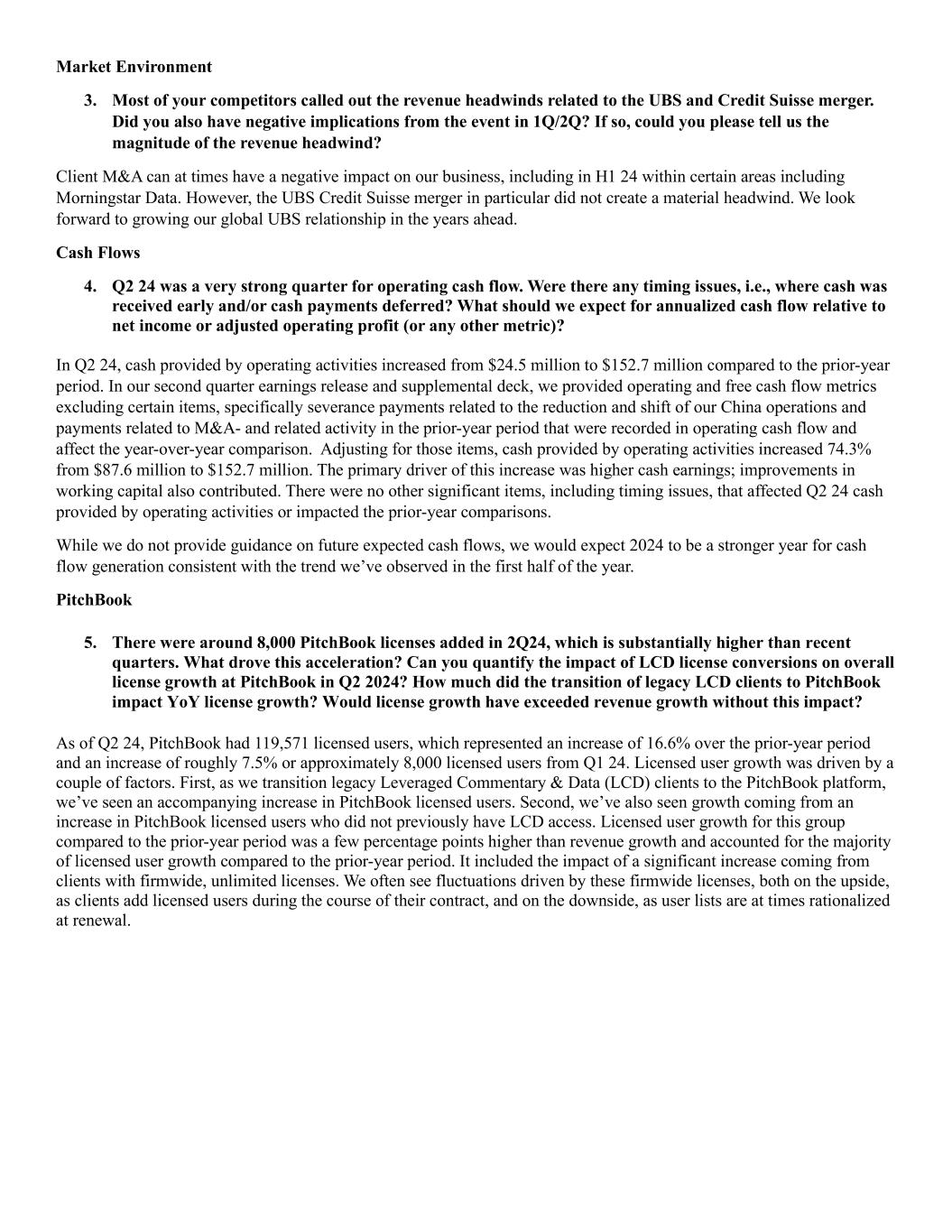 Market Environment 3. Most of your competitors called out the revenue headwinds related to the UBS and Credit Suisse merger. Did you also have negative implications from the event in 1Q/2Q? If so, could you please tell us the magnitude of the revenue headwind? Client M&A can at times have a negative impact on our business, including in H1 24 within certain areas including Morningstar Data. However, the UBS Credit Suisse merger in particular did not create a material headwind. We look forward to growing our global UBS relationship in the years ahead. Cash Flows 4. Q2 24 was a very strong quarter for operating cash flow. Were there any timing issues, i.e., where cash was received early and/or cash payments deferred? What should we expect for annualized cash flow relative to net income or adjusted operating profit (or any other metric)? In Q2 24, cash provided by operating activities increased from $24.5 million to $152.7 million compared to the prior-year period. In our second quarter earnings release and supplemental deck, we provided operating and free cash flow metrics excluding certain items, specifically severance payments related to the reduction and shift of our China operations and payments related to M&A- and related activity in the prior-year period that were recorded in operating cash flow and affect the year-over-year comparison. Adjusting for those items, cash provided by operating activities increased 74.3% from $87.6 million to $152.7 million. The primary driver of this increase was higher cash earnings; improvements in working capital also contributed. There were no other significant items, including timing issues, that affected Q2 24 cash provided by operating activities or impacted the prior-year comparisons. While we do not provide guidance on future expected cash flows, we would expect 2024 to be a stronger year for cash flow generation consistent with the trend we’ve observed in the first half of the year. PitchBook 5. There were around 8,000 PitchBook licenses added in 2Q24, which is substantially higher than recent quarters. What drove this acceleration? Can you quantify the impact of LCD license conversions on overall license growth at PitchBook in Q2 2024? How much did the transition of legacy LCD clients to PitchBook impact YoY license growth? Would license growth have exceeded revenue growth without this impact? As of Q2 24, PitchBook had 119,571 licensed users, which represented an increase of 16.6% over the prior-year period and an increase of roughly 7.5% or approximately 8,000 licensed users from Q1 24. Licensed user growth was driven by a couple of factors. First, as we transition legacy Leveraged Commentary & Data (LCD) clients to the PitchBook platform, we’ve seen an accompanying increase in PitchBook licensed users. Second, we’ve also seen growth coming from an increase in PitchBook licensed users who did not previously have LCD access. Licensed user growth for this group compared to the prior-year period was a few percentage points higher than revenue growth and accounted for the majority of licensed user growth compared to the prior-year period. It included the impact of a significant increase coming from clients with firmwide, unlimited licenses. We often see fluctuations driven by these firmwide licenses, both on the upside, as clients add licensed users during the course of their contract, and on the downside, as user lists are at times rationalized at renewal.