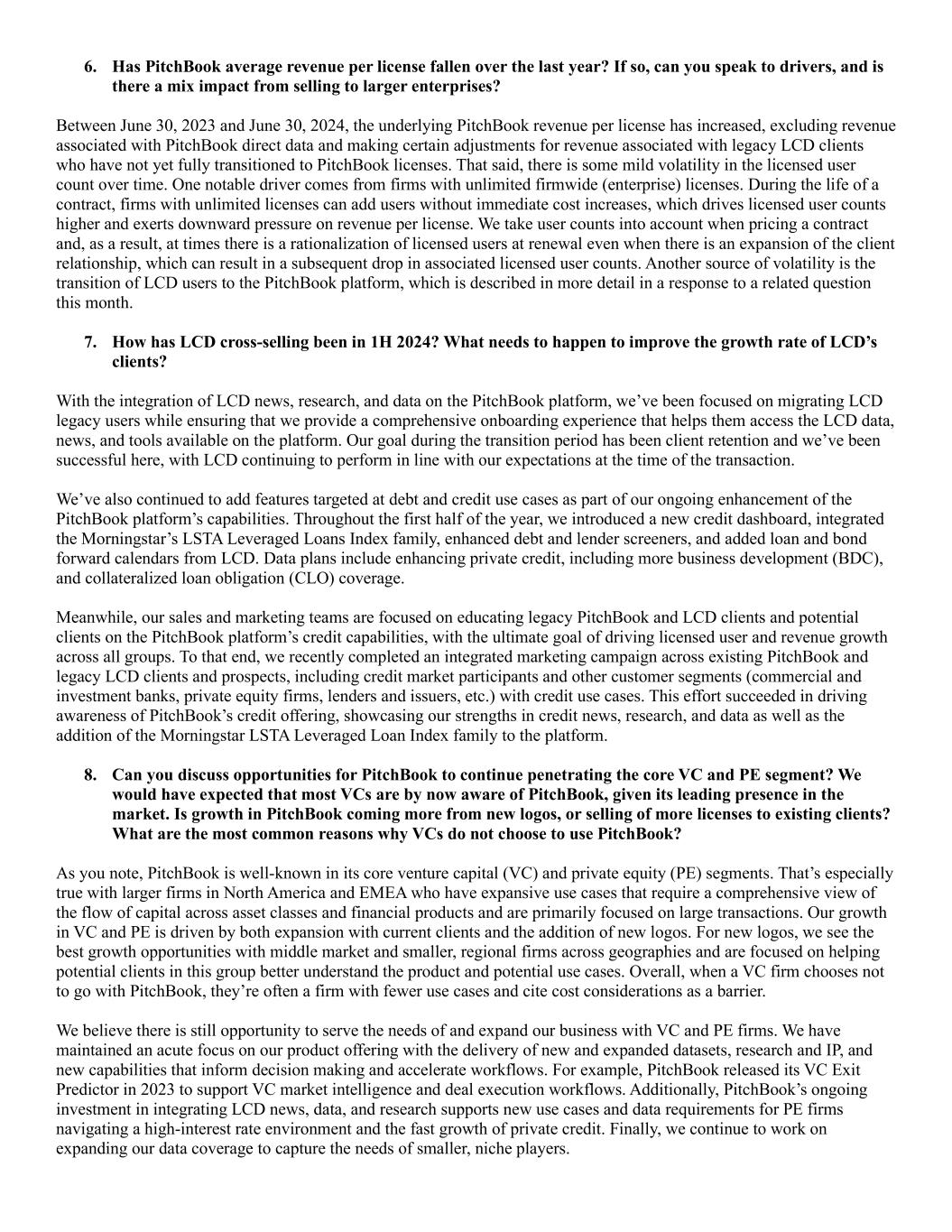 6. Has PitchBook average revenue per license fallen over the last year? If so, can you speak to drivers, and is there a mix impact from selling to larger enterprises? Between June 30, 2023 and June 30, 2024, the underlying PitchBook revenue per license has increased, excluding revenue associated with PitchBook direct data and making certain adjustments for revenue associated with legacy LCD clients who have not yet fully transitioned to PitchBook licenses. That said, there is some mild volatility in the licensed user count over time. One notable driver comes from firms with unlimited firmwide (enterprise) licenses. During the life of a contract, firms with unlimited licenses can add users without immediate cost increases, which drives licensed user counts higher and exerts downward pressure on revenue per license. We take user counts into account when pricing a contract and, as a result, at times there is a rationalization of licensed users at renewal even when there is an expansion of the client relationship, which can result in a subsequent drop in associated licensed user counts. Another source of volatility is the transition of LCD users to the PitchBook platform, which is described in more detail in a response to a related question this month. 7. How has LCD cross-selling been in 1H 2024? What needs to happen to improve the growth rate of LCD’s clients? With the integration of LCD news, research, and data on the PitchBook platform, we’ve been focused on migrating LCD legacy users while ensuring that we provide a comprehensive onboarding experience that helps them access the LCD data, news, and tools available on the platform. Our goal during the transition period has been client retention and we’ve been successful here, with LCD continuing to perform in line with our expectations at the time of the transaction. We’ve also continued to add features targeted at debt and credit use cases as part of our ongoing enhancement of the PitchBook platform’s capabilities. Throughout the first half of the year, we introduced a new credit dashboard, integrated the Morningstar’s LSTA Leveraged Loans Index family, enhanced debt and lender screeners, and added loan and bond forward calendars from LCD. Data plans include enhancing private credit, including more business development (BDC), and collateralized loan obligation (CLO) coverage. Meanwhile, our sales and marketing teams are focused on educating legacy PitchBook and LCD clients and potential clients on the PitchBook platform’s credit capabilities, with the ultimate goal of driving licensed user and revenue growth across all groups. To that end, we recently completed an integrated marketing campaign across existing PitchBook and legacy LCD clients and prospects, including credit market participants and other customer segments (commercial and investment banks, private equity firms, lenders and issuers, etc.) with credit use cases. This effort succeeded in driving awareness of PitchBook’s credit offering, showcasing our strengths in credit news, research, and data as well as the addition of the Morningstar LSTA Leveraged Loan Index family to the platform. 8. Can you discuss opportunities for PitchBook to continue penetrating the core VC and PE segment? We would have expected that most VCs are by now aware of PitchBook, given its leading presence in the market. Is growth in PitchBook coming more from new logos, or selling of more licenses to existing clients? What are the most common reasons why VCs do not choose to use PitchBook? As you note, PitchBook is well-known in its core venture capital (VC) and private equity (PE) segments. That’s especially true with larger firms in North America and EMEA who have expansive use cases that require a comprehensive view of the flow of capital across asset classes and financial products and are primarily focused on large transactions. Our growth in VC and PE is driven by both expansion with current clients and the addition of new logos. For new logos, we see the best growth opportunities with middle market and smaller, regional firms across geographies and are focused on helping potential clients in this group better understand the product and potential use cases. Overall, when a VC firm chooses not to go with PitchBook, they’re often a firm with fewer use cases and cite cost considerations as a barrier. We believe there is still opportunity to serve the needs of and expand our business with VC and PE firms. We have maintained an acute focus on our product offering with the delivery of new and expanded datasets, research and IP, and new capabilities that inform decision making and accelerate workflows. For example, PitchBook released its VC Exit Predictor in 2023 to support VC market intelligence and deal execution workflows. Additionally, PitchBook’s ongoing investment in integrating LCD news, data, and research supports new use cases and data requirements for PE firms navigating a high-interest rate environment and the fast growth of private credit. Finally, we continue to work on expanding our data coverage to capture the needs of smaller, niche players.