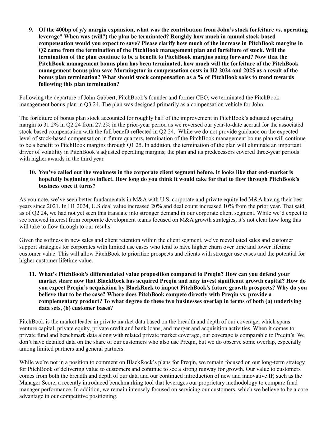 9. Of the 400bp of y/y margin expansion, what was the contribution from John’s stock forfeiture vs. operating leverage? When was (will?) the plan be terminated? Roughly how much in annual stock-based compensation would you expect to save? Please clarify how much of the increase in PitchBook margins in Q2 came from the termination of the PitchBook management plan and forfeiture of stock. Will the termination of the plan continue to be a benefit to PitchBook margins going forward? Now that the PitchBook management bonus plan has been terminated, how much will the forfeiture of the PitchBook management bonus plan save Morningstar in compensation costs in H2 2024 and 2025 as a result of the bonus plan termination? What should stock compensation as a % of PitchBook sales to trend towards following this plan termination? Following the departure of John Gabbert, PitchBook’s founder and former CEO, we terminated the PitchBook management bonus plan in Q3 24. The plan was designed primarily as a compensation vehicle for John. The forfeiture of bonus plan stock accounted for roughly half of the improvement in PitchBook’s adjusted operating margin to 31.2% in Q2 24 from 27.2% in the prior-year period as we reversed our year-to-date accrual for the associated stock-based compensation with the full benefit reflected in Q2 24. While we do not provide guidance on the expected level of stock-based compensation in future quarters, termination of the PitchBook management bonus plan will continue to be a benefit to PitchBook margins through Q1 25. In addition, the termination of the plan will eliminate an important driver of volatility in PitchBook’s adjusted operating margins; the plan and its predecessors covered three-year periods with higher awards in the third year. 10. You’ve called out the weakness in the corporate client segment before. It looks like that end-market is hopefully beginning to inflect. How long do you think it would take for that to flow through PitchBook’s business once it turns? As you note, we’ve seen better fundamentals in M&A with U.S. corporate and private equity led M&A having their best years since 2021. In H1 2024, U.S deal value increased 20% and deal count increased 10% from the prior year. That said, as of Q2 24, we had not yet seen this translate into stronger demand in our corporate client segment. While we’d expect to see renewed interest from corporate development teams focused on M&A growth strategies, it’s not clear how long this will take to flow through to our results. Given the softness in new sales and client retention within the client segment, we’ve reevaluated sales and customer support strategies for corporates with limited use cases who tend to have higher churn over time and lower lifetime customer value. This will allow PitchBook to prioritize prospects and clients with stronger use cases and the potential for higher customer lifetime value. 11. What’s PitchBook’s differentiated value proposition compared to Preqin? How can you defend your market share now that BlackRock has acquired Preqin and may invest significant growth capital? How do you expect Preqin’s acquisition by BlackRock to impact PitchBook’s future growth prospects? Why do you believe that to be the case? Where does PitchBook compete directly with Preqin vs. provide a complementary product? To what degree do these two businesses overlap in terms of both (a) underlying data sets, (b) customer bases? PitchBook is the market leader in private market data based on the breadth and depth of our coverage, which spans venture capital, private equity, private credit and bank loans, and merger and acquisition activities. When it comes to private fund and benchmark data along with related private market coverage, our coverage is comparable to Preqin’s. We don’t have detailed data on the share of our customers who also use Preqin, but we do observe some overlap, especially among limited partners and general partners. While we’re not in a position to comment on BlackRock’s plans for Preqin, we remain focused on our long-term strategy for PitchBook of delivering value to customers and continue to see a strong runway for growth. Our value to customers comes from both the breadth and depth of our data and our continued introduction of new and innovative IP, such as the Manager Score, a recently introduced benchmarking tool that leverages our proprietary methodology to compare fund manager performance. In addition, we remain intensely focused on servicing our customers, which we believe to be a core advantage in our competitive positioning.