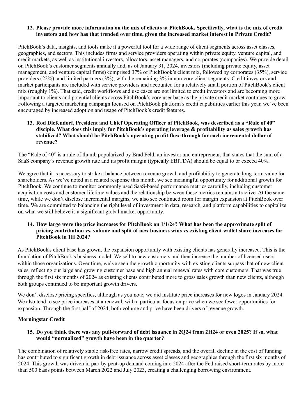 12. Please provide more information on the mix of clients at PitchBook. Specifically, what is the mix of credit investors and how has that trended over time, given the increased market interest in Private Credit? PitchBook’s data, insights, and tools make it a powerful tool for a wide range of client segments across asset classes, geographies, and sectors. This includes firms and service providers operating within private equity, venture capital, and credit markets, as well as institutional investors, allocators, asset managers, and corporates (companies). We provide detail on PitchBook’s customer segments annually and, as of January 31, 2024, investors (including private equity, asset management, and venture capital firms) comprised 37% of PitchBook’s client mix, followed by corporates (35%), service providers (22%), and limited partners (3%), with the remaining 3% in non-core client segments. Credit investors and market participants are included with service providers and accounted for a relatively small portion of PitchBook’s client mix (roughly 1%). That said, credit workflows and use cases are not limited to credit investors and are becoming more important to clients and potential clients across PitchBook’s core user base as the private credit market continues to grow. Following a targeted marketing campaign focused on PitchBook platform’s credit capabilities earlier this year, we’ve been encouraged by increased adoption and usage of PitchBook’s credit features. 13. Rod Diefendorf, President and Chief Operating Officer of PitchBook, was described as a “Rule of 40” disciple. What does this imply for PitchBook’s operating leverage & profitability as sales growth has stabilized? What should be PitchBook’s operating profit flow-through for each incremental dollar of revenue? The “Rule of 40” is a rule of thumb popularized by Brad Feld, an investor and entrepreneur, that states that the sum of a SaaS company’s revenue growth rate and its profit margin (typically EBITDA) should be equal to or exceed 40%. We agree that it is necessary to strike a balance between revenue growth and profitability to generate long-term value for shareholders. As we’ve noted in a related response this month, we see meaningful opportunity for additional growth for PitchBook. We continue to monitor commonly used SaaS-based performance metrics carefully, including customer acquisition costs and customer lifetime values and the relationship between these metrics remains attractive. At the same time, while we don’t disclose incremental margins, we also see continued room for margin expansion at PitchBook over time. We are committed to balancing the right level of investment in data, research, and platform capabilities to capitalize on what we still believe is a significant global market opportunity. 14. How large were the price increases for PitchBook on 1/1/24? What has been the approximate split of pricing contribution vs. volume and split of new business wins vs existing client wallet share increases for PitchBook in 1H 2024? As PitchBook's client base has grown, the expansion opportunity with existing clients has generally increased. This is the foundation of PitchBook’s business model: We sell to new customers and then increase the number of licensed users within those organizations. Over time, we’ve seen the growth opportunity with existing clients surpass that of new client sales, reflecting our large and growing customer base and high annual renewal rates with core customers. That was true through the first six months of 2024 as existing clients contributed more to gross sales growth than new clients, although both groups continued to be important growth drivers. We don’t disclose pricing specifics, although as you note, we did institute price increases for new logos in January 2024. We also tend to see price increases at a renewal, with a particular focus on price when we see fewer opportunities for expansion. Through the first half of 2024, both volume and price have been drivers of revenue growth. Morningstar Credit 15. Do you think there was any pull-forward of debt issuance in 2Q24 from 2H24 or even 2025? If so, what would “normalized” growth have been in the quarter? The combination of relatively stable risk-free rates, narrow credit spreads, and the overall decline in the cost of funding has contributed to significant growth in debt issuance across asset classes and geographies through the first six months of 2024. This growth was driven in part by pent-up demand coming into 2024 after the Fed raised short-term rates by more than 500 basis points between March 2022 and July 2023, creating a challenging borrowing environment.
