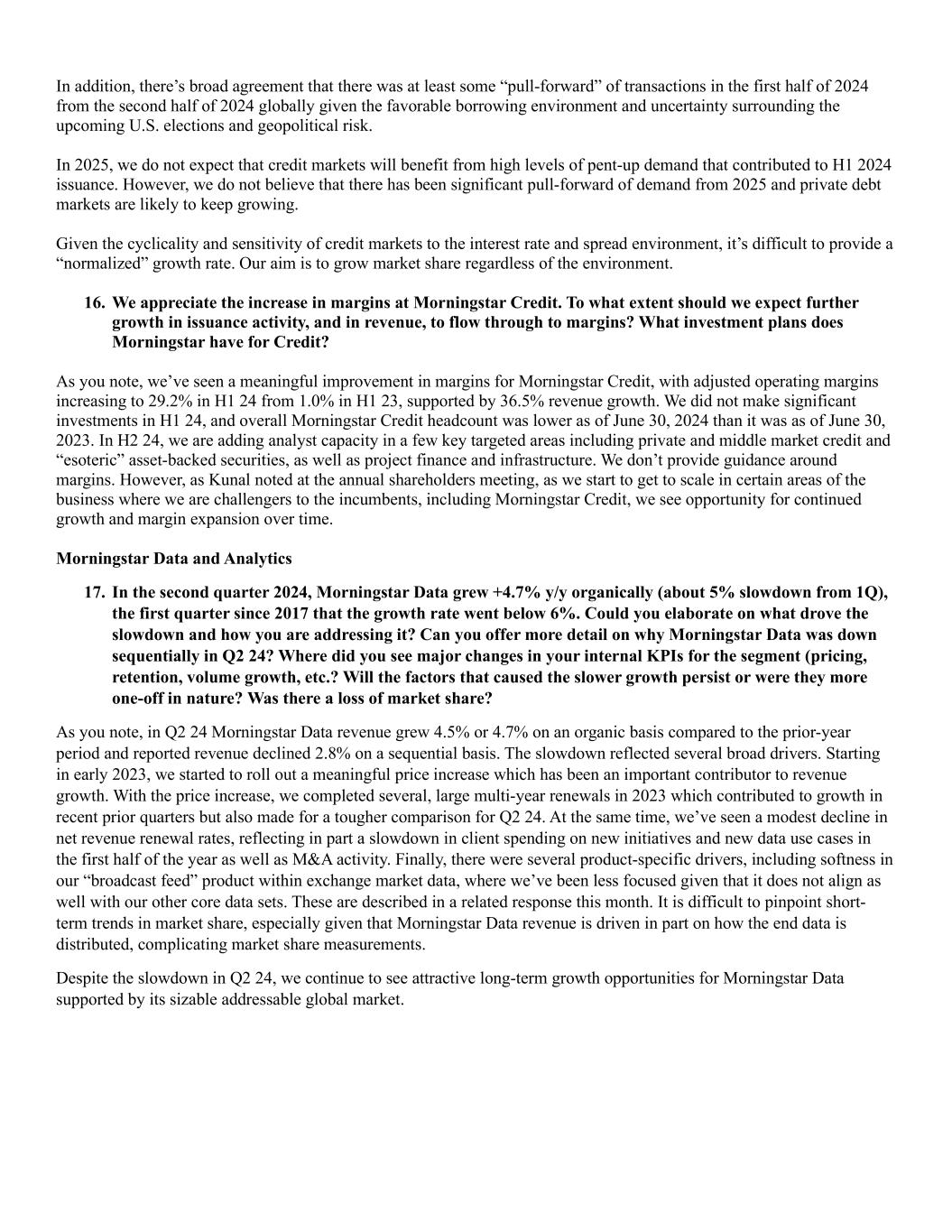 In addition, there’s broad agreement that there was at least some “pull-forward” of transactions in the first half of 2024 from the second half of 2024 globally given the favorable borrowing environment and uncertainty surrounding the upcoming U.S. elections and geopolitical risk. In 2025, we do not expect that credit markets will benefit from high levels of pent-up demand that contributed to H1 2024 issuance. However, we do not believe that there has been significant pull-forward of demand from 2025 and private debt markets are likely to keep growing. Given the cyclicality and sensitivity of credit markets to the interest rate and spread environment, it’s difficult to provide a “normalized” growth rate. Our aim is to grow market share regardless of the environment. 16. We appreciate the increase in margins at Morningstar Credit. To what extent should we expect further growth in issuance activity, and in revenue, to flow through to margins? What investment plans does Morningstar have for Credit? As you note, we’ve seen a meaningful improvement in margins for Morningstar Credit, with adjusted operating margins increasing to 29.2% in H1 24 from 1.0% in H1 23, supported by 36.5% revenue growth. We did not make significant investments in H1 24, and overall Morningstar Credit headcount was lower as of June 30, 2024 than it was as of June 30, 2023. In H2 24, we are adding analyst capacity in a few key targeted areas including private and middle market credit and “esoteric” asset-backed securities, as well as project finance and infrastructure. We don’t provide guidance around margins. However, as Kunal noted at the annual shareholders meeting, as we start to get to scale in certain areas of the business where we are challengers to the incumbents, including Morningstar Credit, we see opportunity for continued growth and margin expansion over time. Morningstar Data and Analytics 17. In the second quarter 2024, Morningstar Data grew +4.7% y/y organically (about 5% slowdown from 1Q), the first quarter since 2017 that the growth rate went below 6%. Could you elaborate on what drove the slowdown and how you are addressing it? Can you offer more detail on why Morningstar Data was down sequentially in Q2 24? Where did you see major changes in your internal KPIs for the segment (pricing, retention, volume growth, etc.? Will the factors that caused the slower growth persist or were they more one-off in nature? Was there a loss of market share? As you note, in Q2 24 Morningstar Data revenue grew 4.5% or 4.7% on an organic basis compared to the prior-year period and reported revenue declined 2.8% on a sequential basis. The slowdown reflected several broad drivers. Starting in early 2023, we started to roll out a meaningful price increase which has been an important contributor to revenue growth. With the price increase, we completed several, large multi-year renewals in 2023 which contributed to growth in recent prior quarters but also made for a tougher comparison for Q2 24. At the same time, we’ve seen a modest decline in net revenue renewal rates, reflecting in part a slowdown in client spending on new initiatives and new data use cases in the first half of the year as well as M&A activity. Finally, there were several product-specific drivers, including softness in our “broadcast feed” product within exchange market data, where we’ve been less focused given that it does not align as well with our other core data sets. These are described in a related response this month. It is difficult to pinpoint short- term trends in market share, especially given that Morningstar Data revenue is driven in part on how the end data is distributed, complicating market share measurements. Despite the slowdown in Q2 24, we continue to see attractive long-term growth opportunities for Morningstar Data supported by its sizable addressable global market.